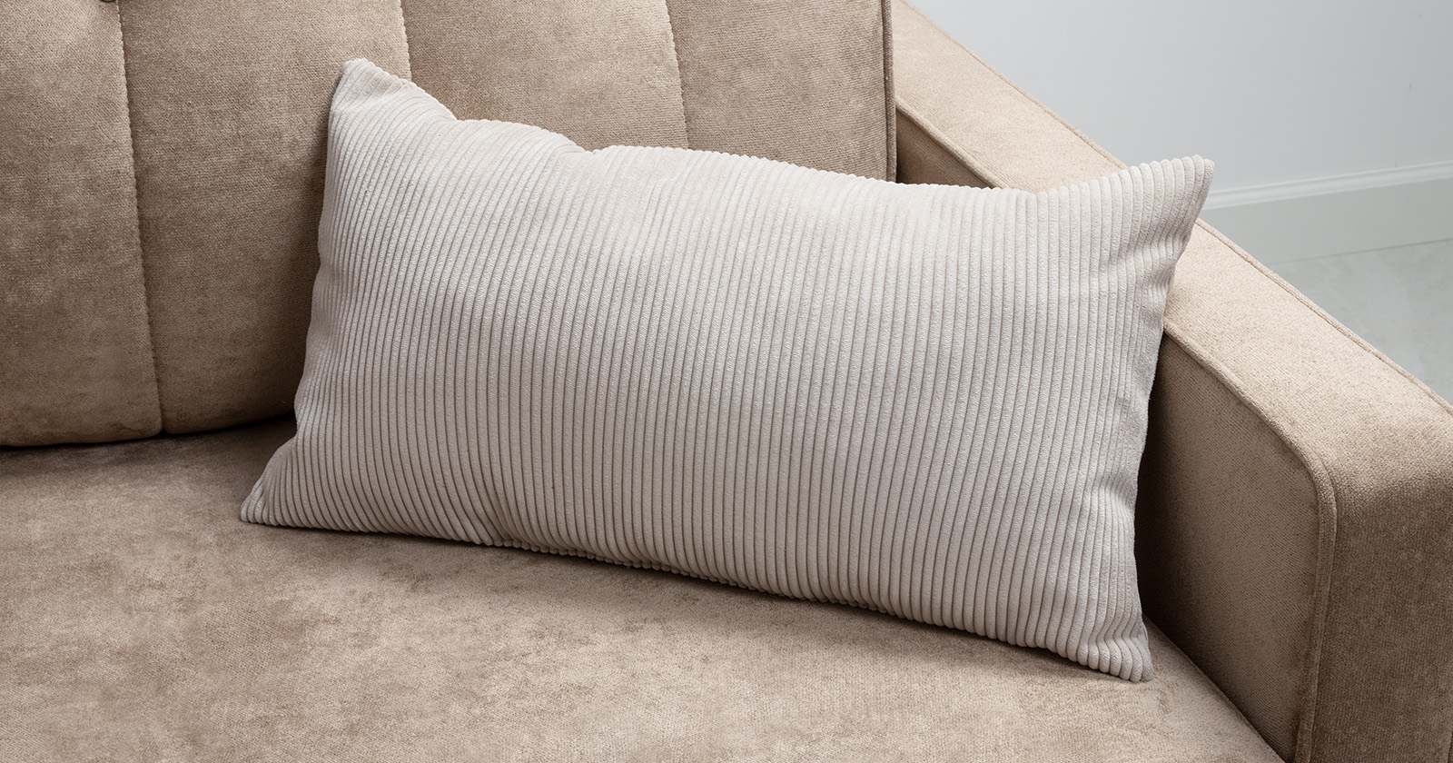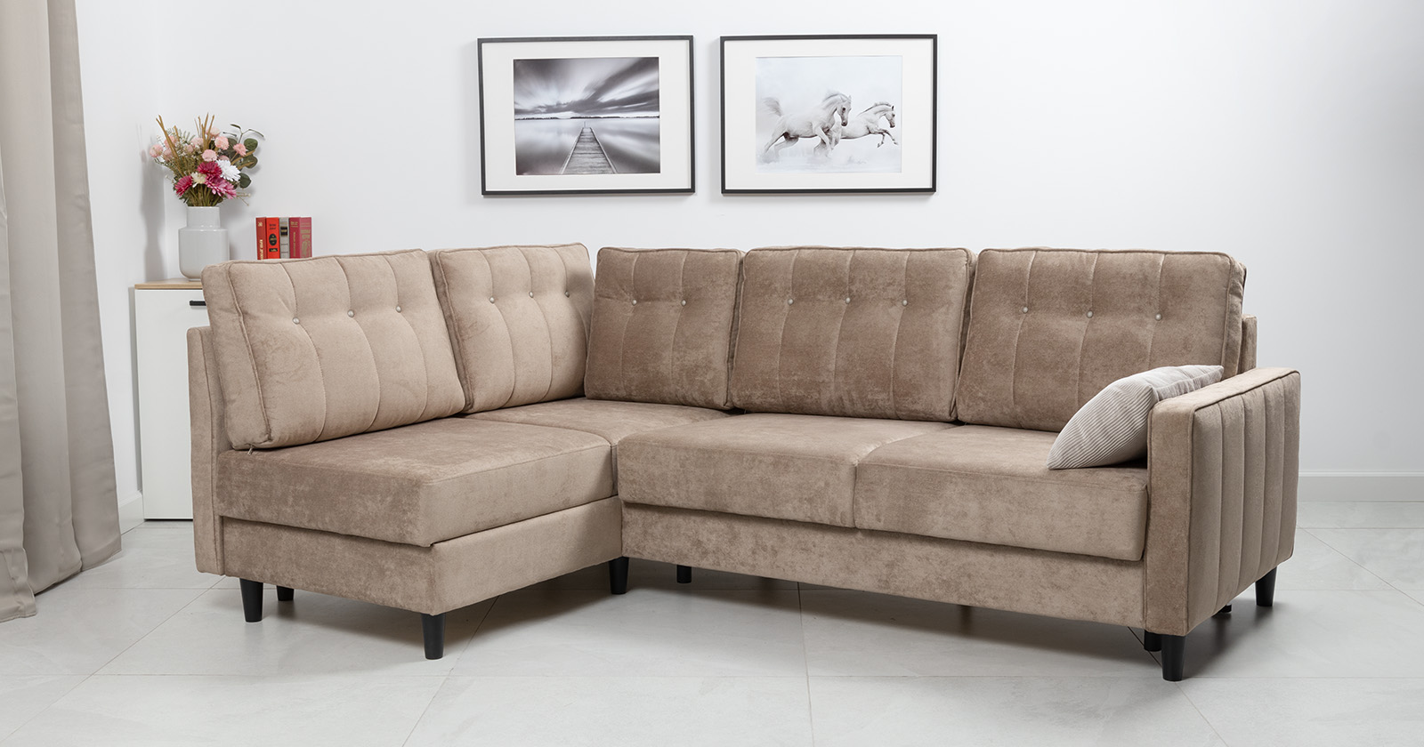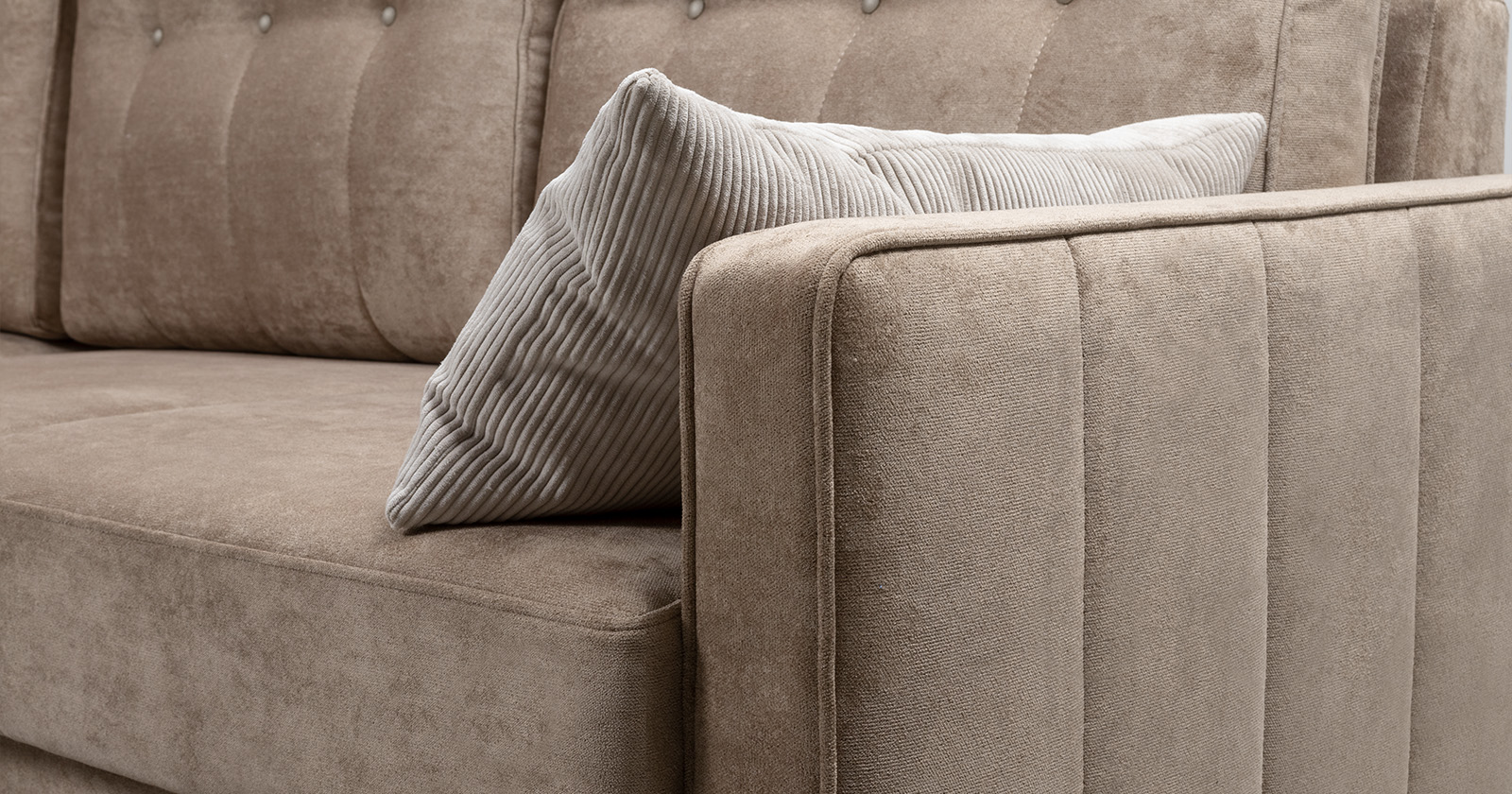 Диван-кровать угловой Арно ТД 565 велюр Лаки 04 песочный, Vertical 910 молочно-серый, сборка на любую сторону