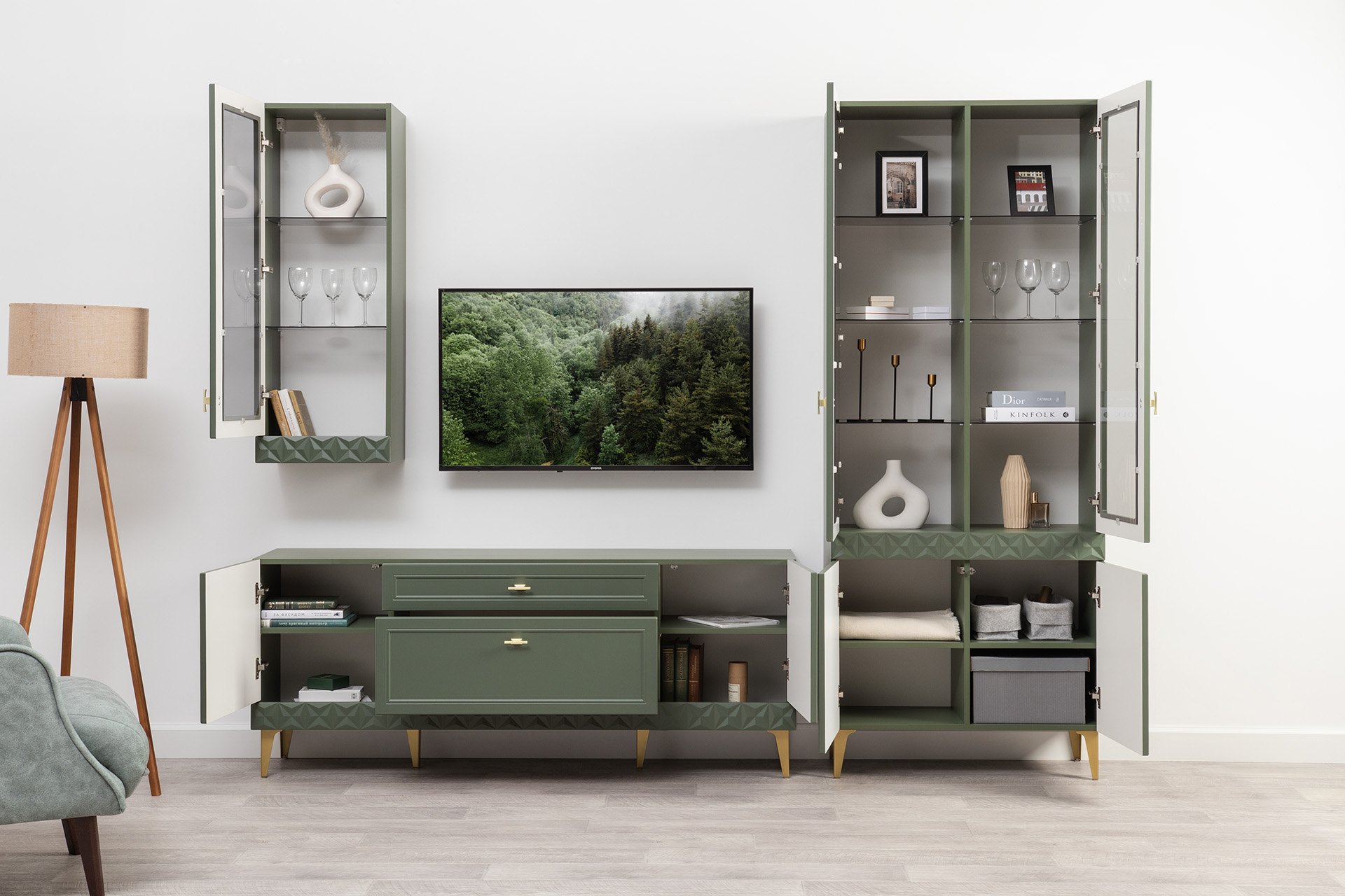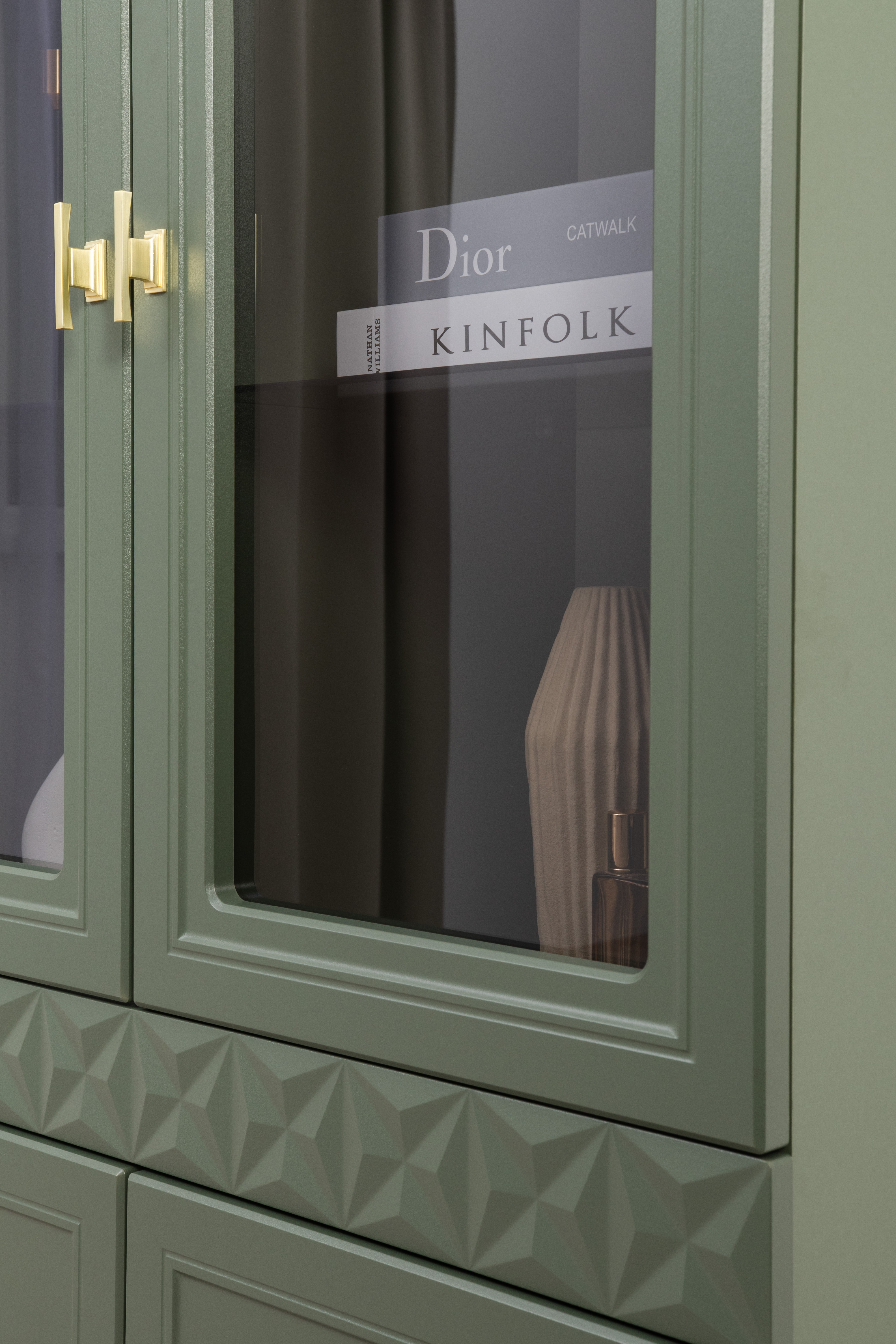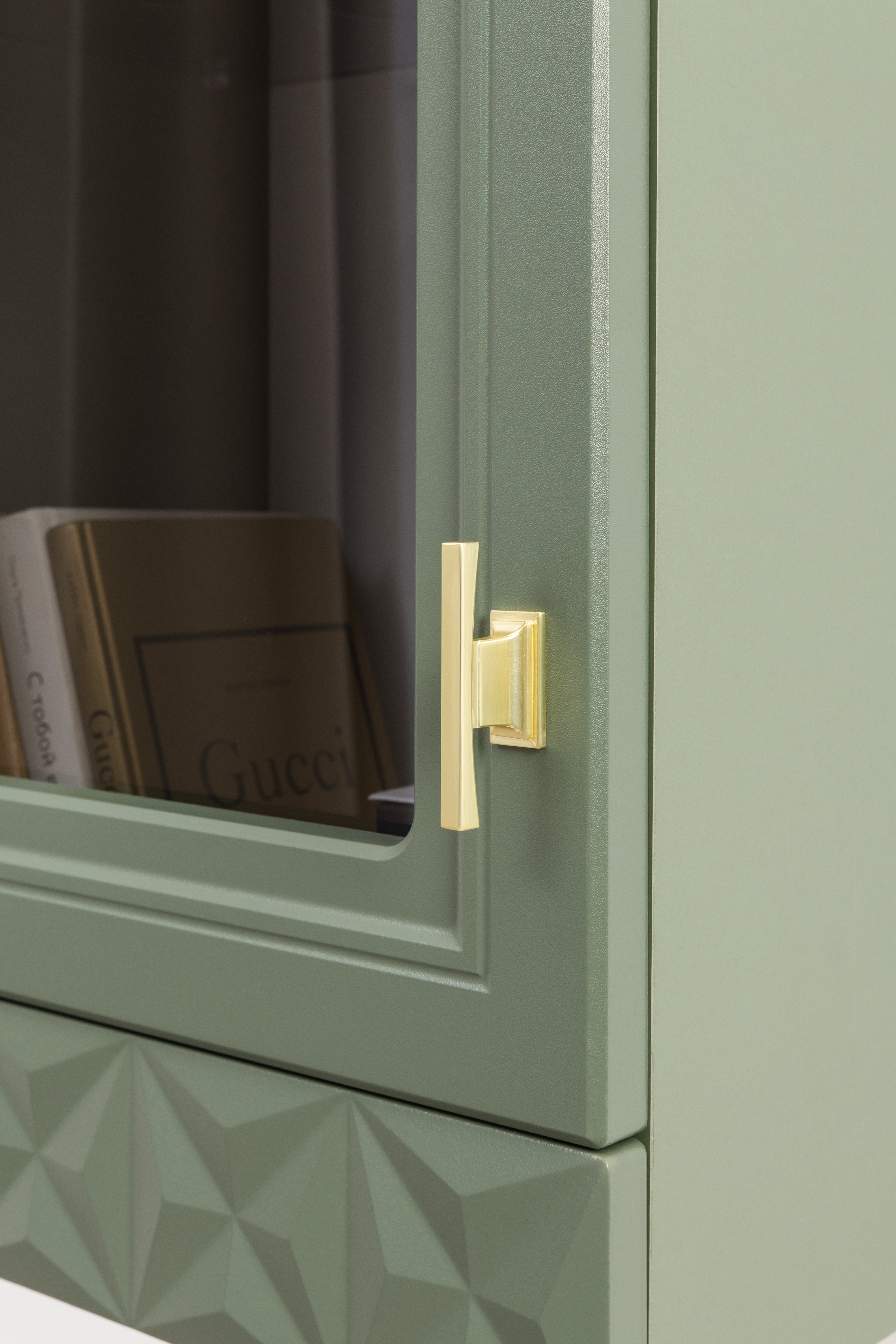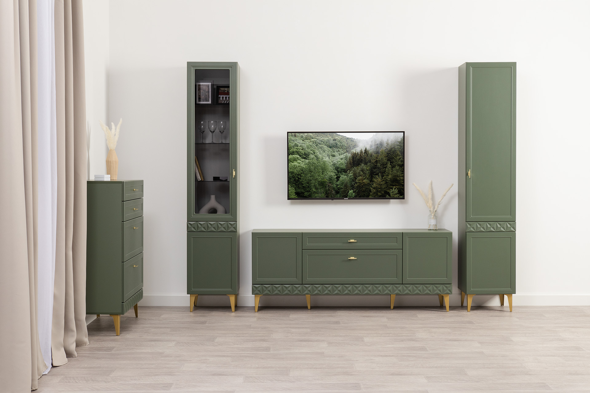 Изящные линии, глубокая фрезеровка фасадов из МДФ и благородные оттенки. Утончённая «Слоновая кость» и изысканная «Олива Шагрень» с глубоким зелёным тоном — создают атмосферу уюта, тепла и благородства. Металлические ручки и опоры золотого цвета придают мебели утончённый блеск, а петли и направляющие с доводчиками обеспечивают плавное и бесшумное закрытие фасадов.