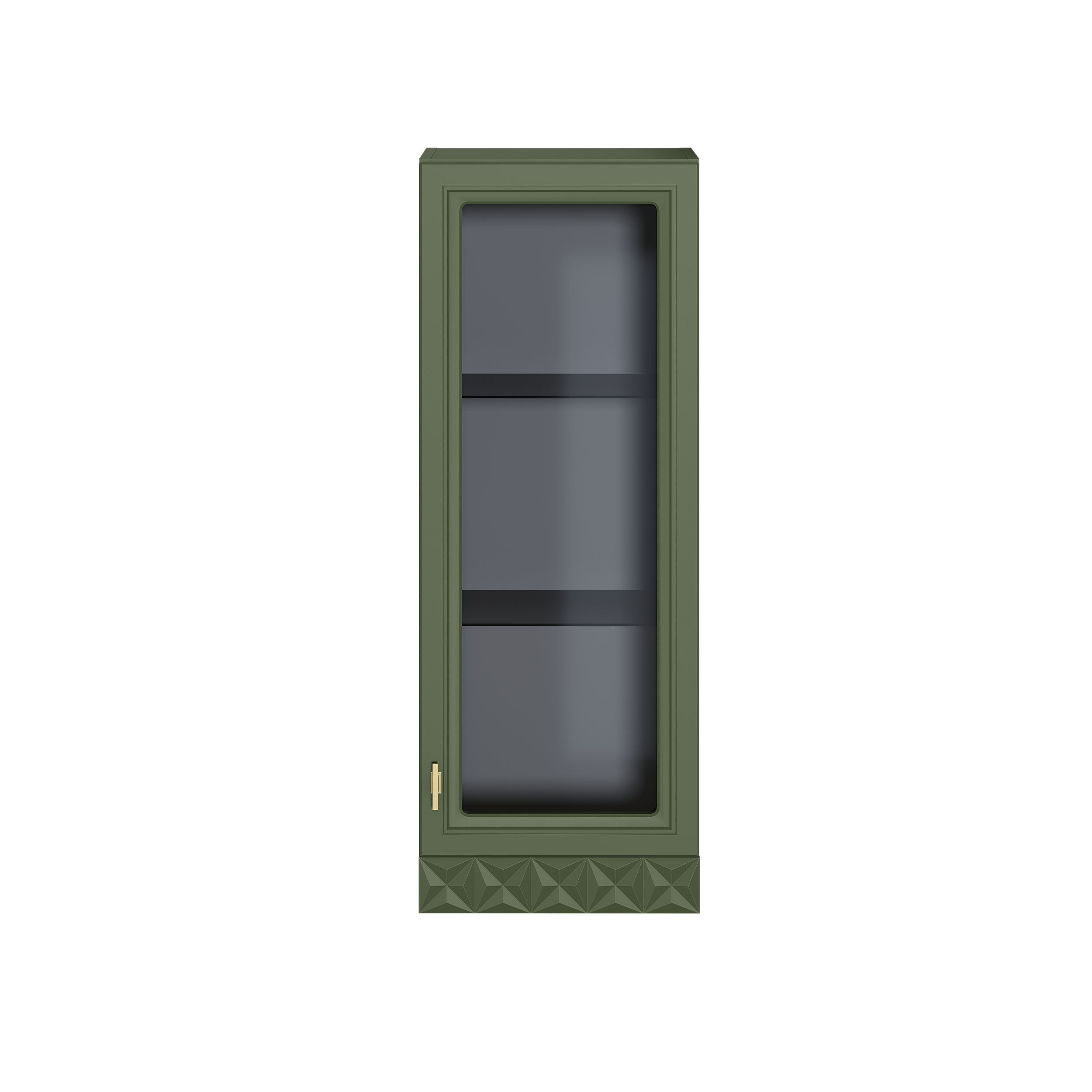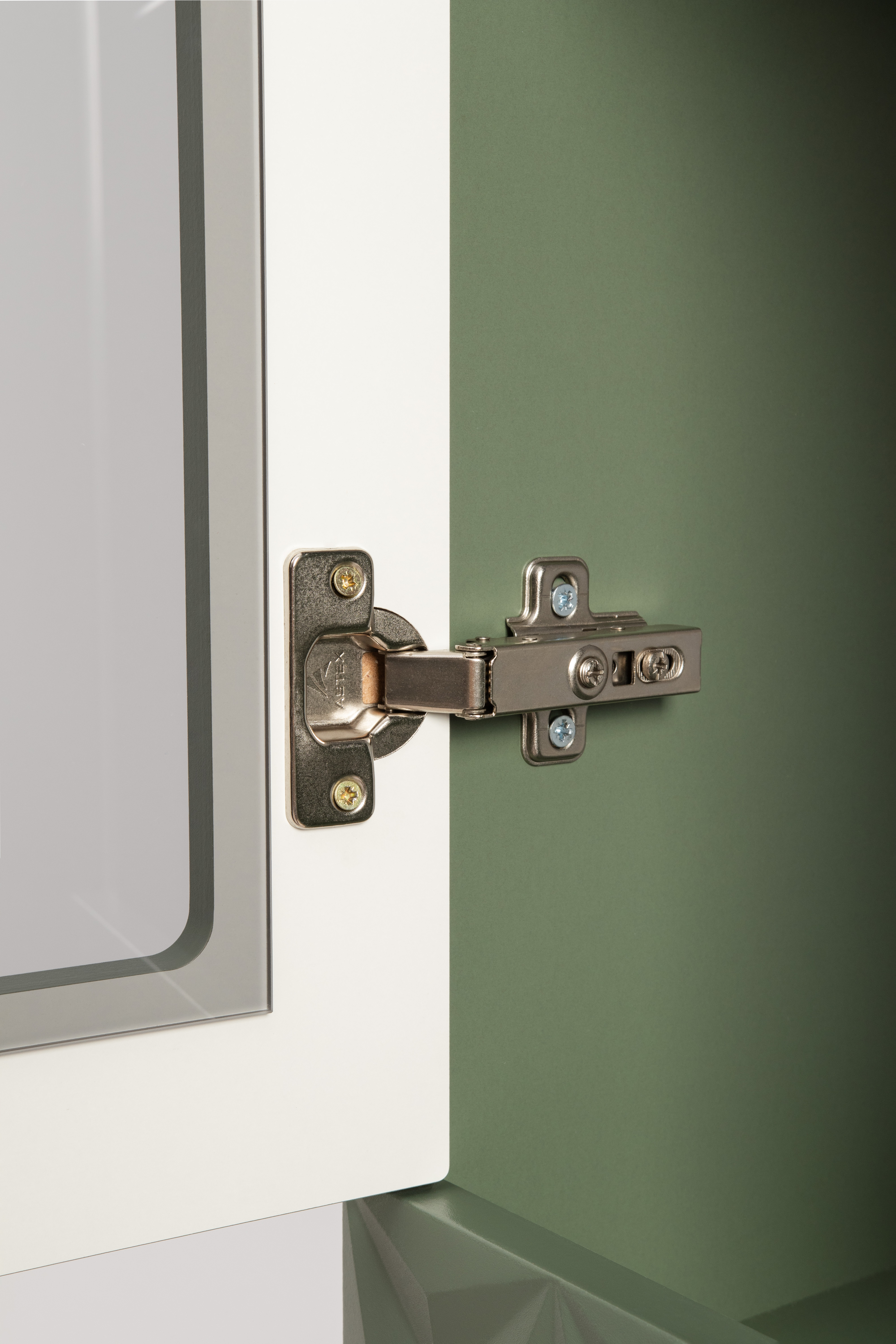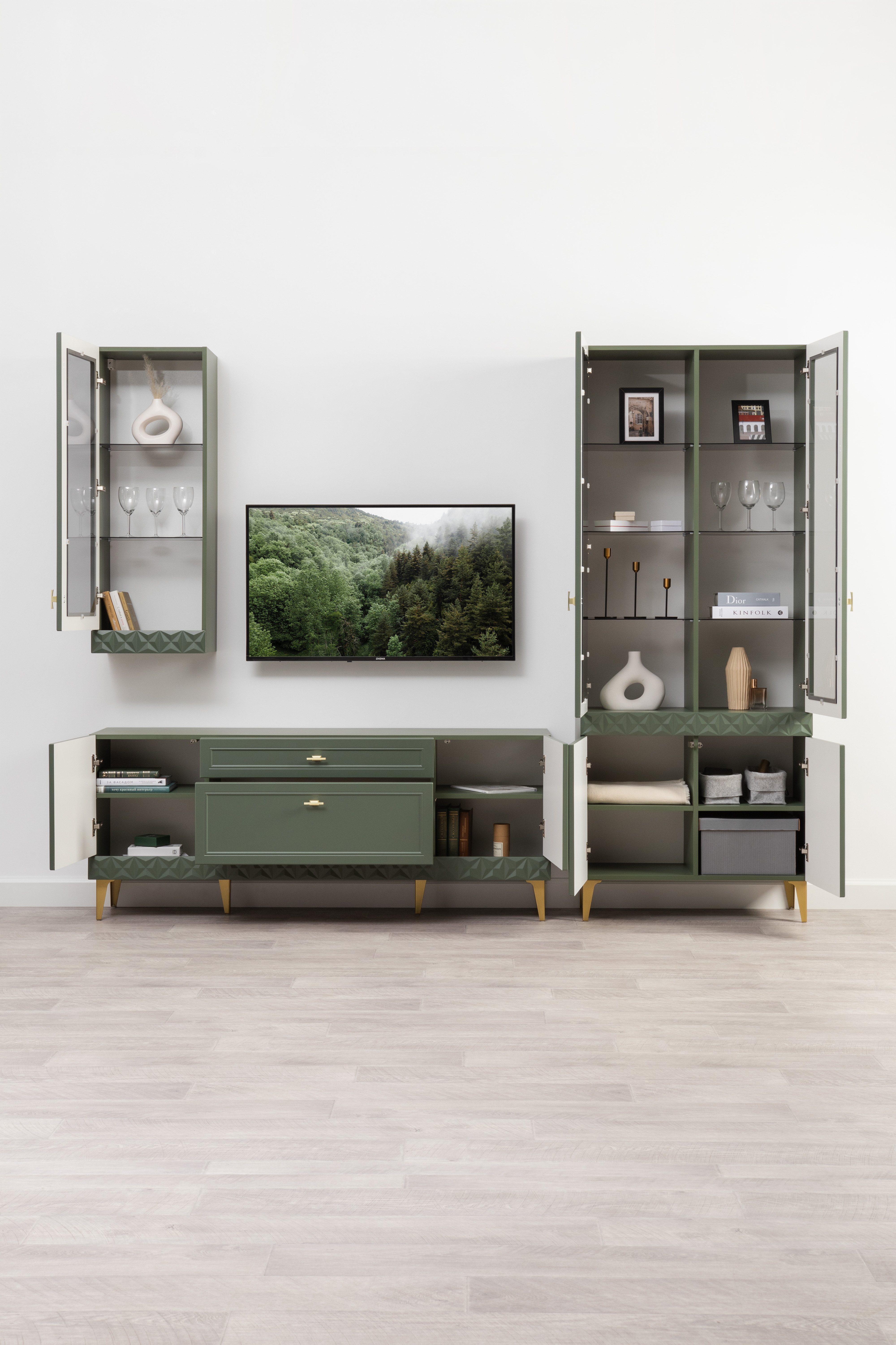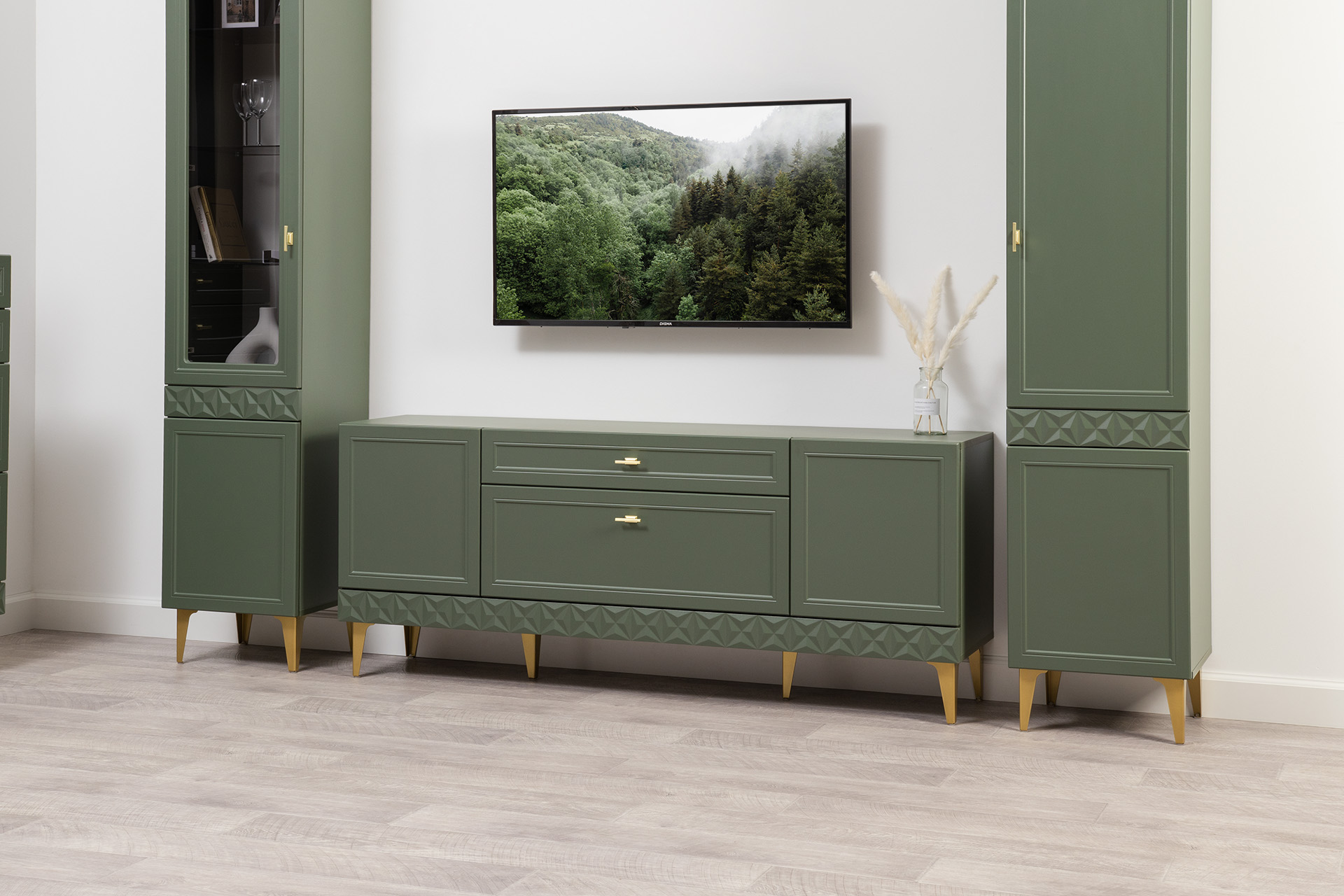 Изящные линии, глубокая фрезеровка фасадов из МДФ и благородные оттенки. Утончённая «Слоновая кость» и изысканная «Олива Шагрень» с глубоким зелёным тоном — создают атмосферу уюта, тепла и благородства. Металлические ручки и опоры золотого цвета придают мебели утончённый блеск, а петли и направляющие с доводчиками обеспечивают плавное и бесшумное закрытие фасадов.