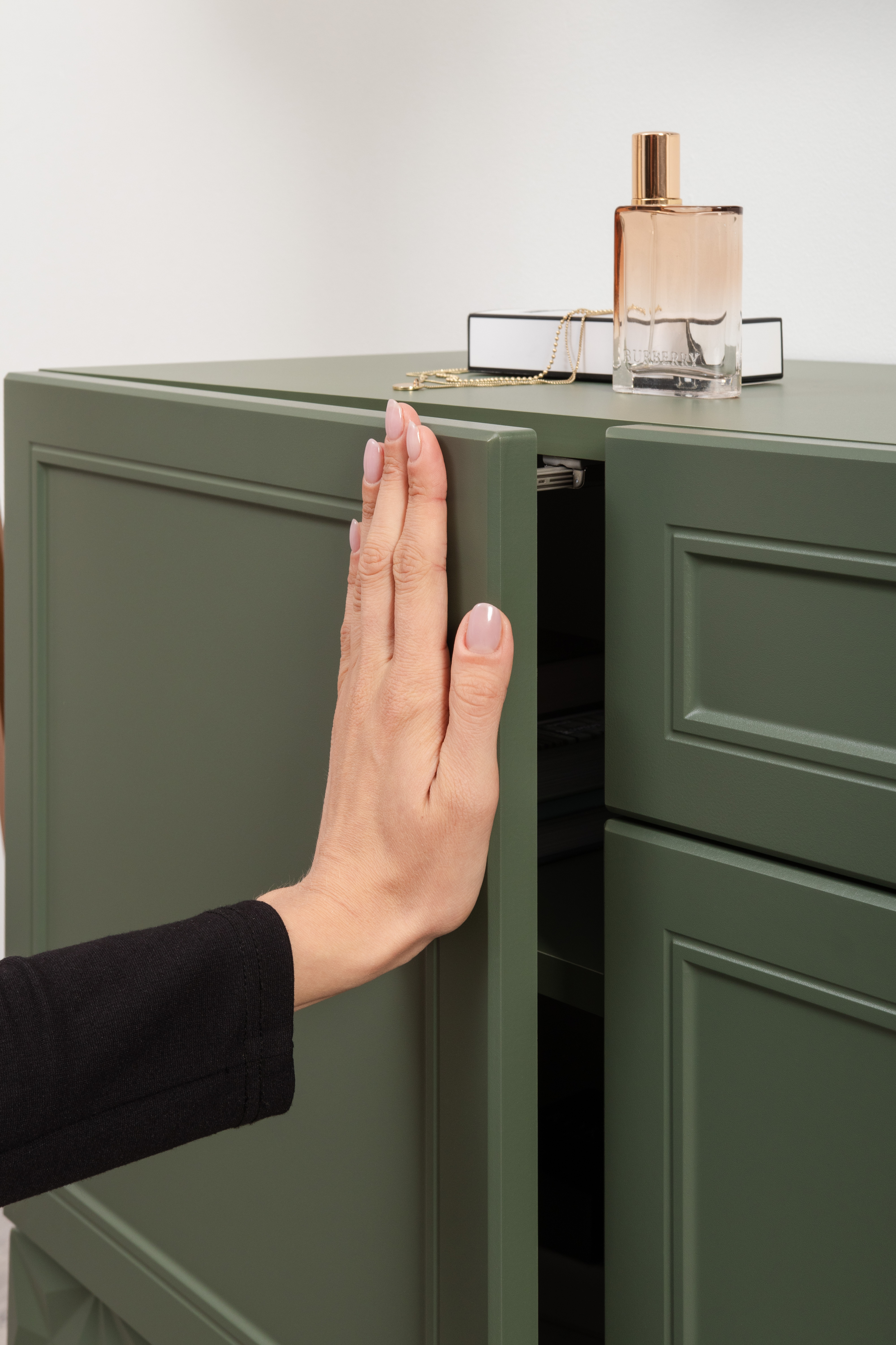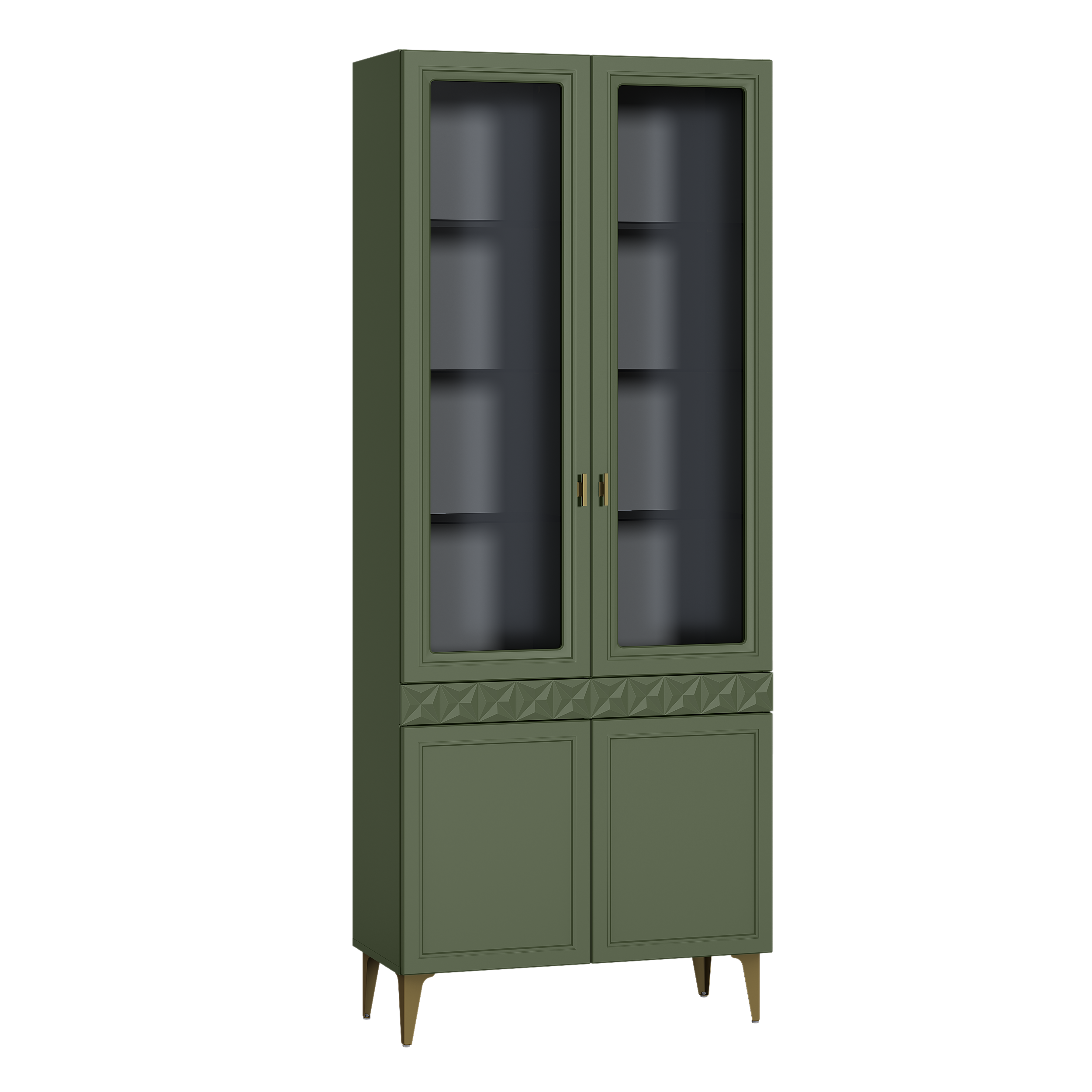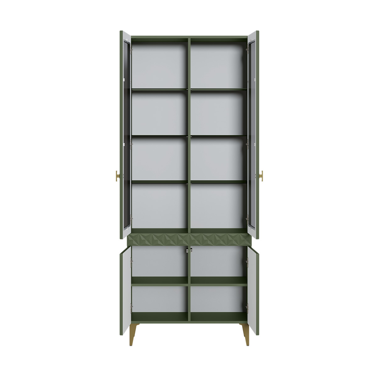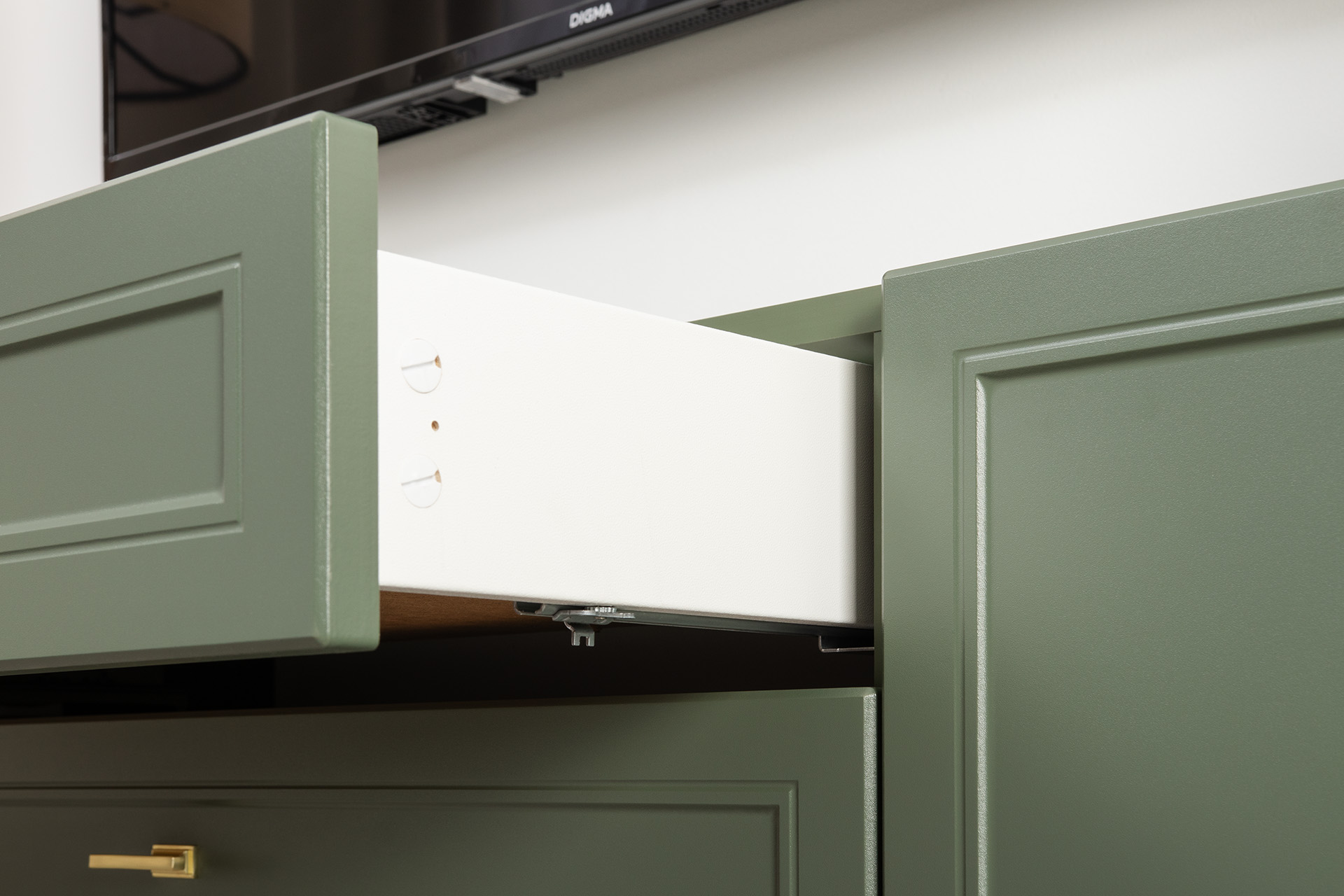 Изящные линии, глубокая фрезеровка фасадов из МДФ и благородные оттенки. Утончённая «Слоновая кость» и изысканная «Олива Шагрень» с глубоким зелёным тоном — создают атмосферу уюта, тепла и благородства. Металлические ручки и опоры золотого цвета придают мебели утончённый блеск, а петли и направляющие с доводчиками обеспечивают плавное и бесшумное закрытие фасадов.