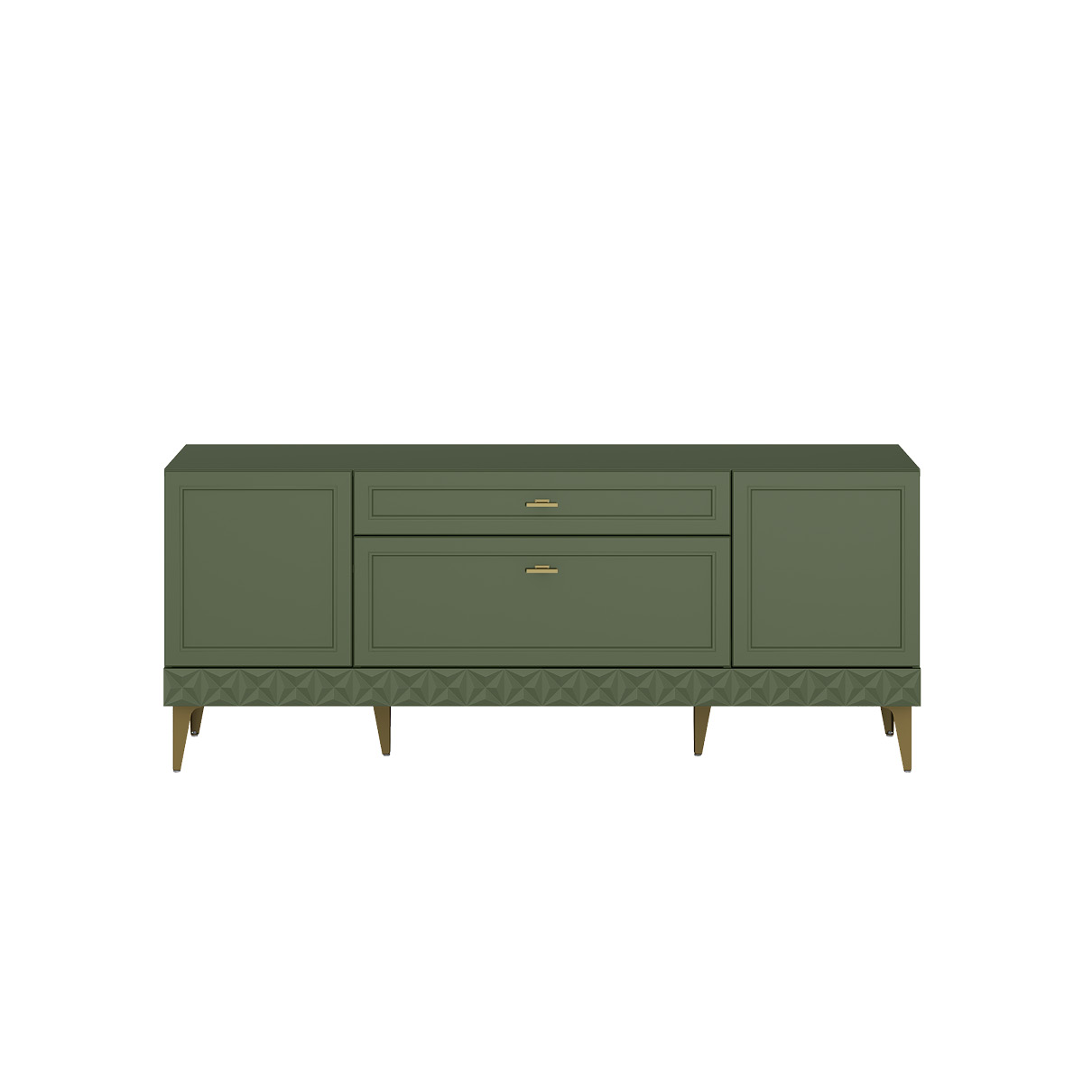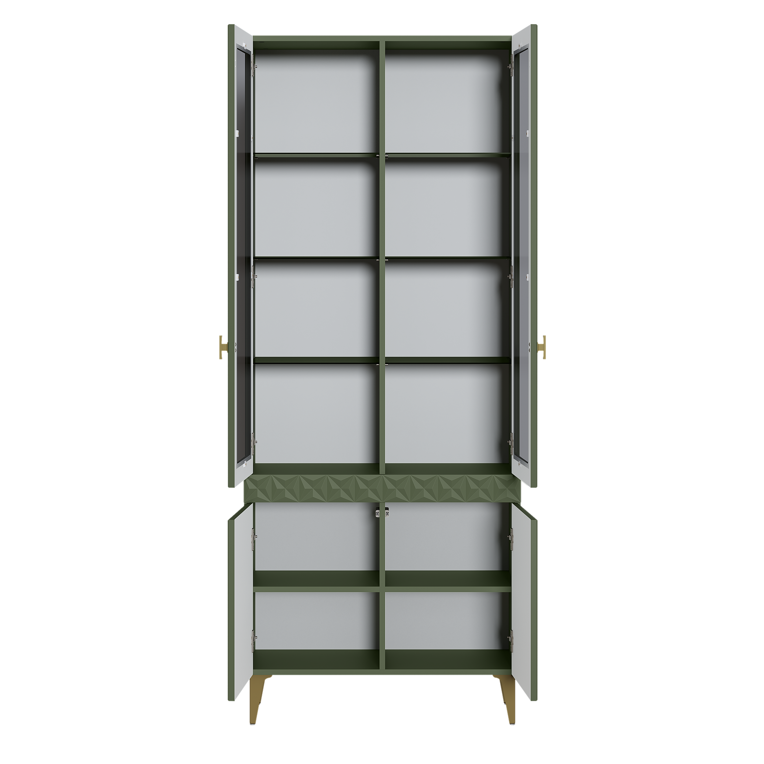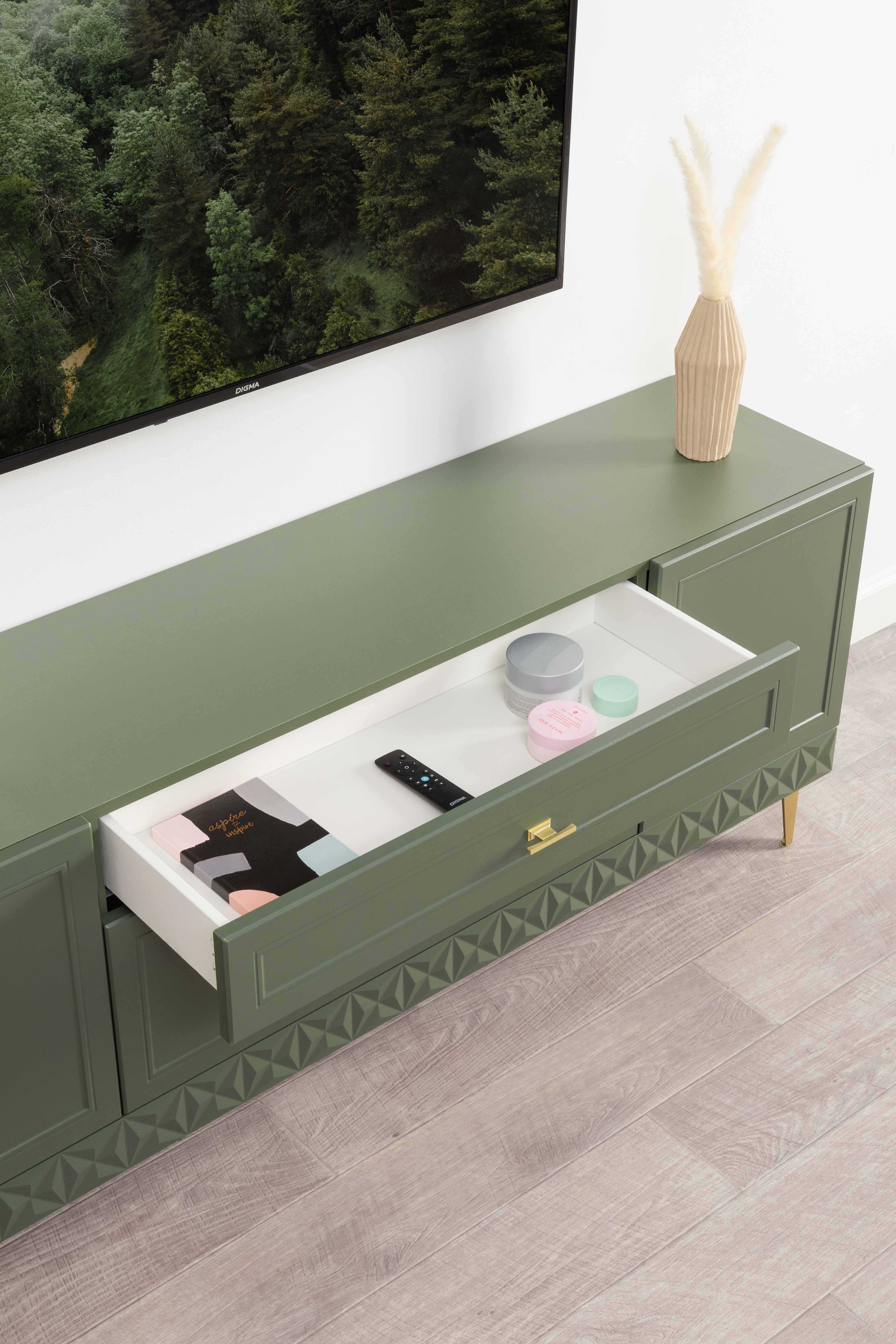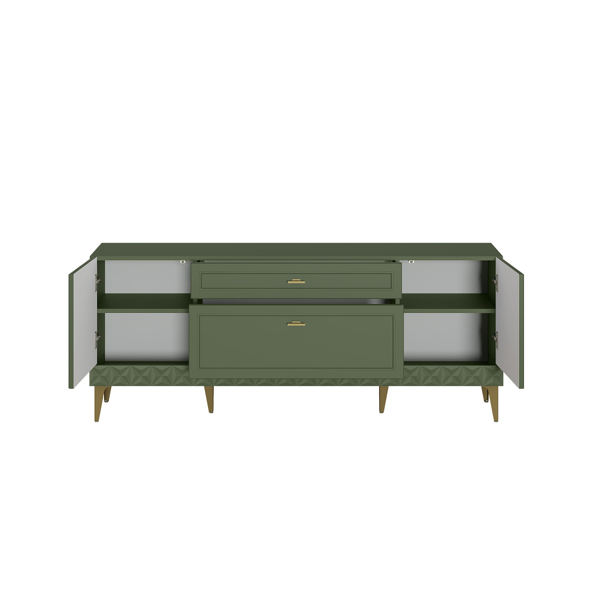 Изящные линии, глубокая фрезеровка фасадов из МДФ и благородные оттенки. Утончённая «Слоновая кость» и изысканная «Олива Шагрень» с глубоким зелёным тоном — создают атмосферу уюта, тепла и благородства. Металлические ручки и опоры золотого цвета придают мебели утончённый блеск, а петли и направляющие с доводчиками обеспечивают плавное и бесшумное закрытие фасадов.