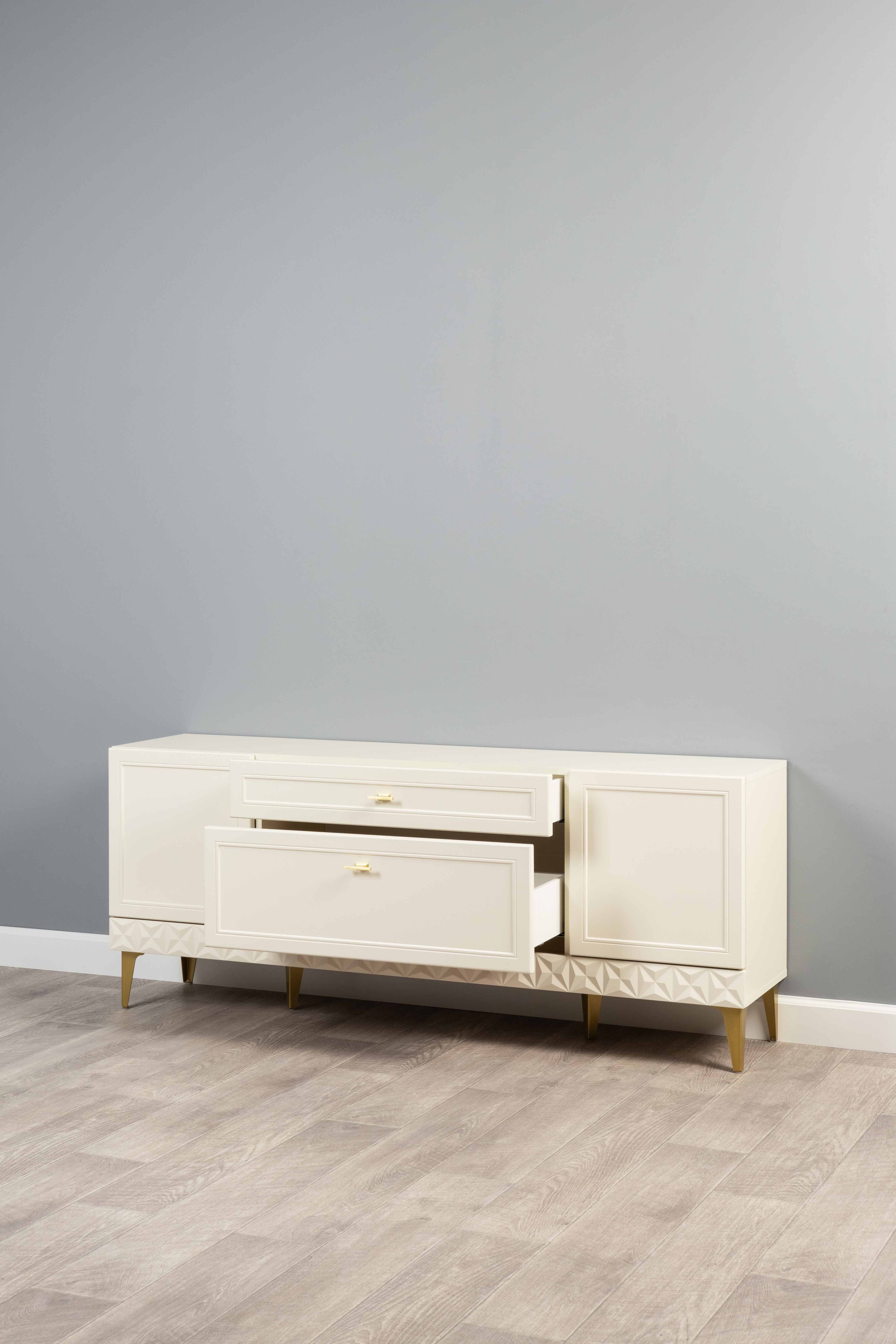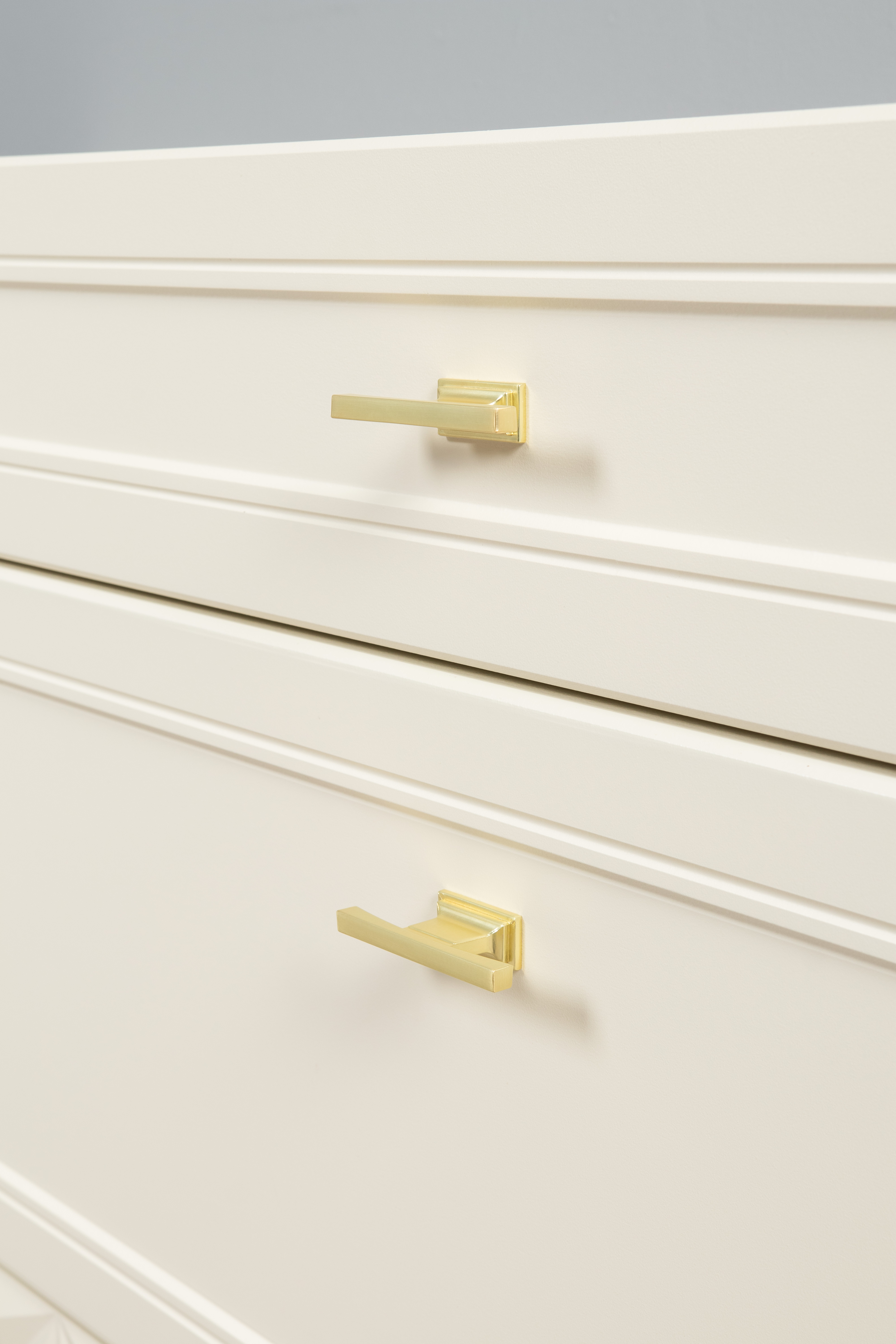 Изящные линии, глубокая фрезеровка фасадов из МДФ и благородные оттенки. Утончённая «Слоновая кость» и изысканная «Олива Шагрень» с глубоким зелёным тоном — создают атмосферу уюта, тепла и благородства. Металлические ручки и опоры золотого цвета придают мебели утончённый блеск, а петли и направляющие с доводчиками обеспечивают плавное и бесшумное закрытие фасадов.