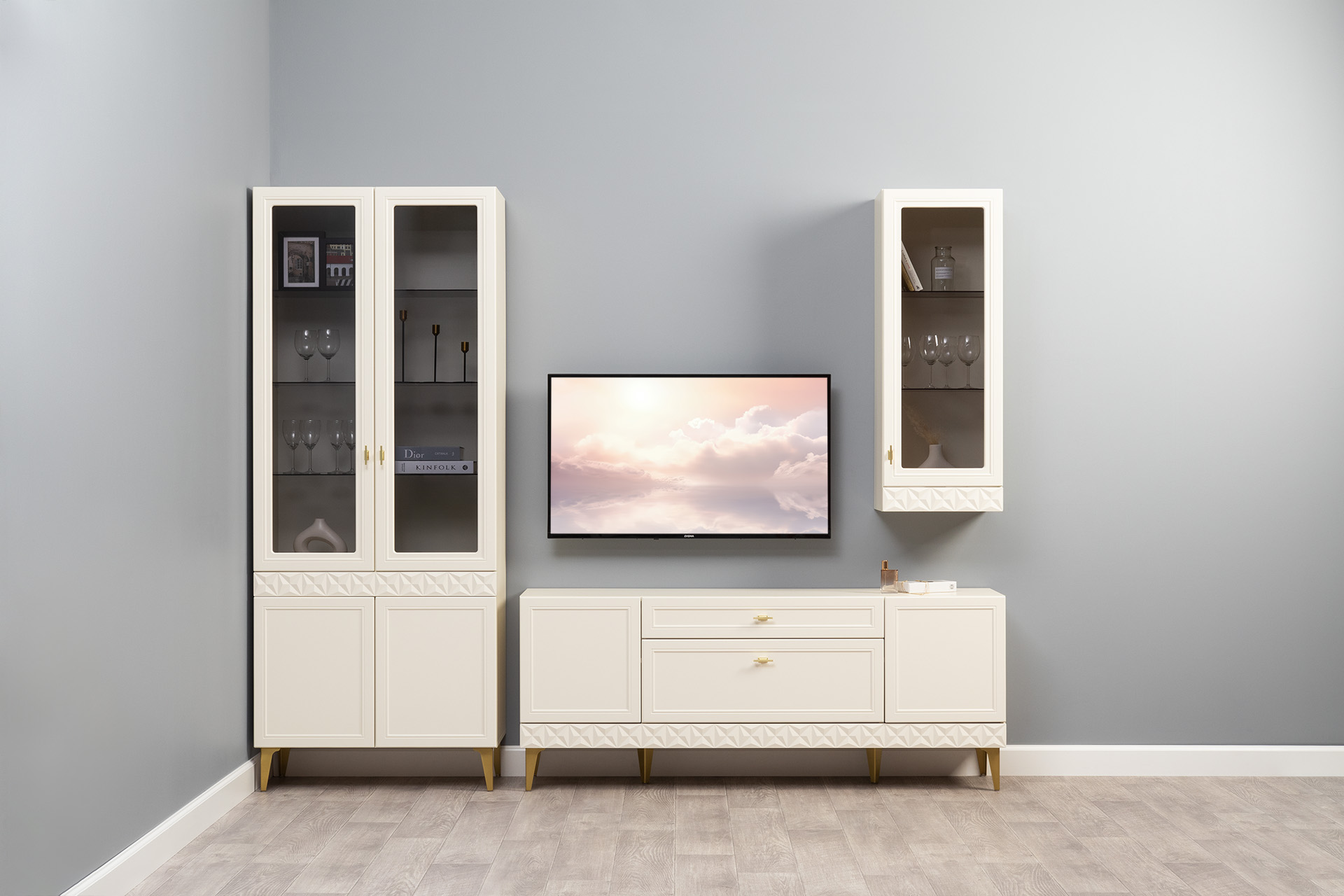 Гостиная Марион композиция 3 слоновая кость С341 PE, слоновая кость 6898 ПВХ, белый PE шагрень (собирается на любую сторону)
