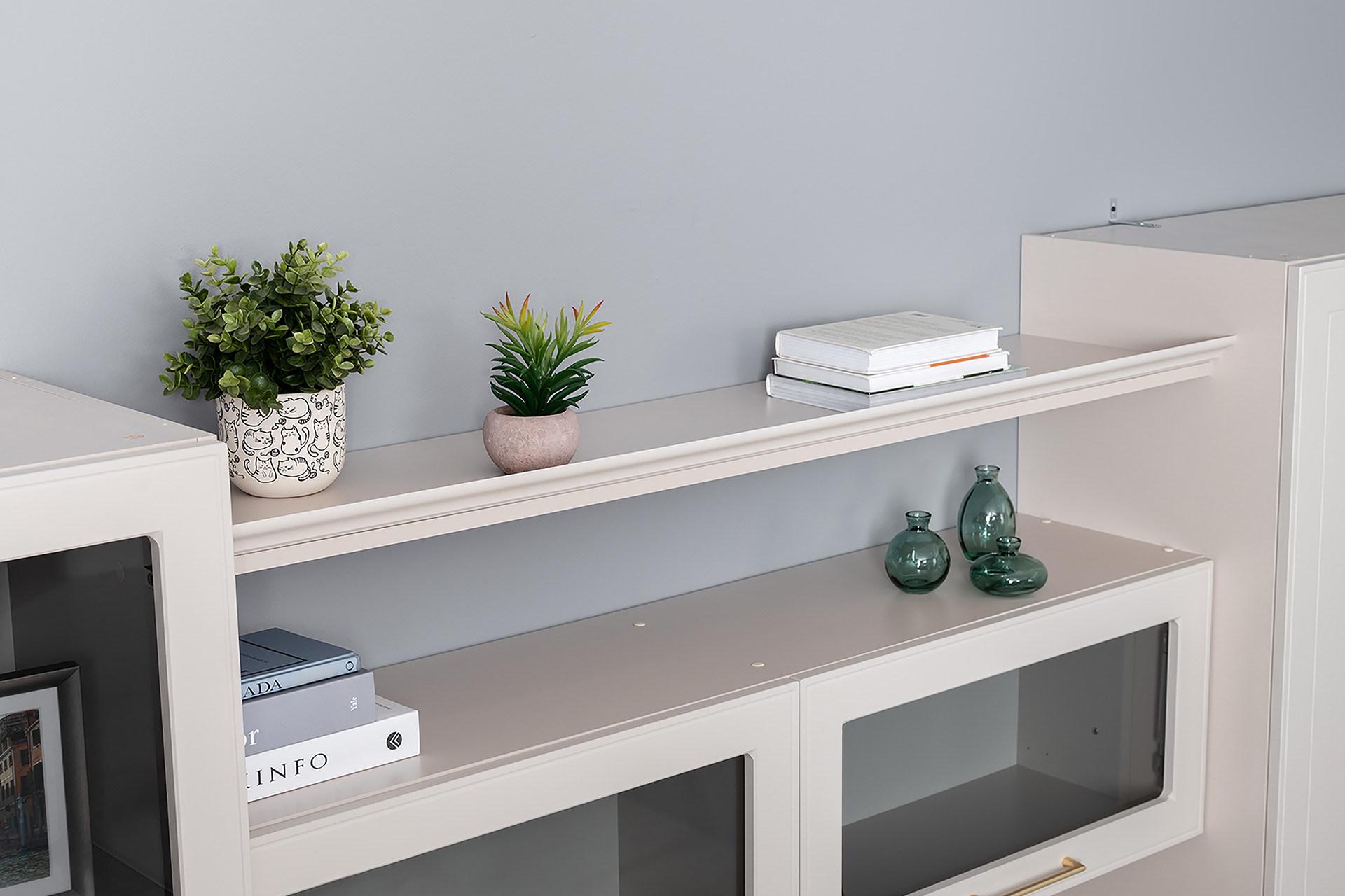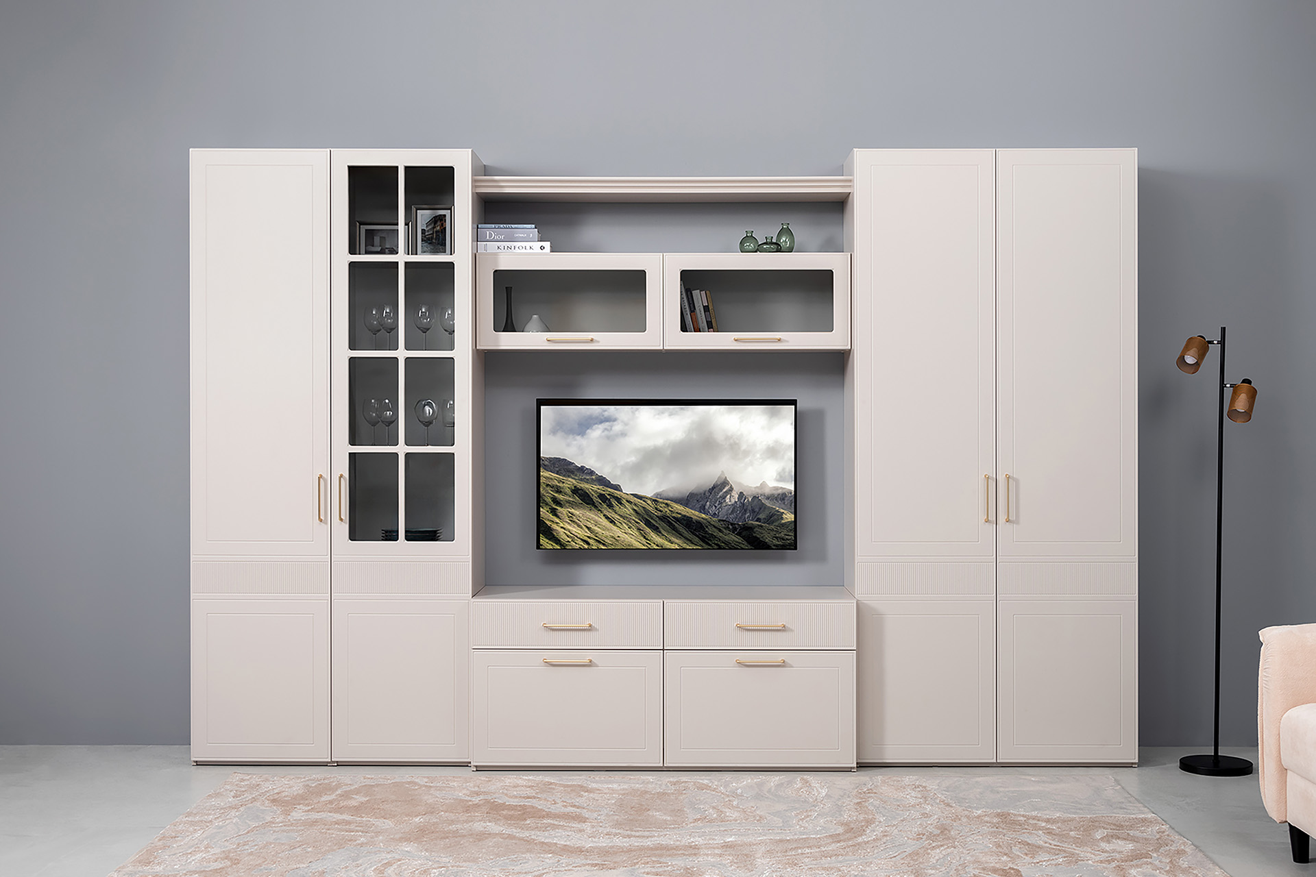 Гостиная Ричфорд композиция 1 без карнизов, кашемир 5981 BS, моно керамика D166-2 ПВХ, белый PE шагрень (собирается на любую сторону)
