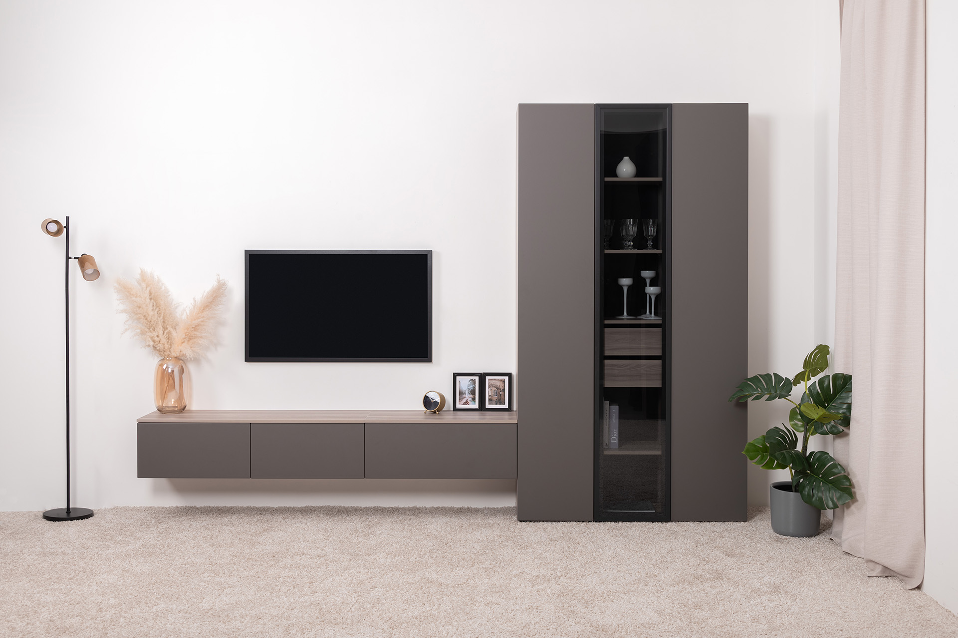 Разнообразие модулей и возможность их напольной и настенной установки позволит создать гостиную оптимальной конфигурации. Распашные фасады с механизмом push-to-open, направляющие скрытого монтажа в ящиках, петли с доводчиками, регулируемые опоры, крепеж в комплекте – комфорт продуман до мелочей.