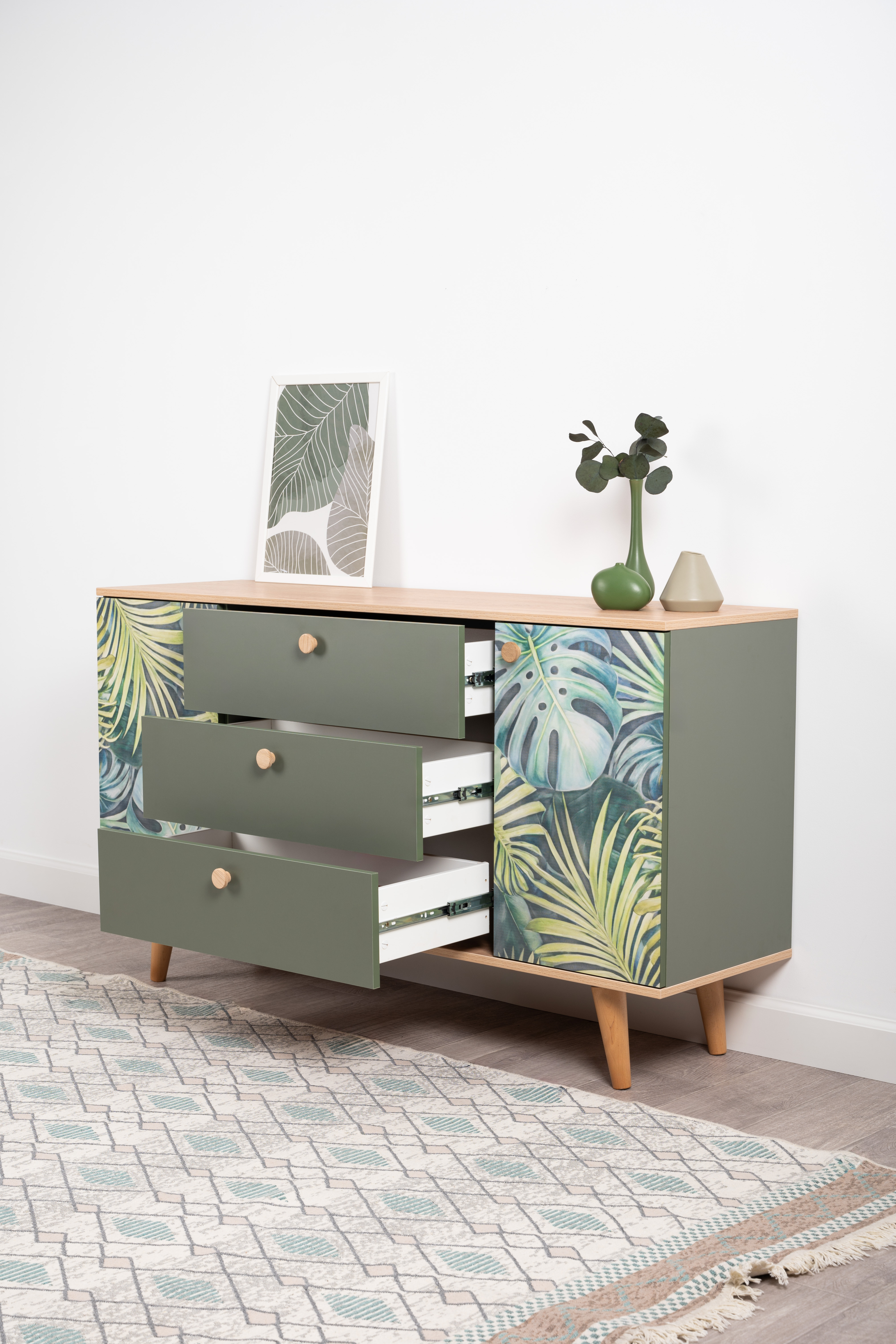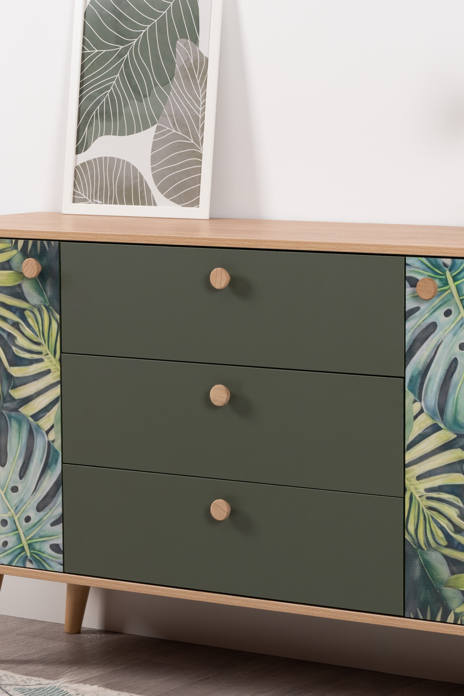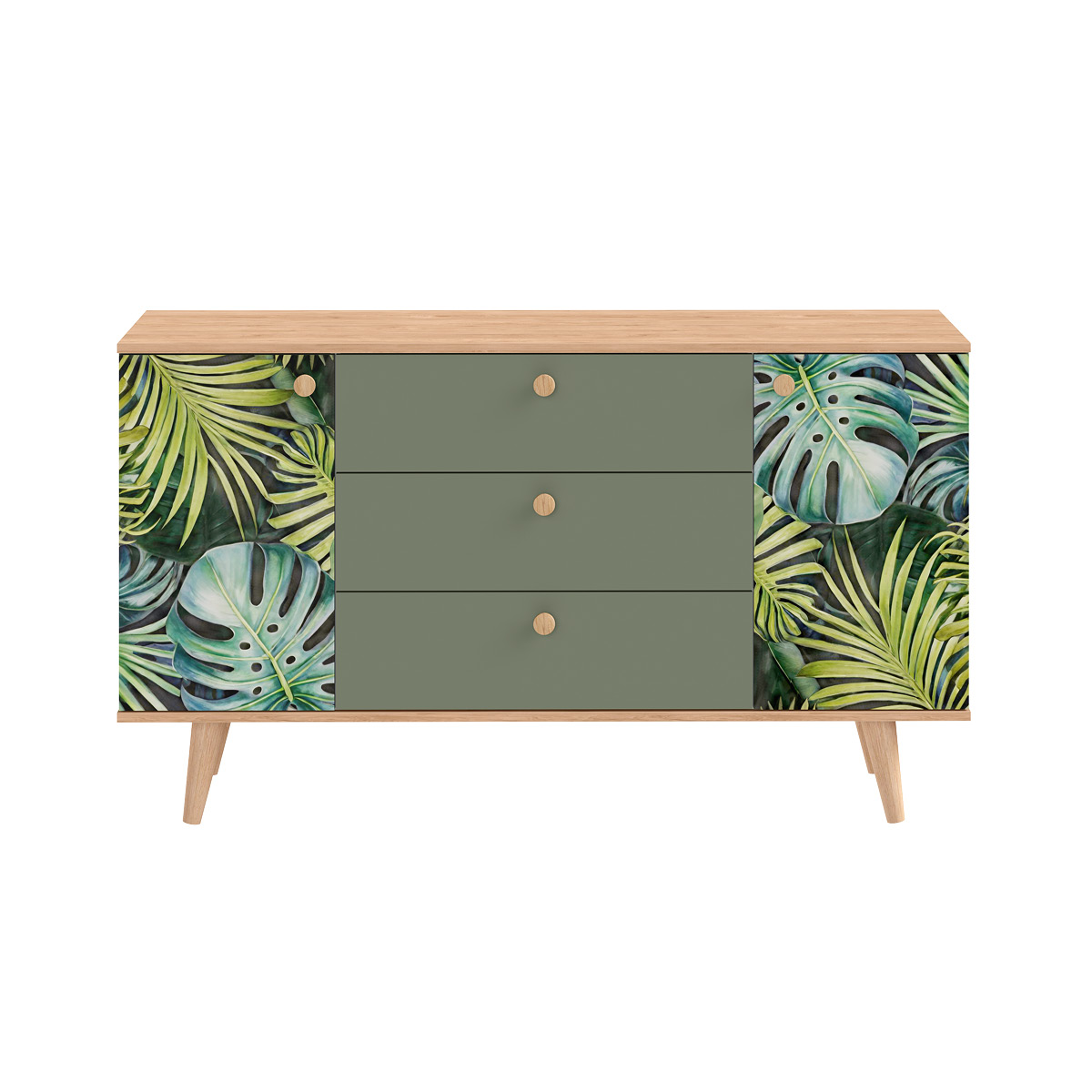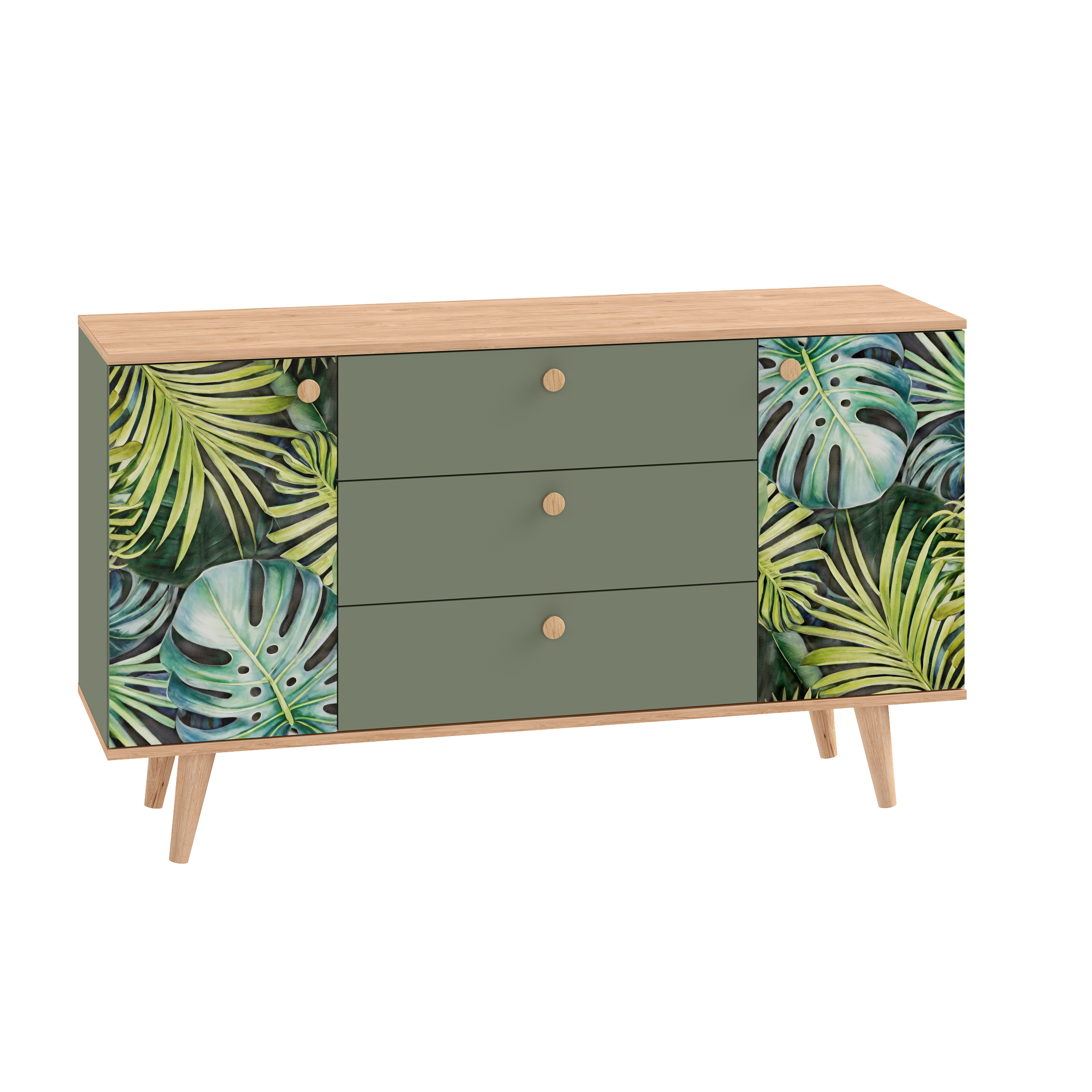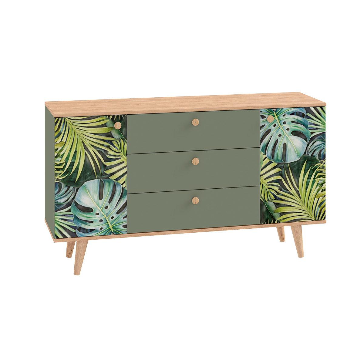 Маттиас – яркий комод с фотопечатью в тропическом стиле. Деревянные ручки и опоры подчеркивают естественность дизайна, а шариковые направляющие полного выдвижения и петли с доводчиком обеспечивают плавность и удобство эксплуатации.