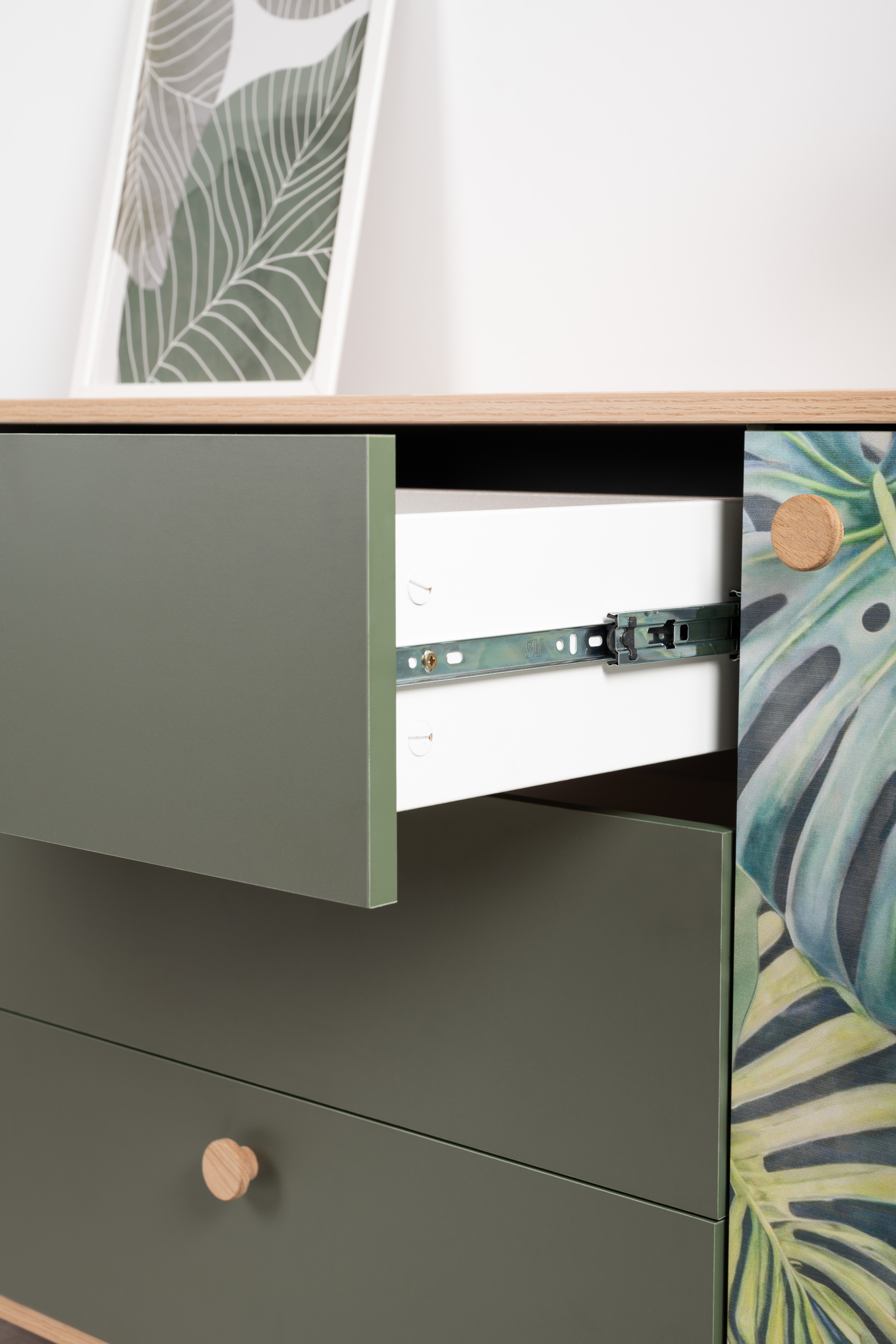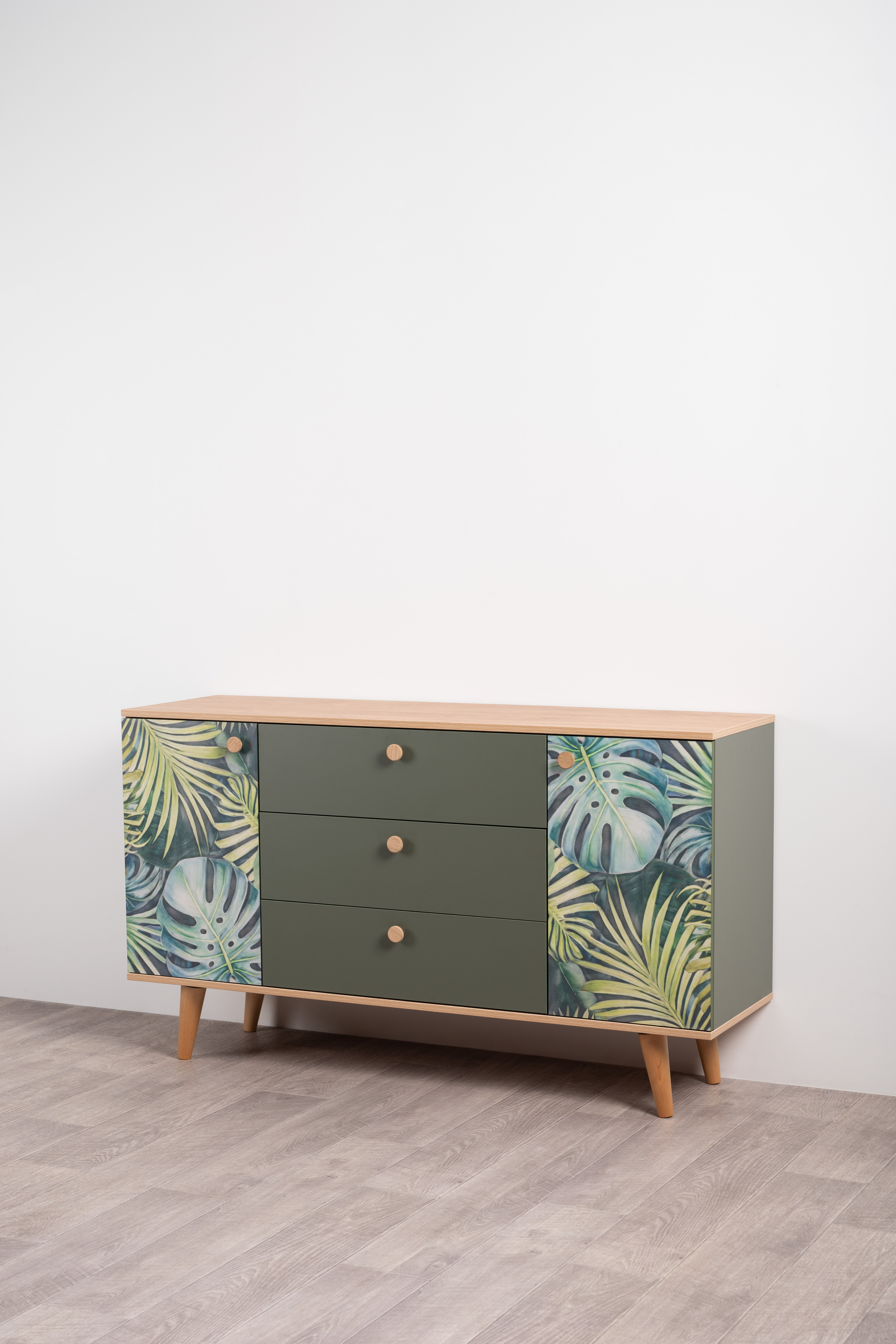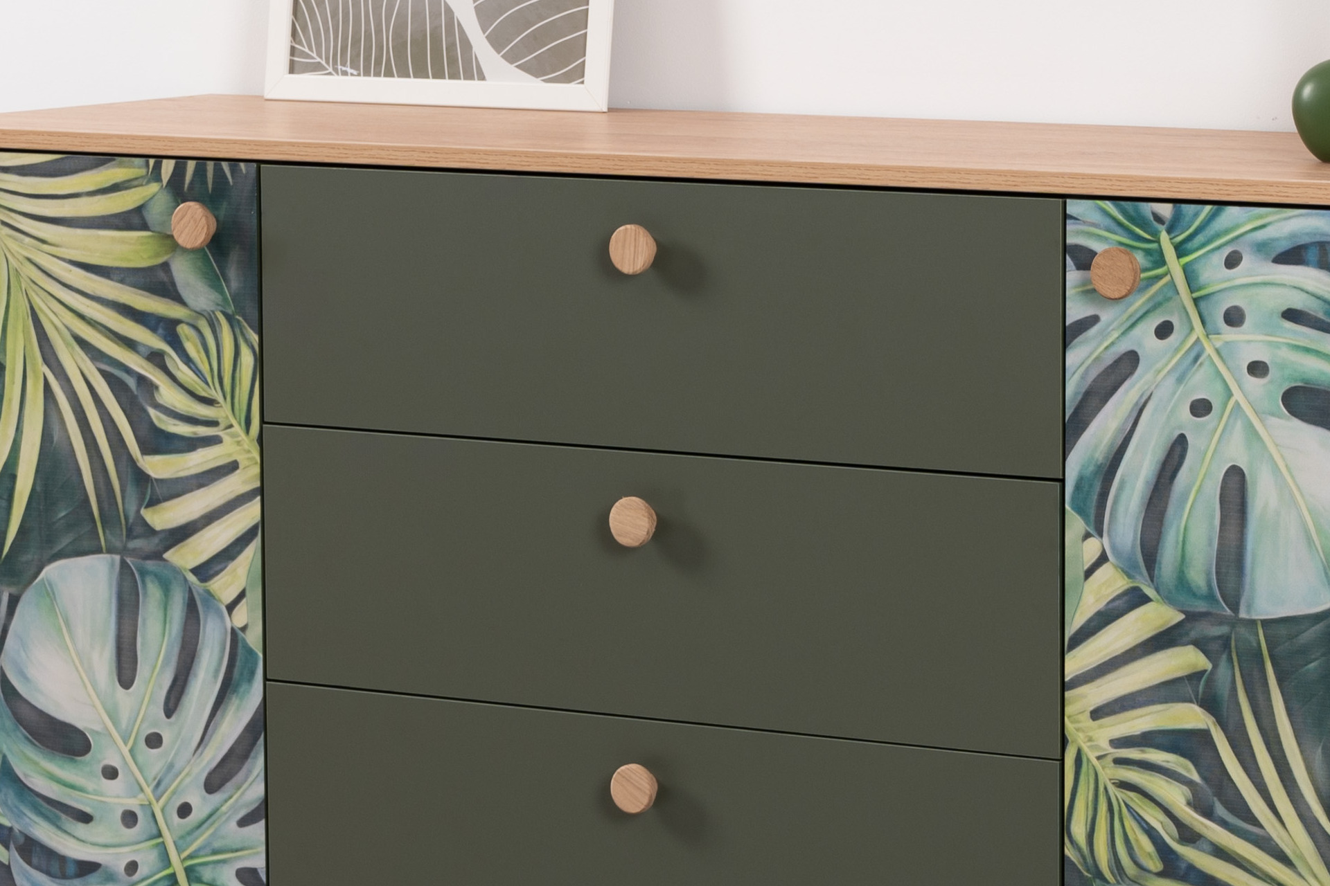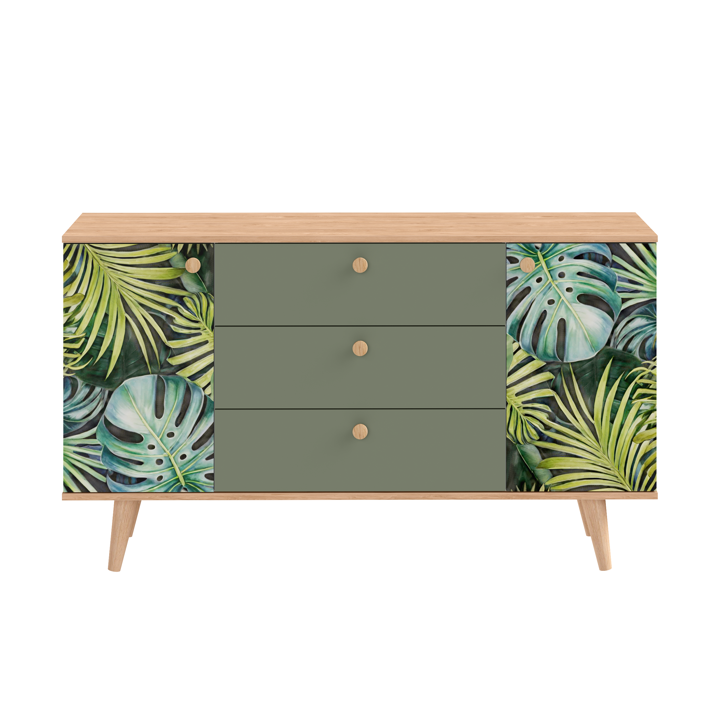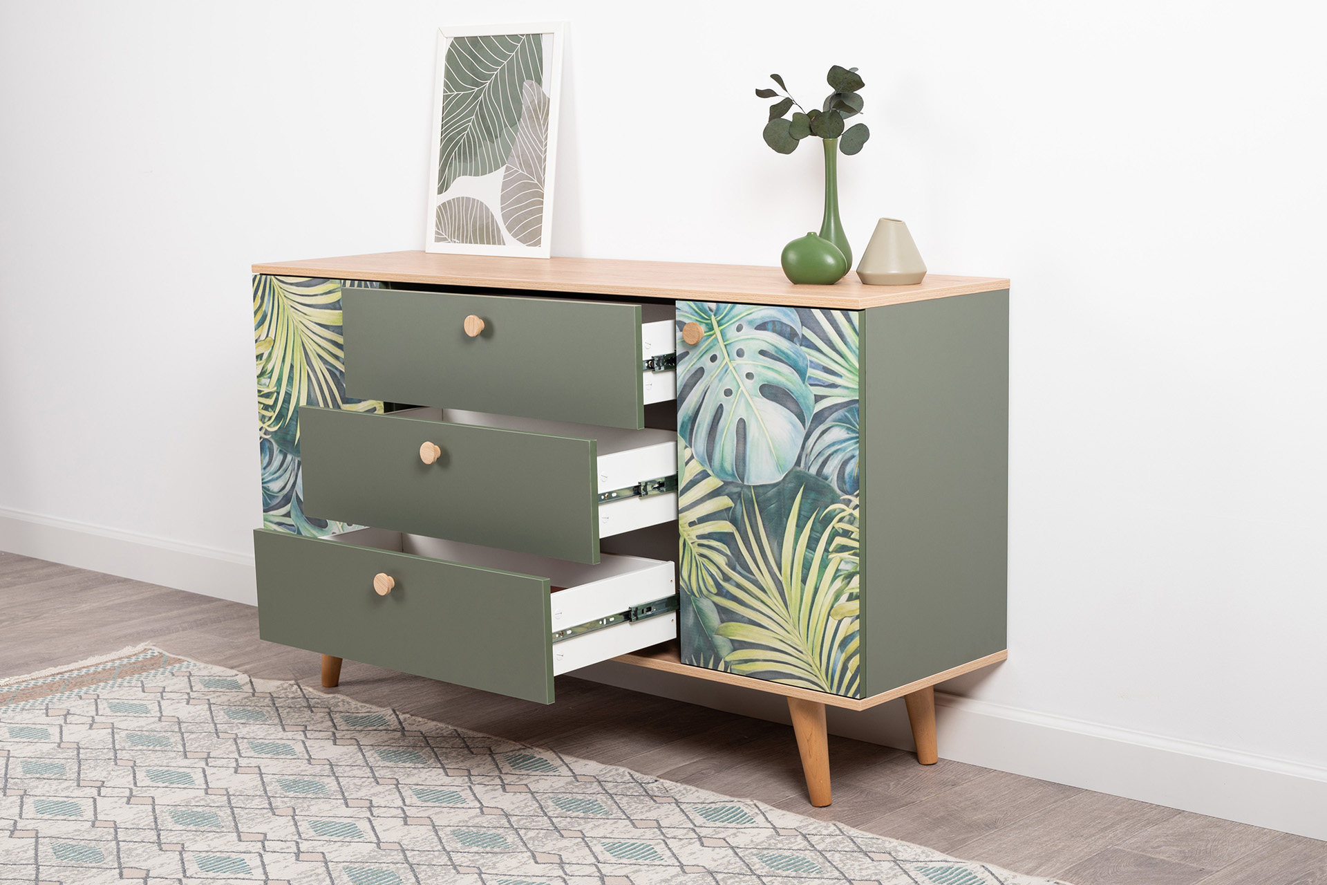 Маттиас – яркий комод с фотопечатью в тропическом стиле. Деревянные ручки и опоры подчеркивают естественность дизайна, а шариковые направляющие полного выдвижения и петли с доводчиком обеспечивают плавность и удобство эксплуатации.