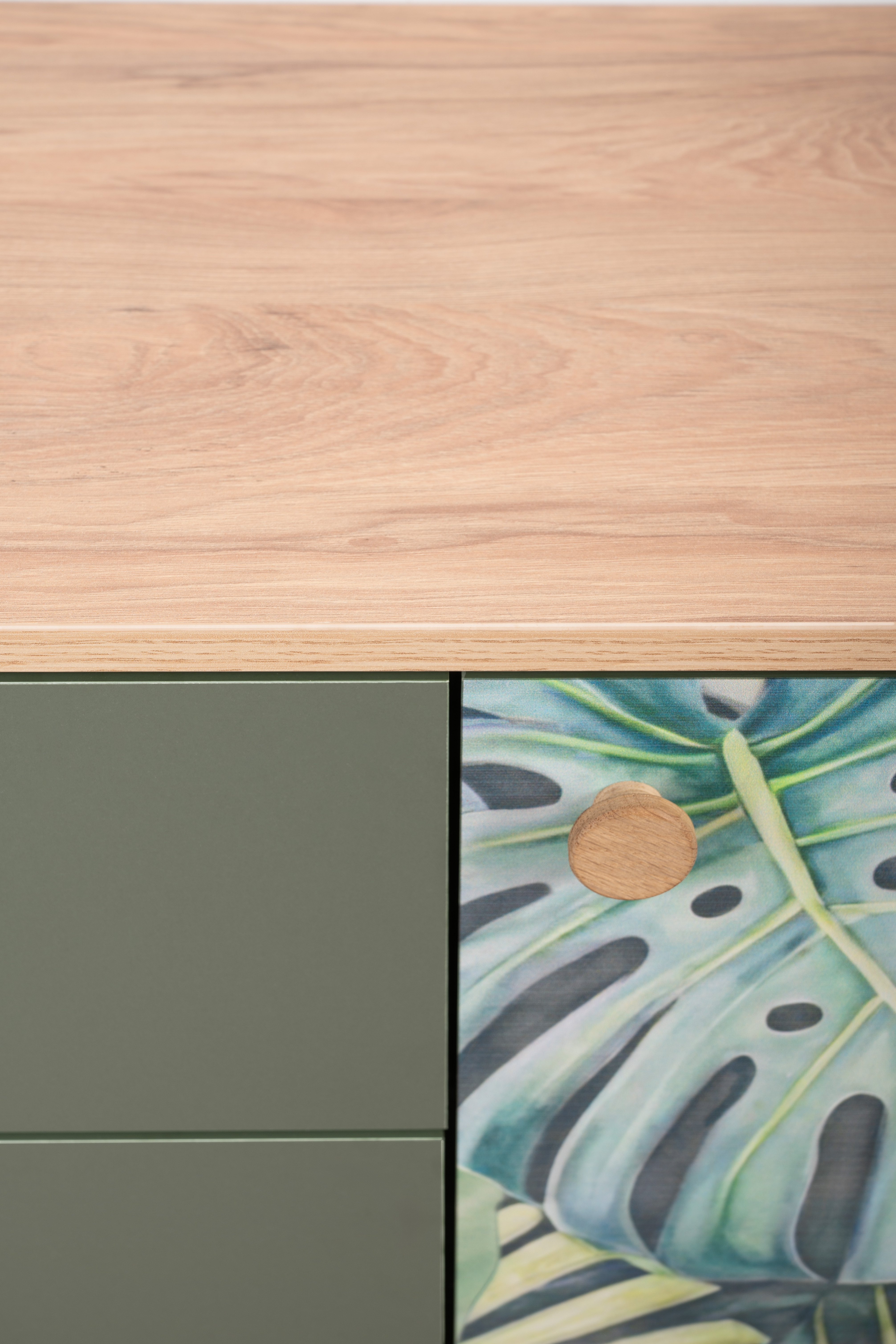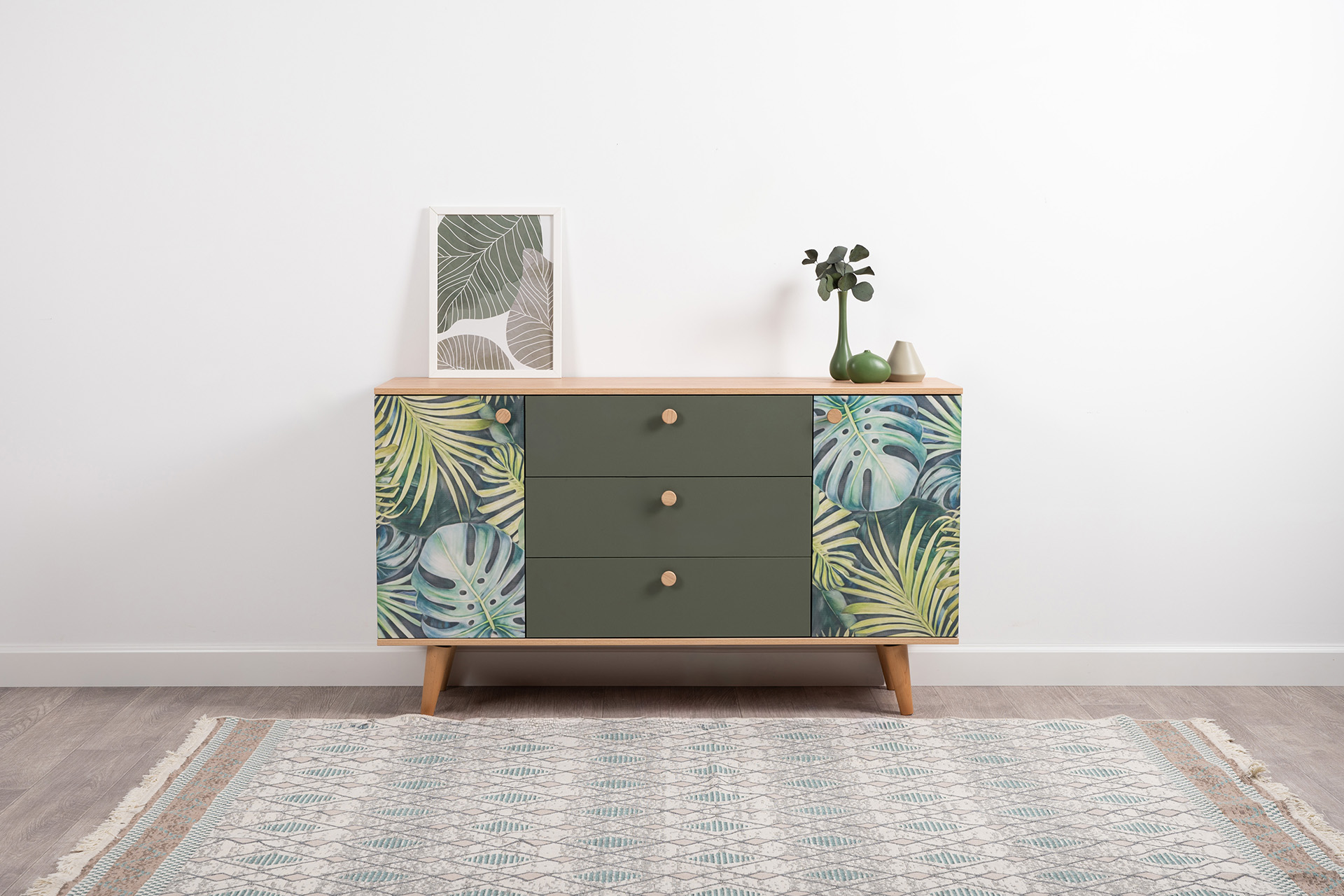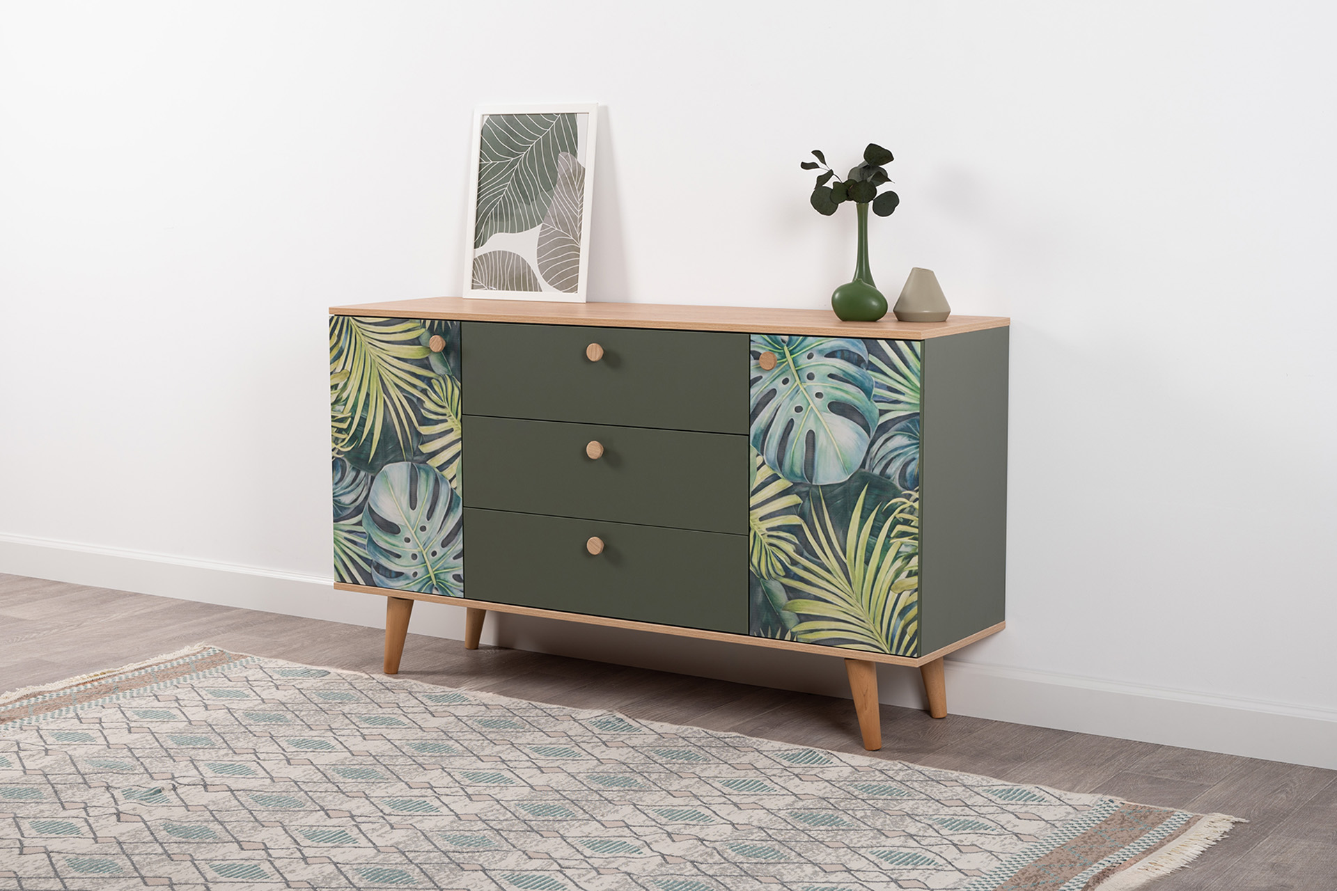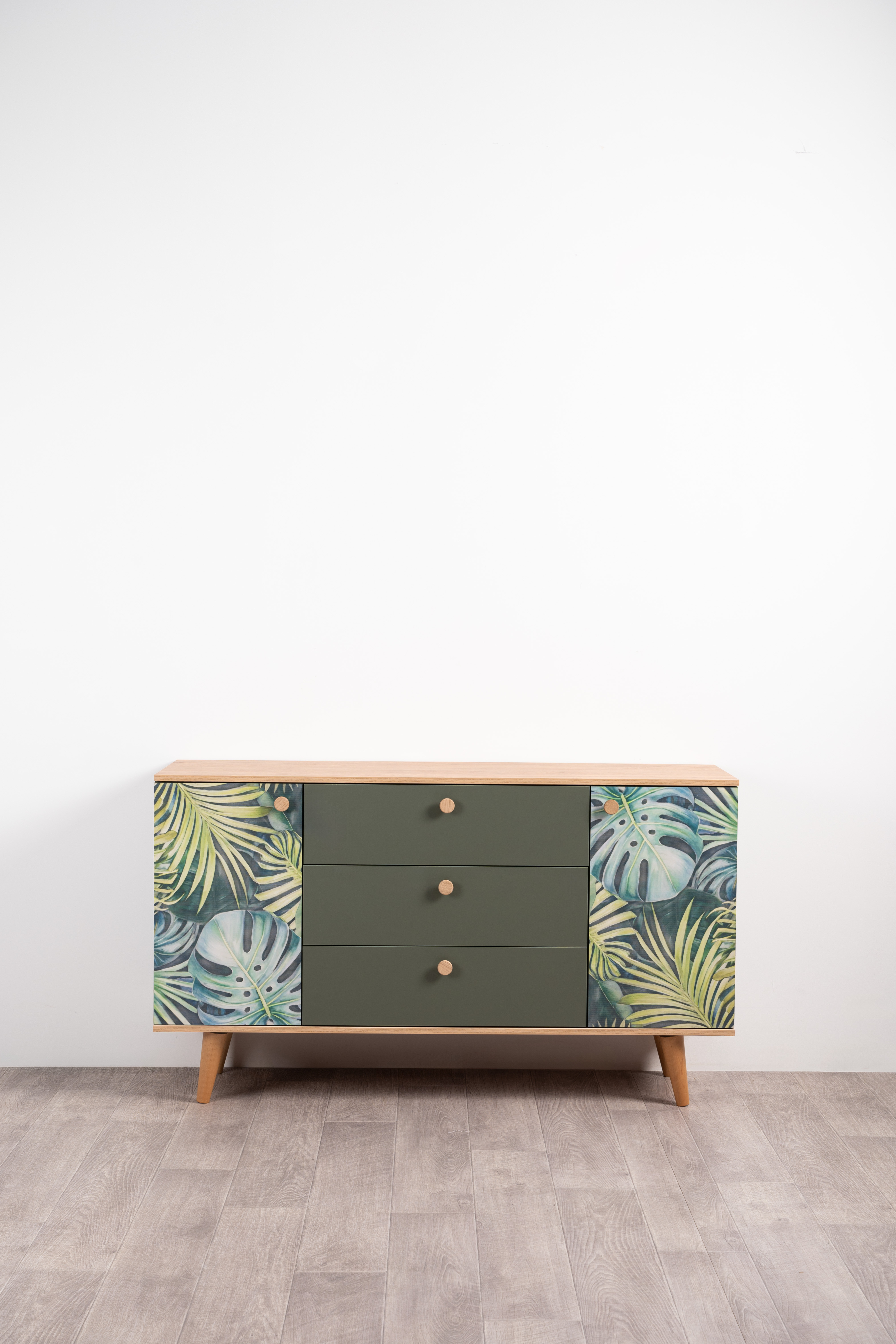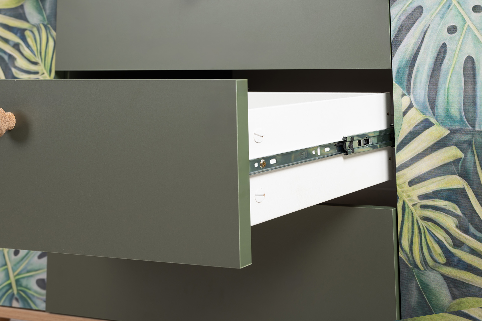 Маттиас – яркий комод с фотопечатью в тропическом стиле. Деревянные ручки и опоры подчеркивают естественность дизайна, а шариковые направляющие полного выдвижения и петли с доводчиком обеспечивают плавность и удобство эксплуатации.