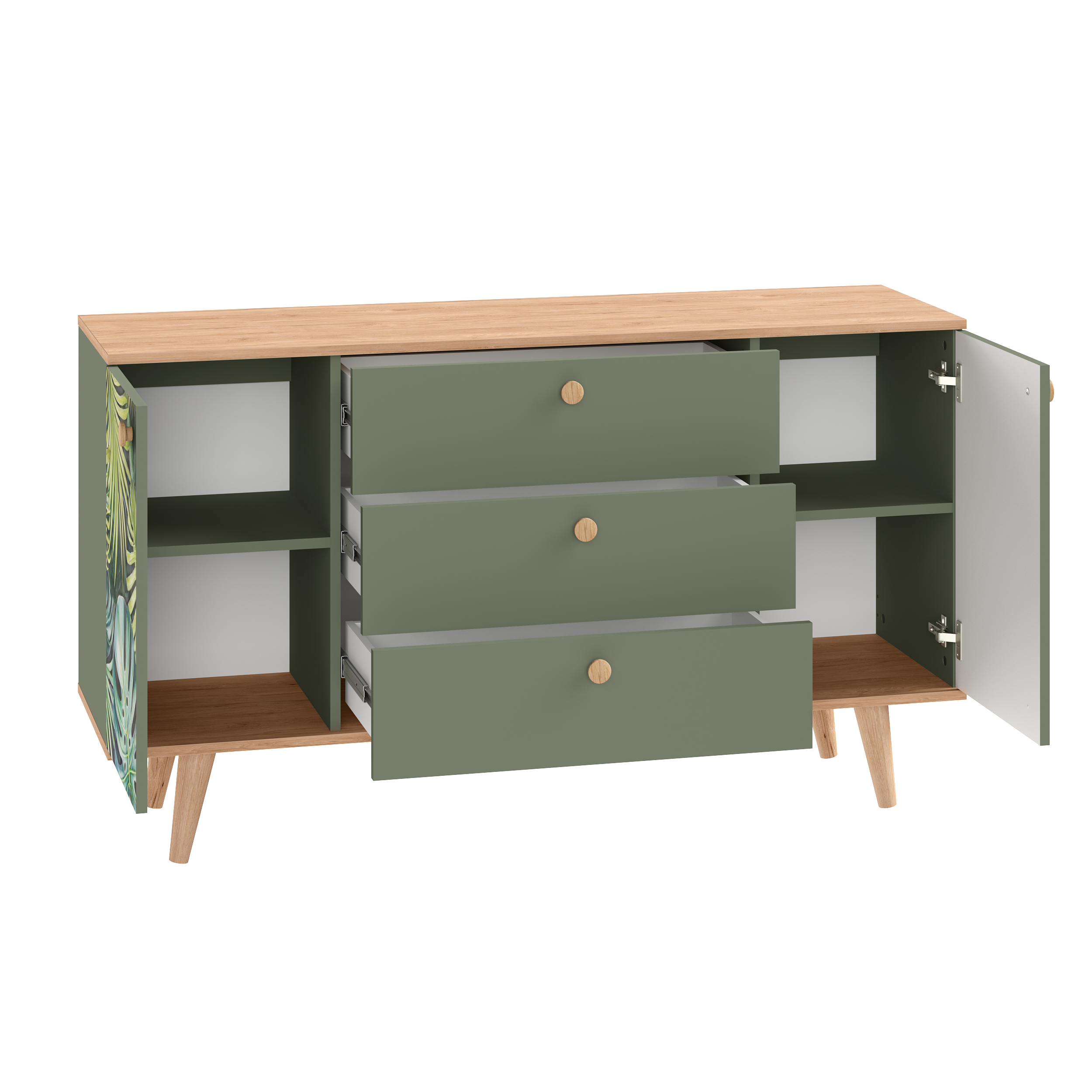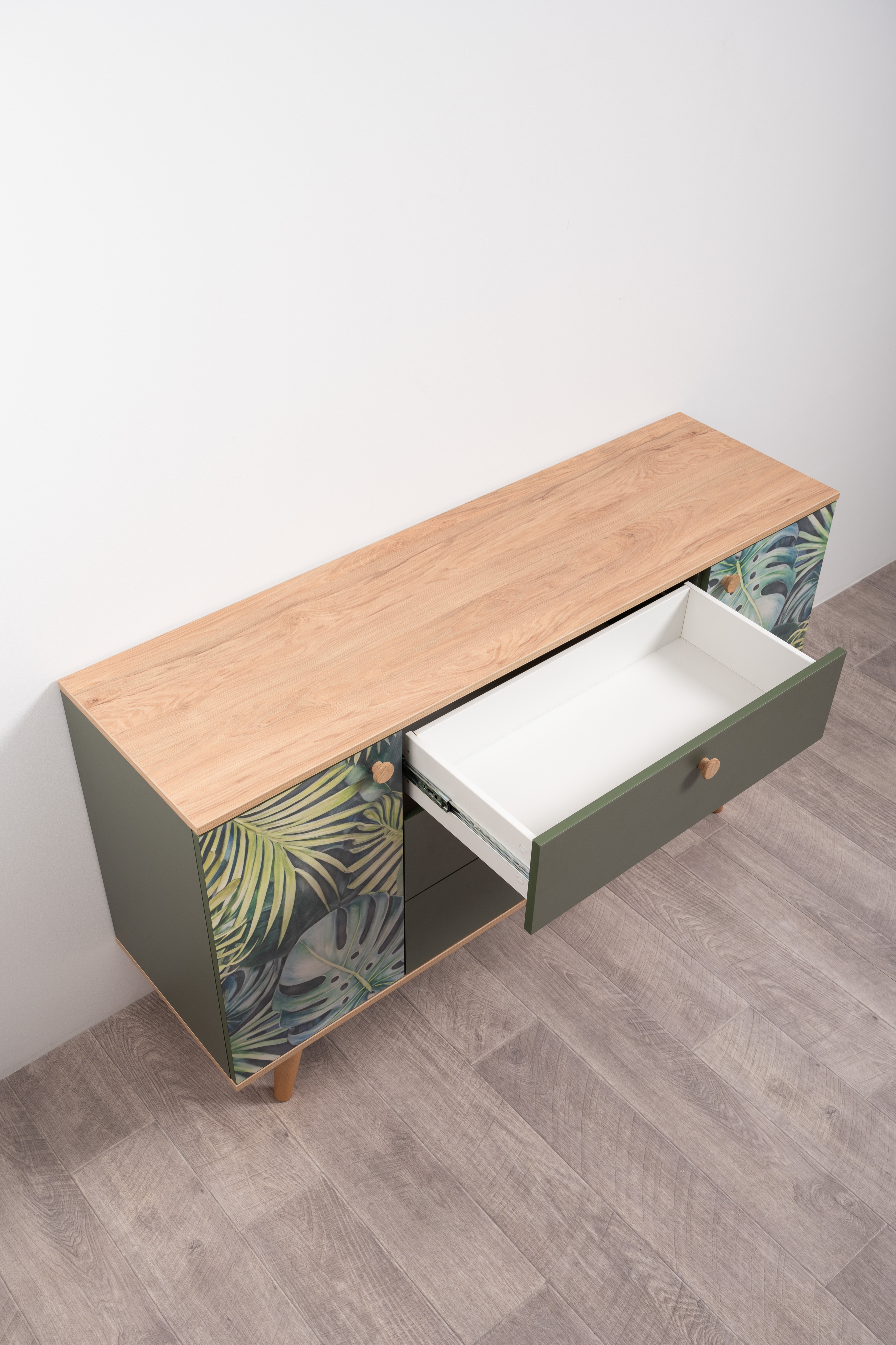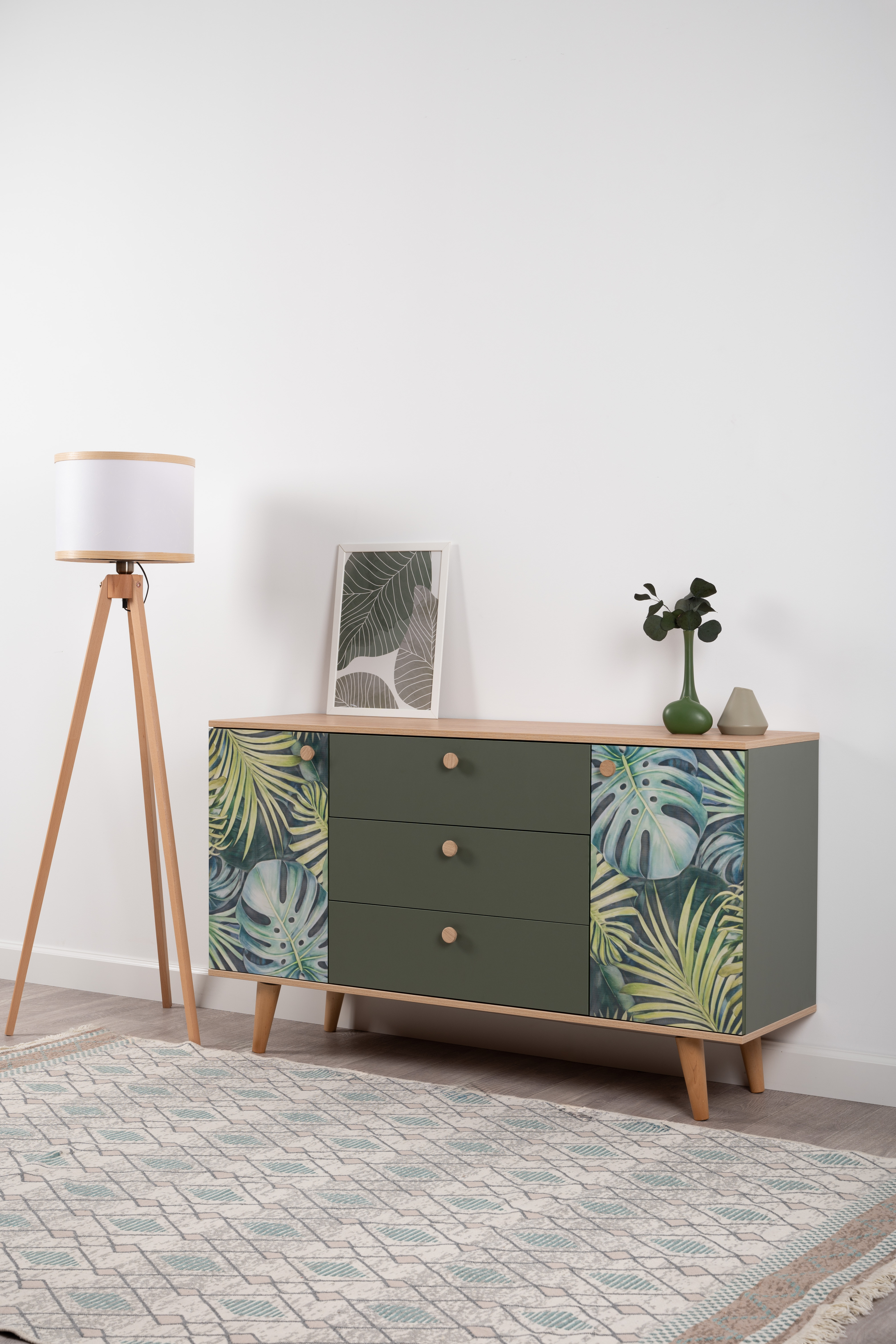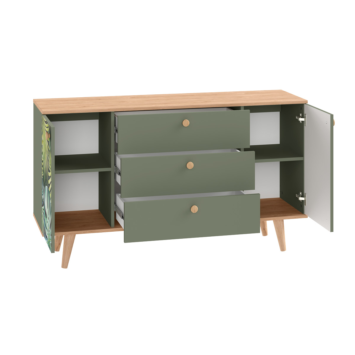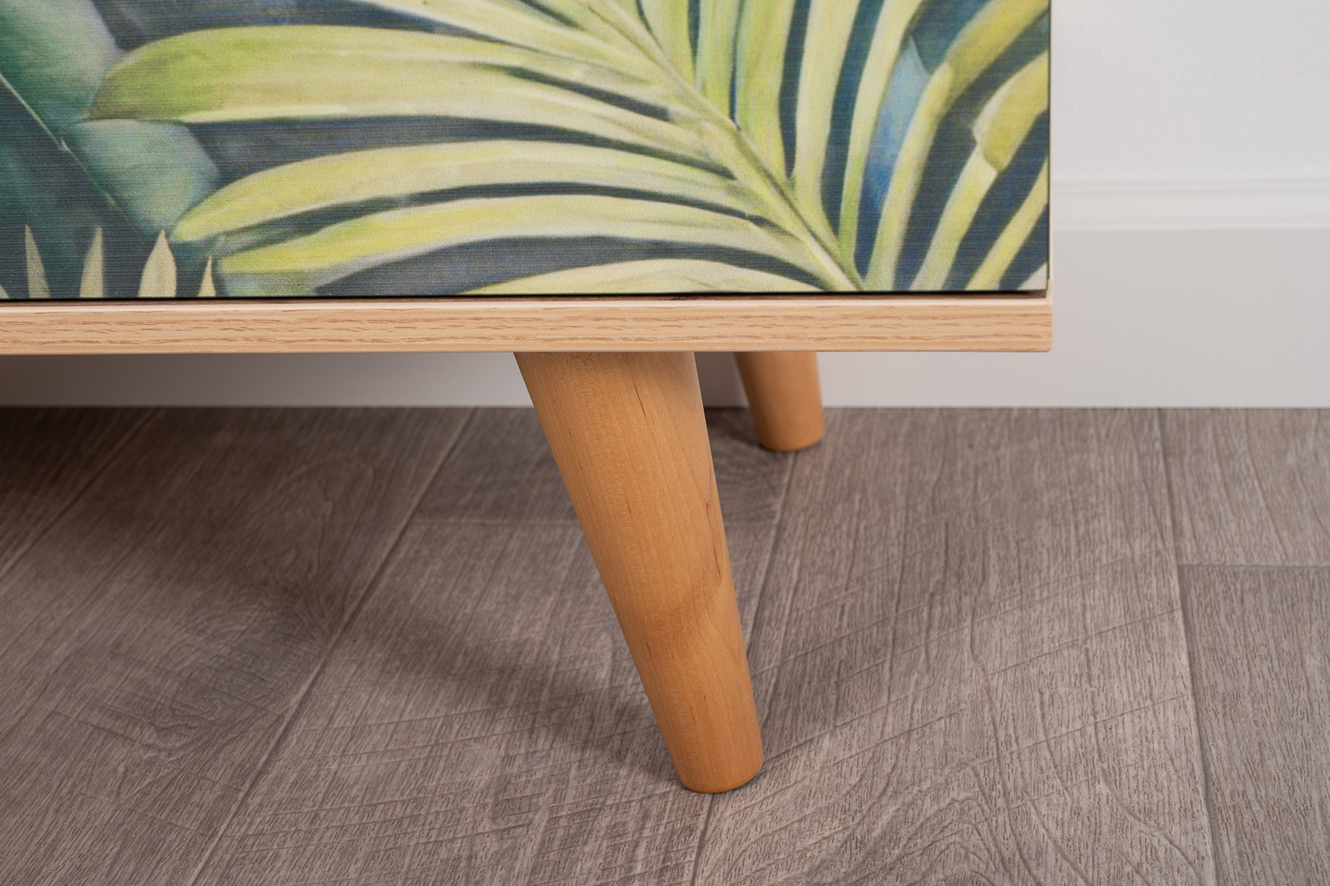 Маттиас – яркий комод с фотопечатью в тропическом стиле. Деревянные ручки и опоры подчеркивают естественность дизайна, а шариковые направляющие полного выдвижения и петли с доводчиком обеспечивают плавность и удобство эксплуатации.