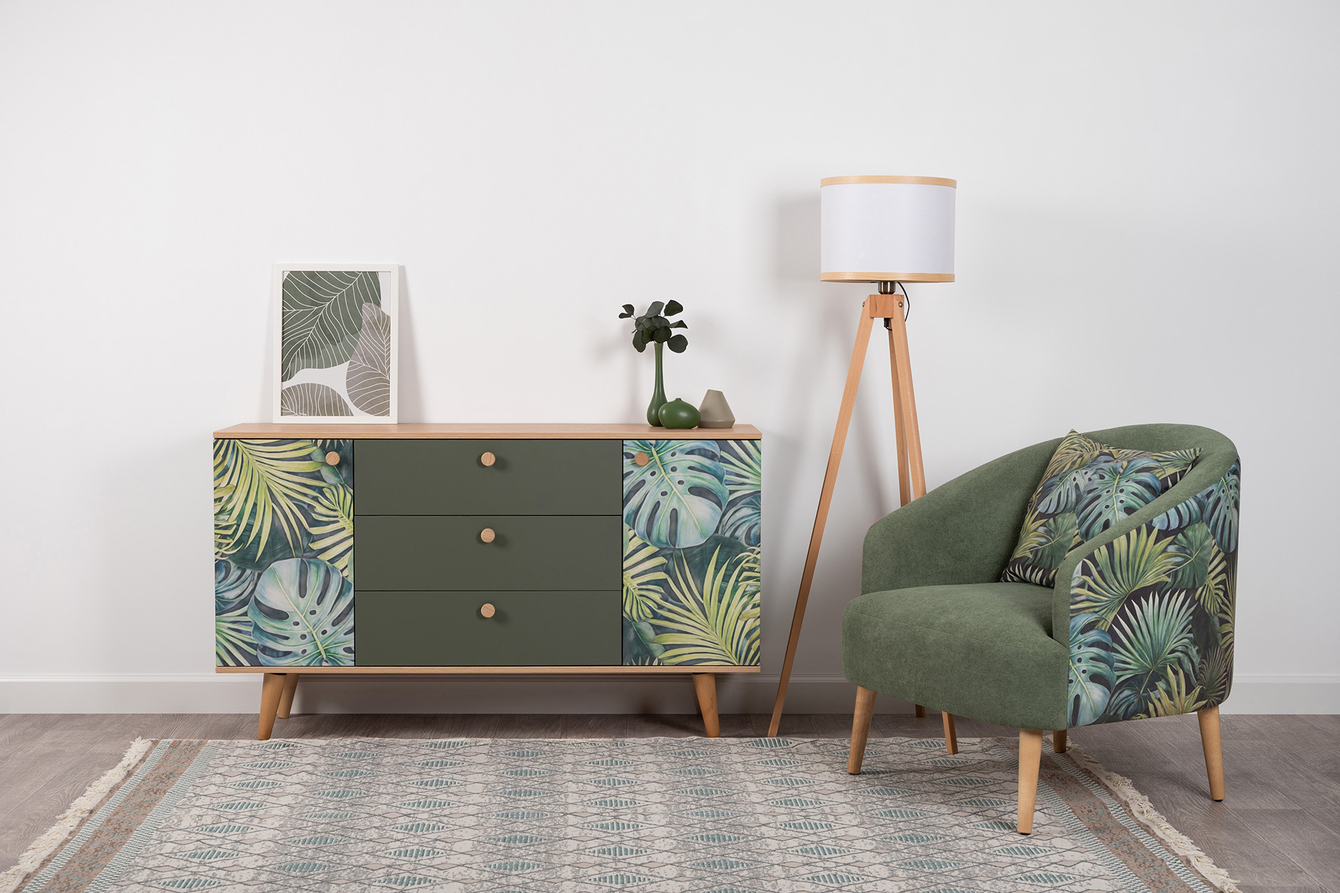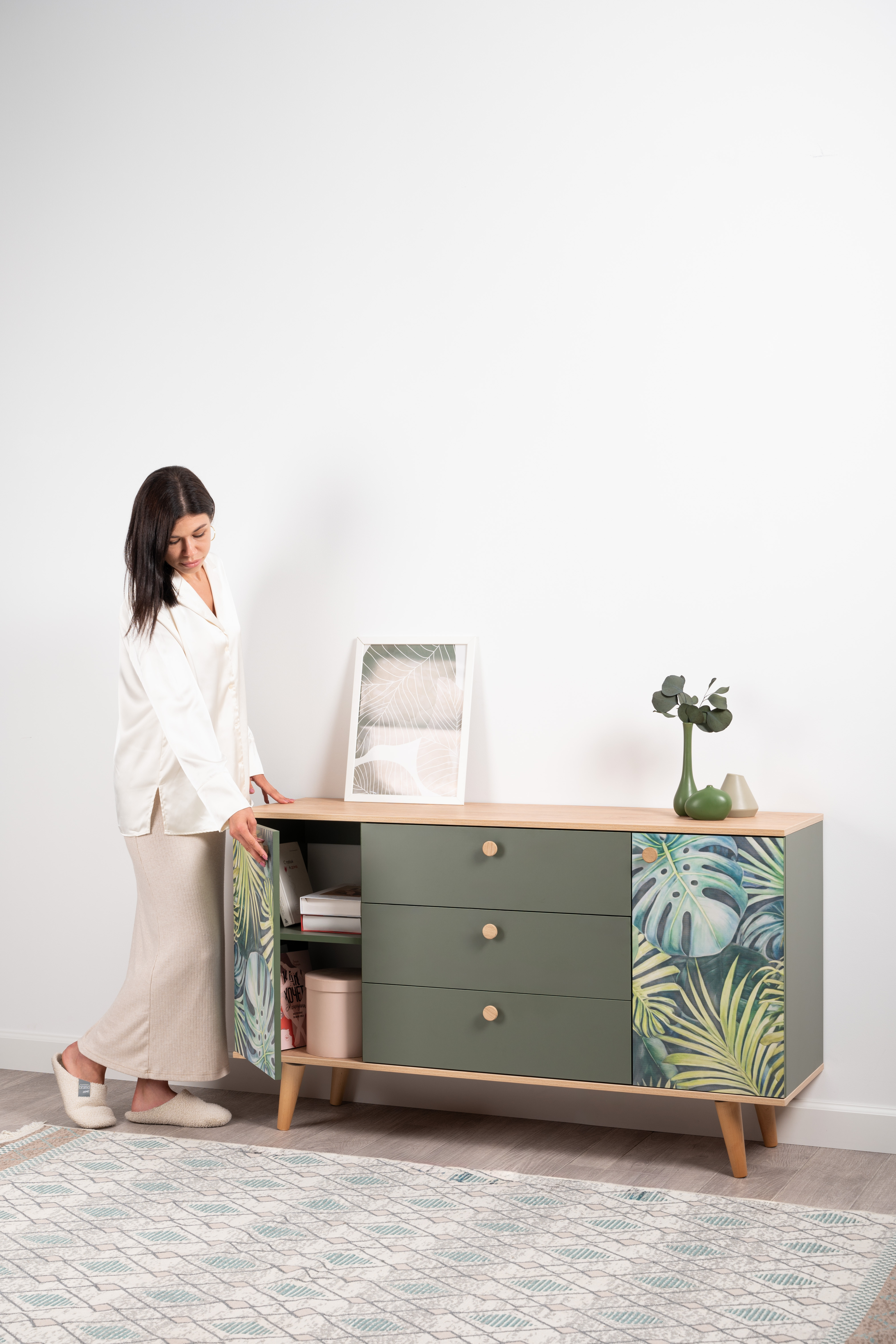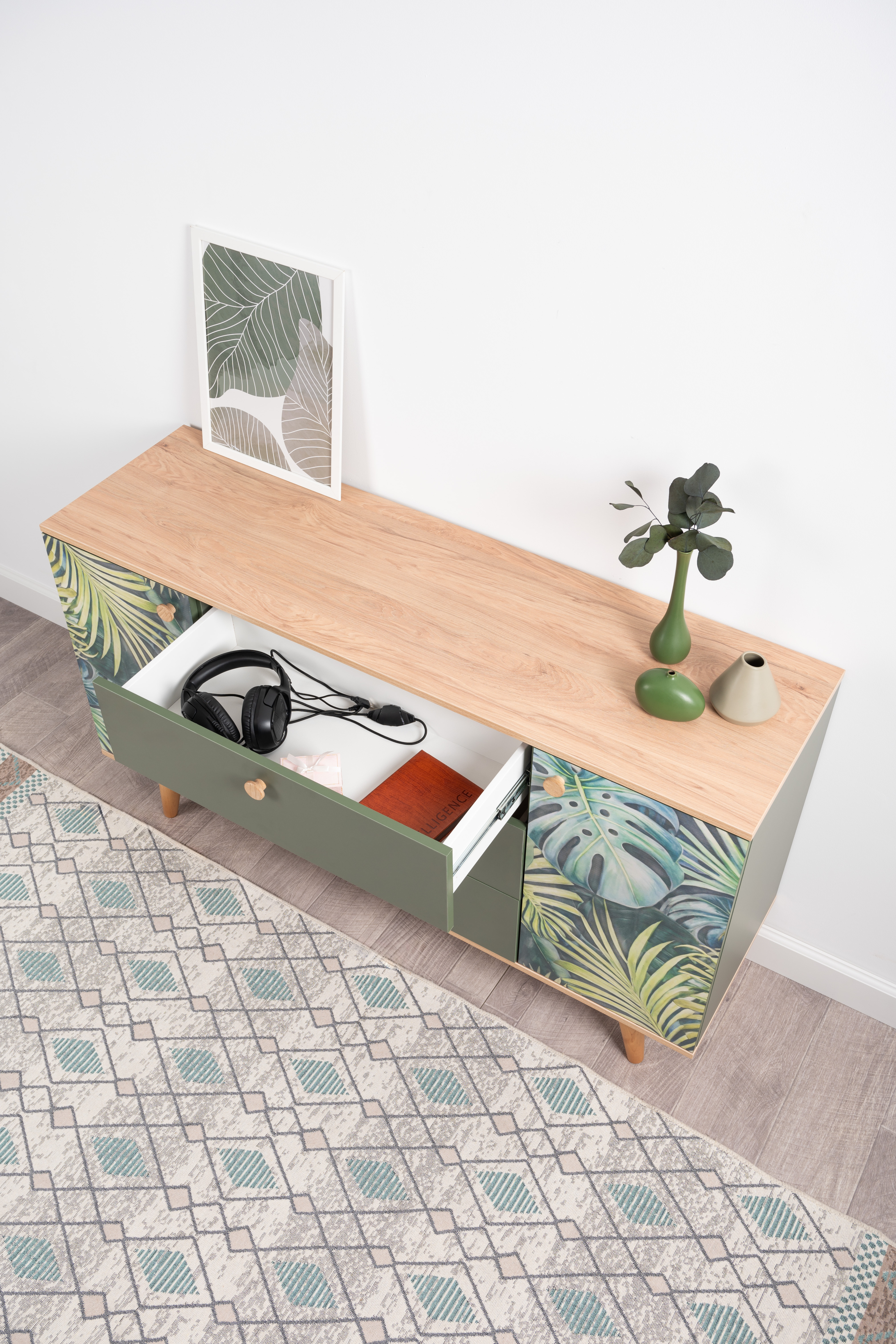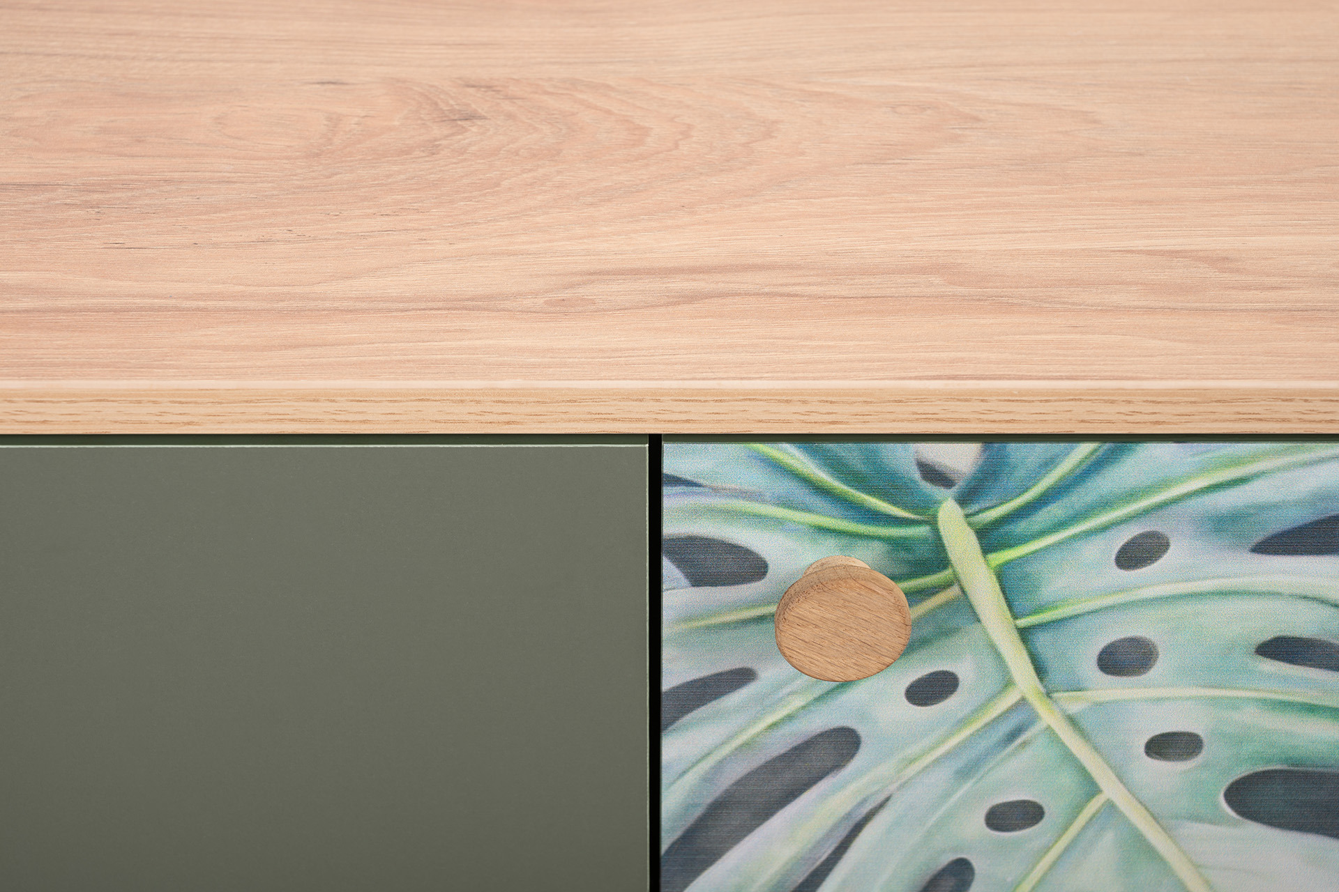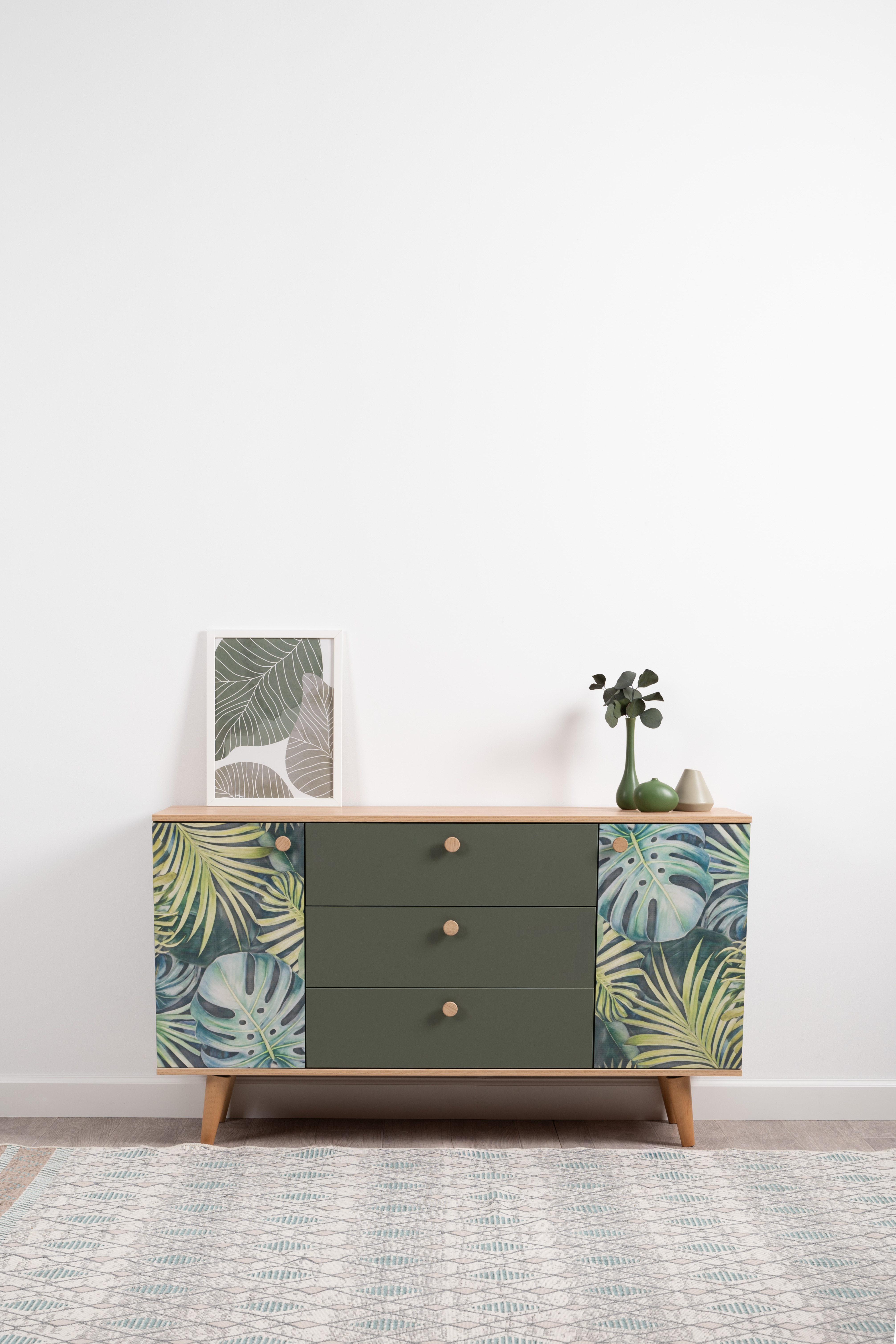 Маттиас – яркий комод с фотопечатью в тропическом стиле. Деревянные ручки и опоры подчеркивают естественность дизайна, а шариковые направляющие полного выдвижения и петли с доводчиком обеспечивают плавность и удобство эксплуатации.