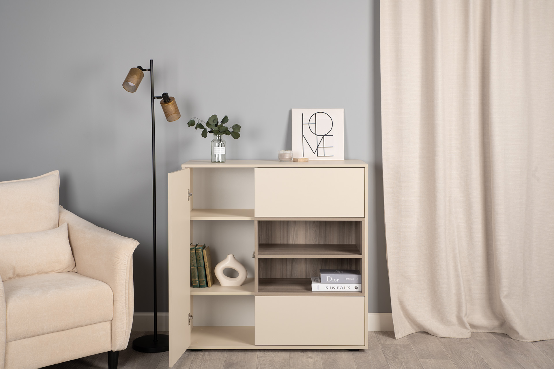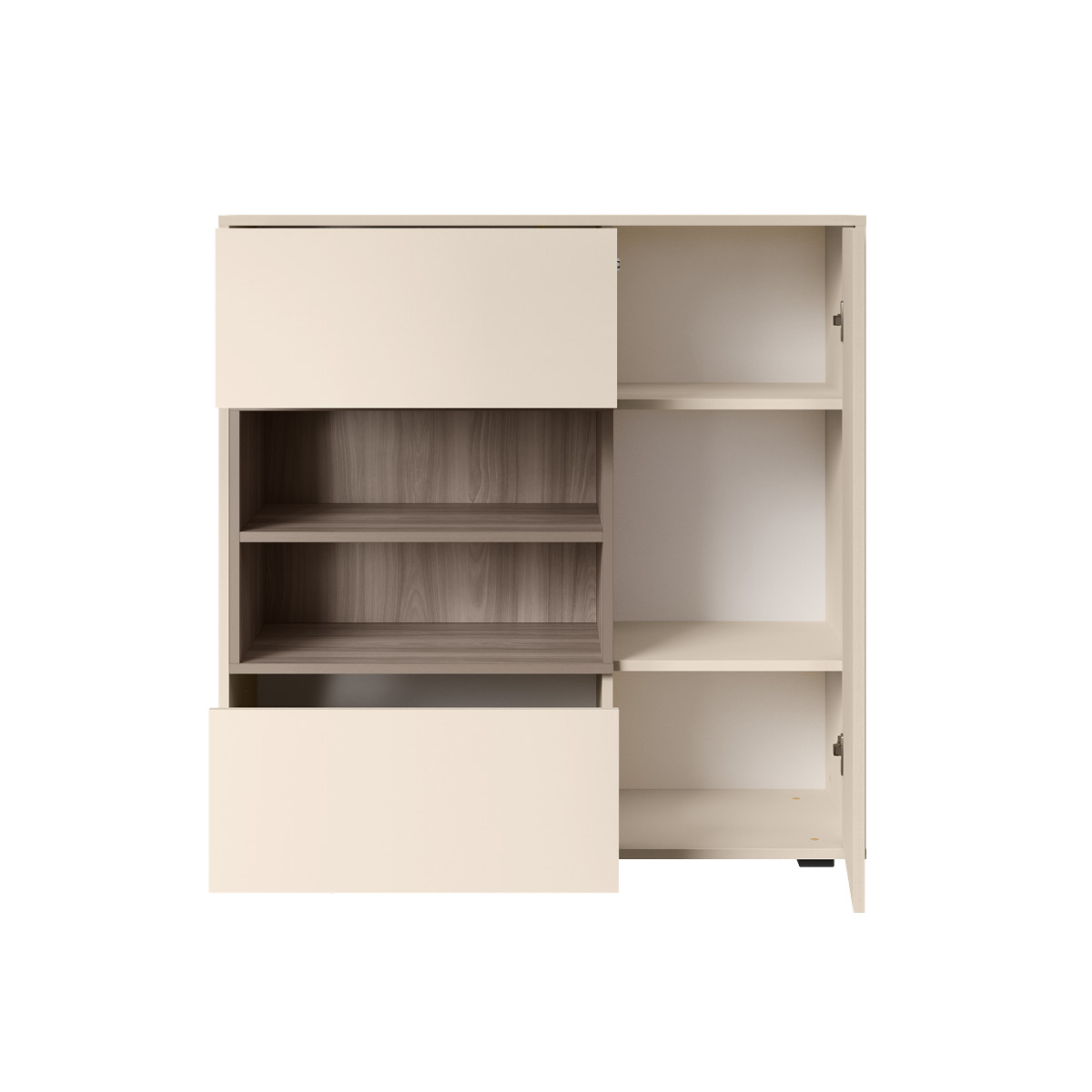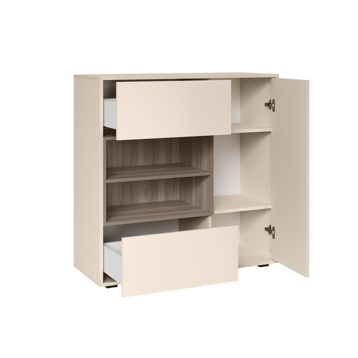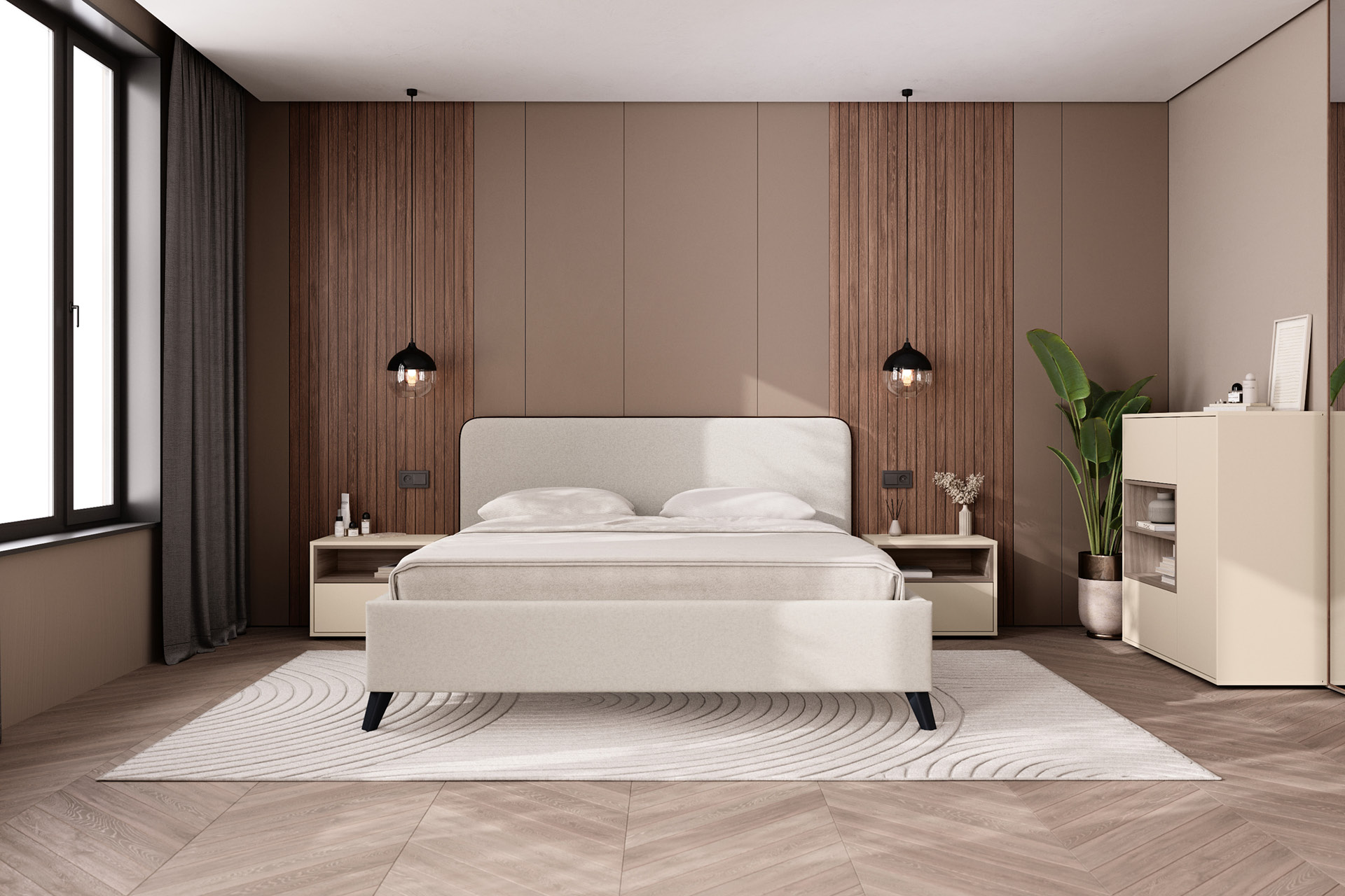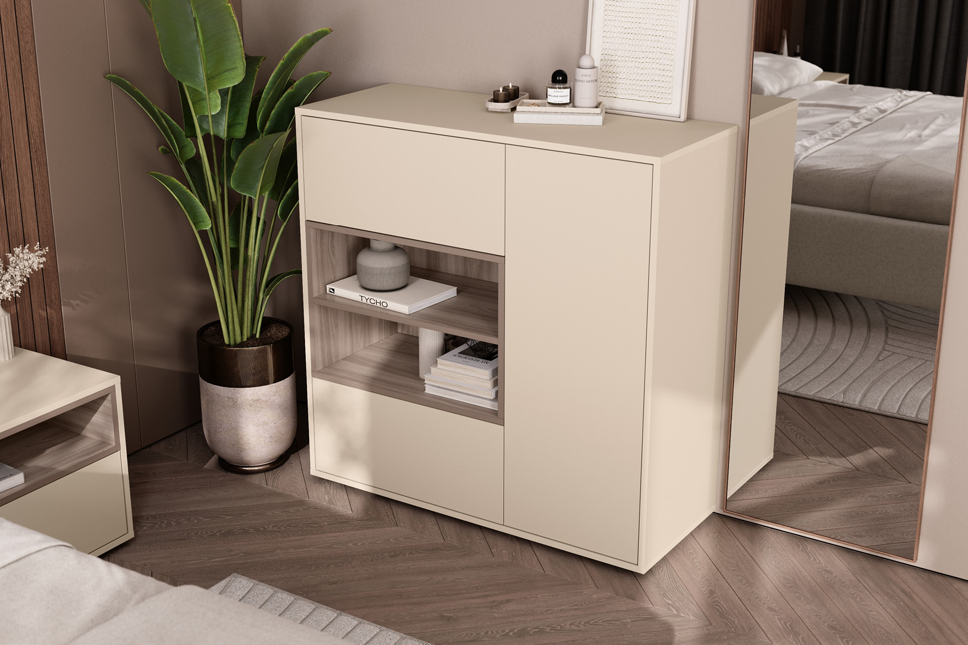 Благодаря нейтральному светлому оттенку и универсальности декора модули можно разместить в спальне, гостиной, прихожей.
