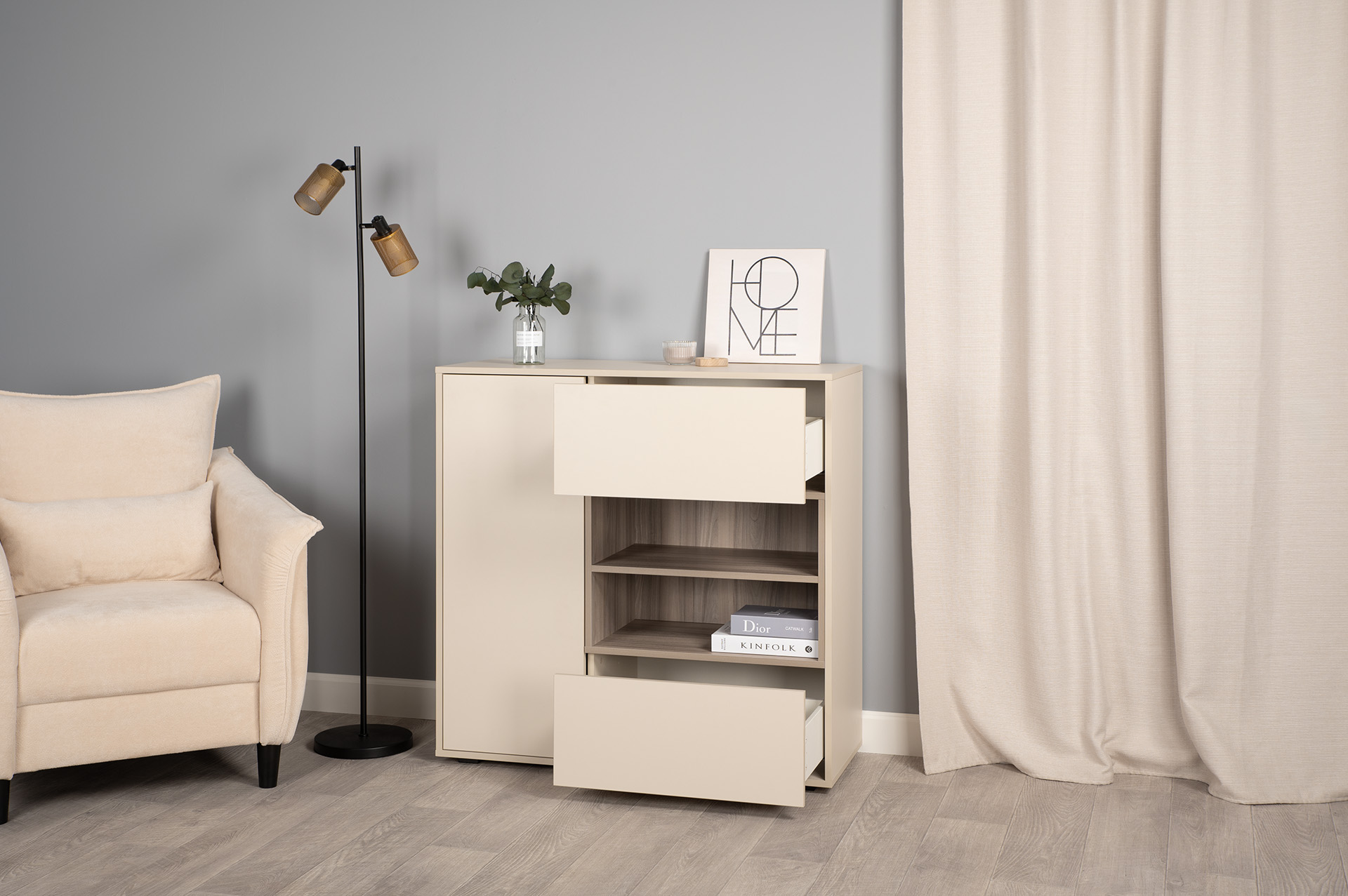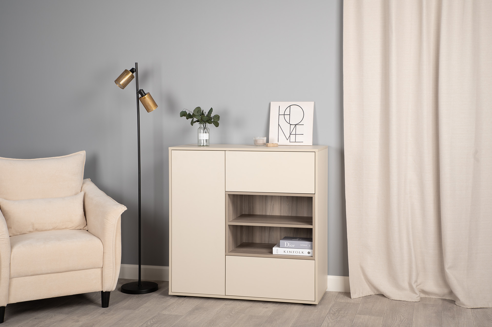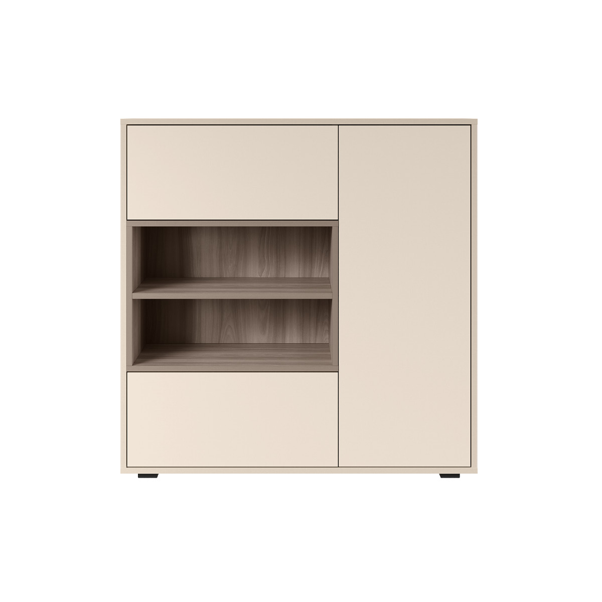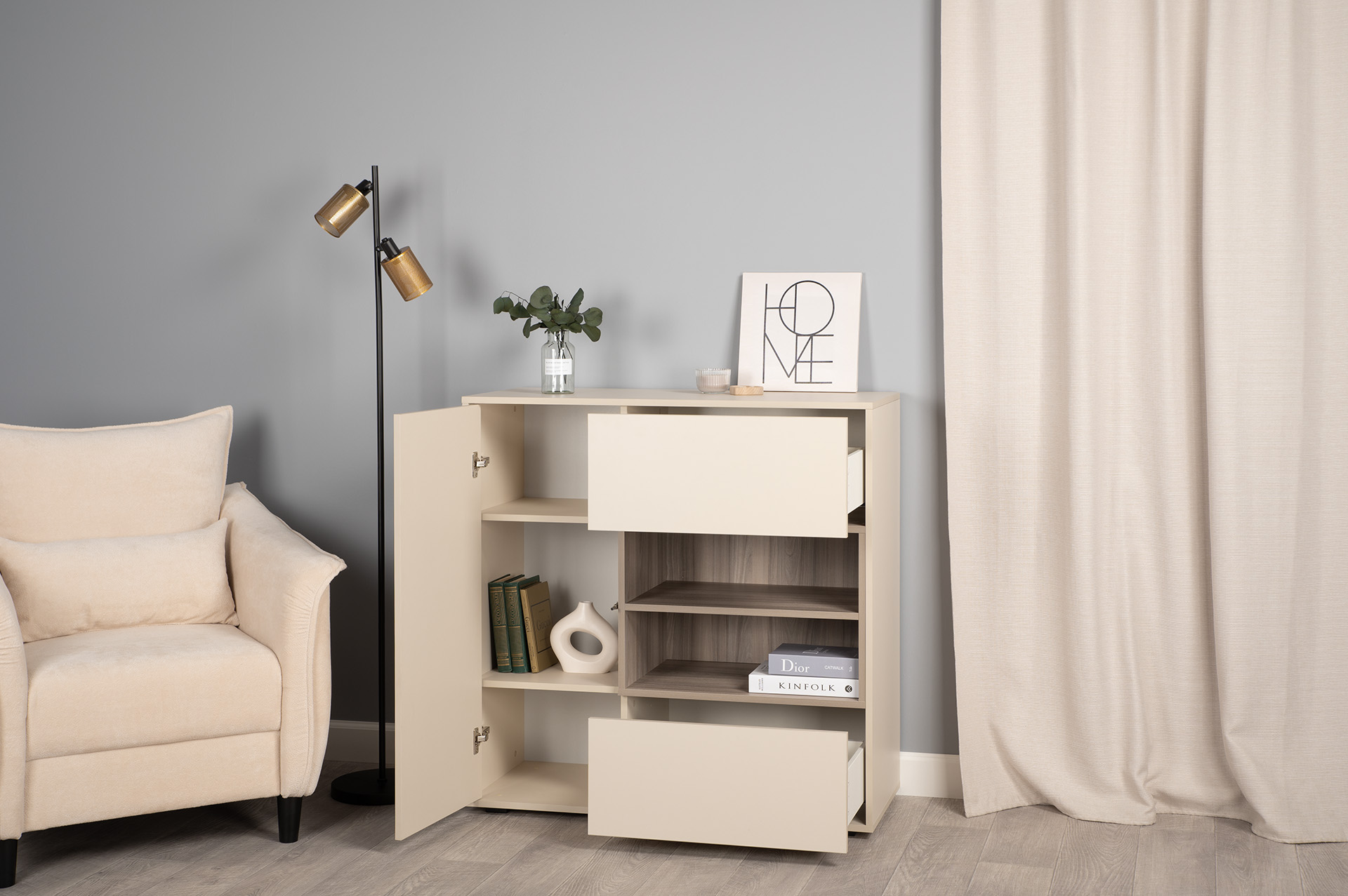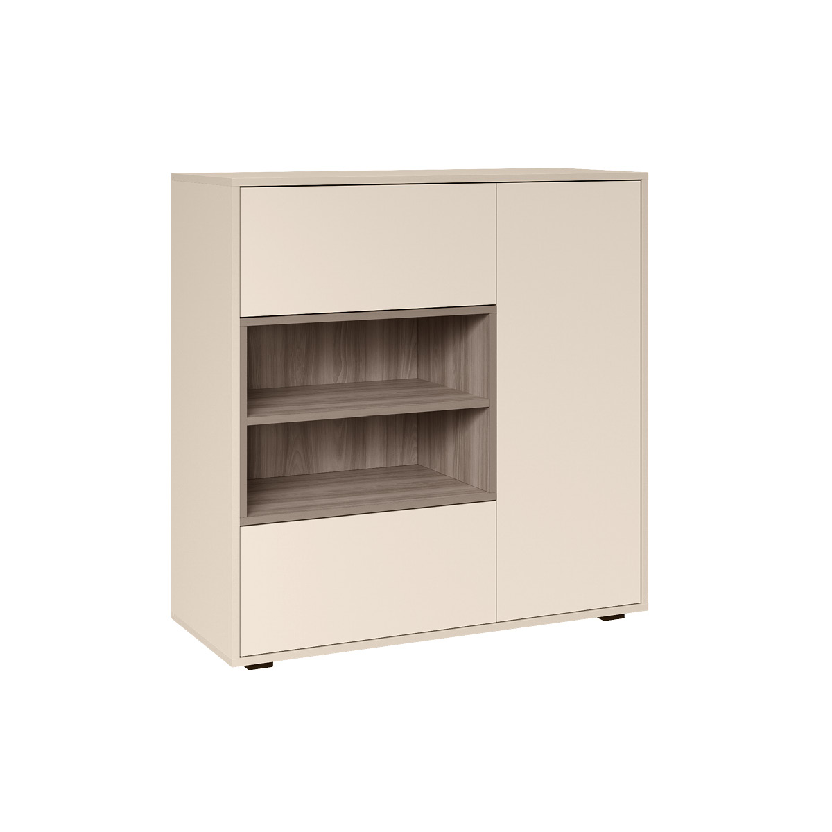 Благодаря нейтральному светлому оттенку и универсальности декора модули можно разместить в спальне, гостиной, прихожей.