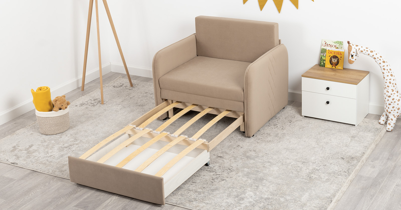 Стильный компактный диван для детской и гостиной. При своих скромных размерах он трансформируется в полноценное спальное место для детей и подростков. Лаконичный дизайн в виде декоративной стежки подчеркивает фактуру велюра, а небольшие размеры позволят разместить его в любом пространстве.