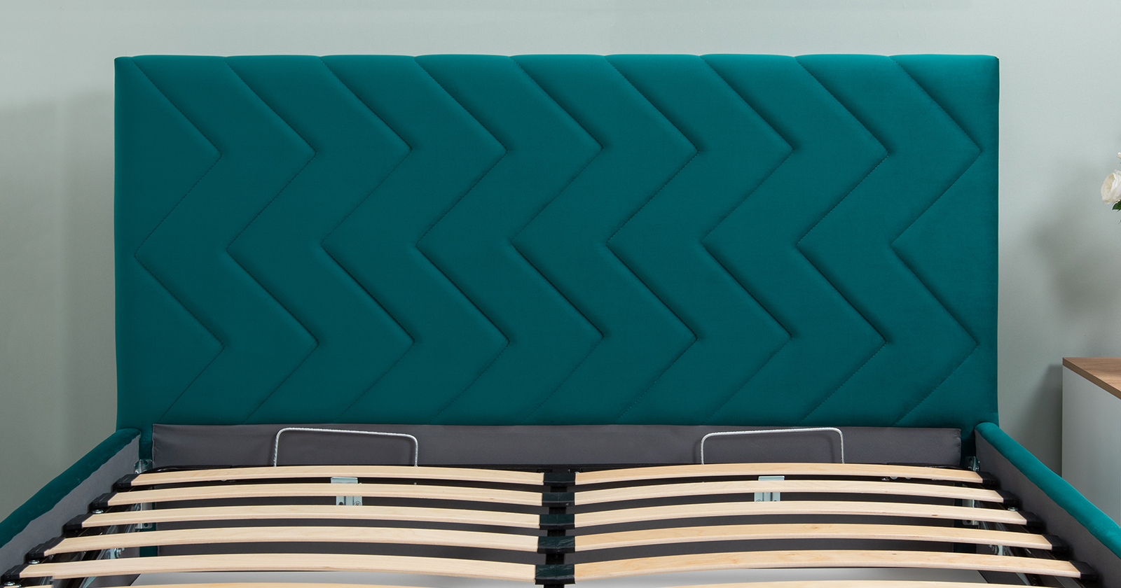 Основание кровати укомплектовано матрасодержателями. Жесткое кроватное дно из ЛДСП 16 мм. Задняя стенка изголовья выполнена в тех. ткани (спанбонд).