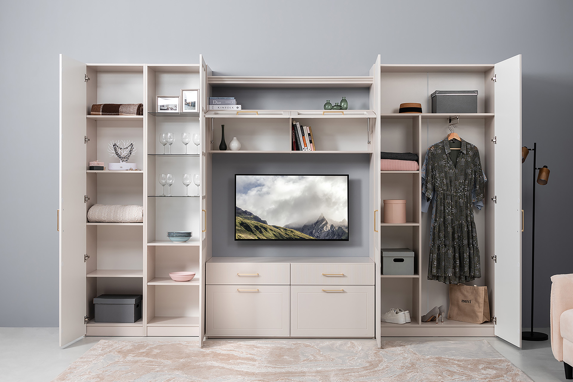 Петли с доводчиками, полное выдвижение ящиков, выдвижная штанга в шкафу для одежды и съемные полки делают использование максимально комфортным.
