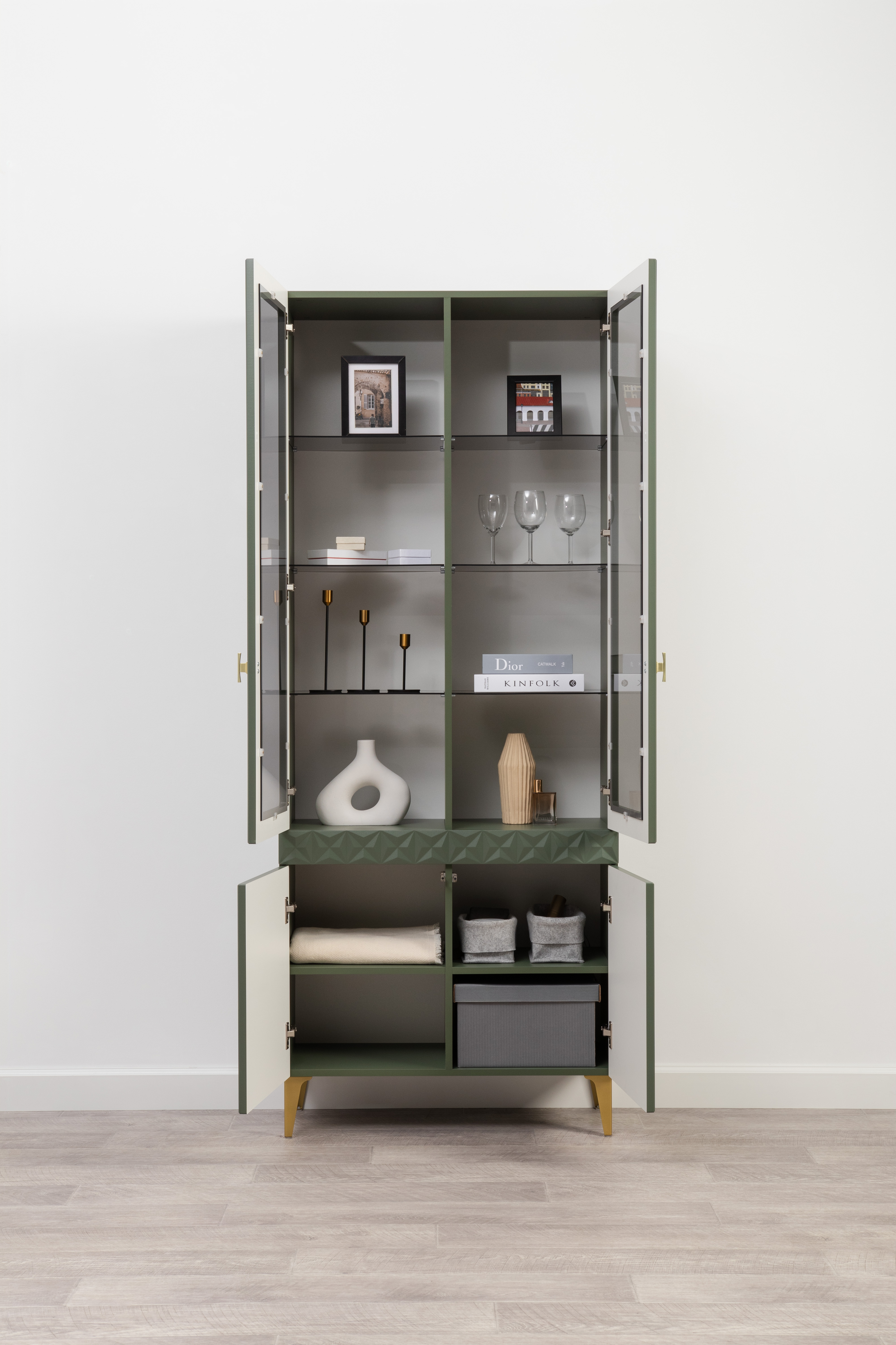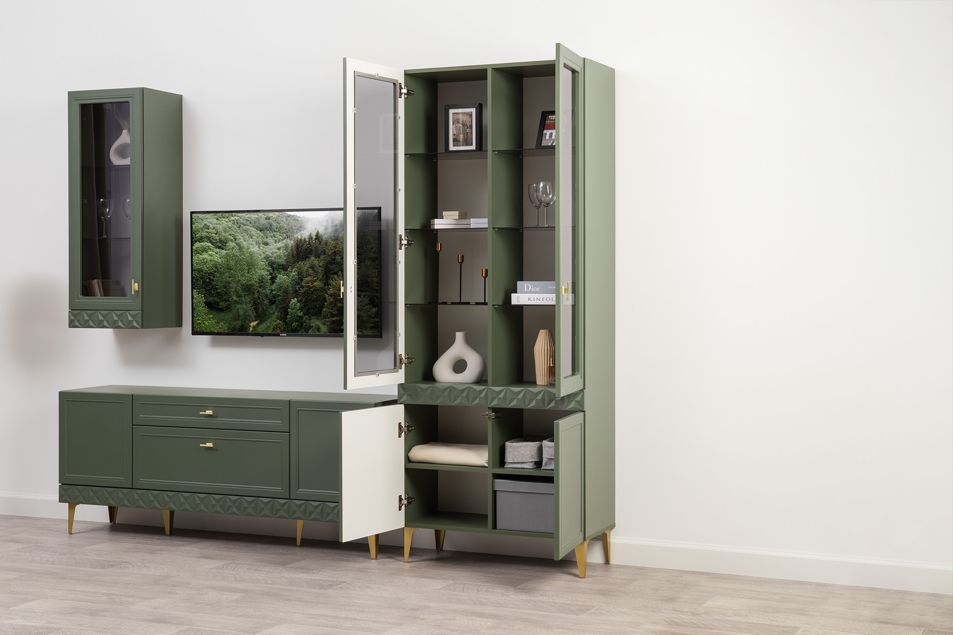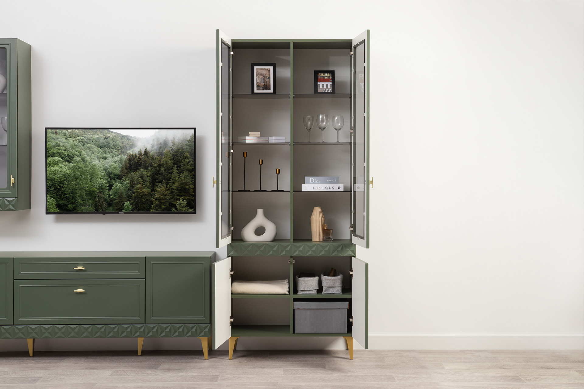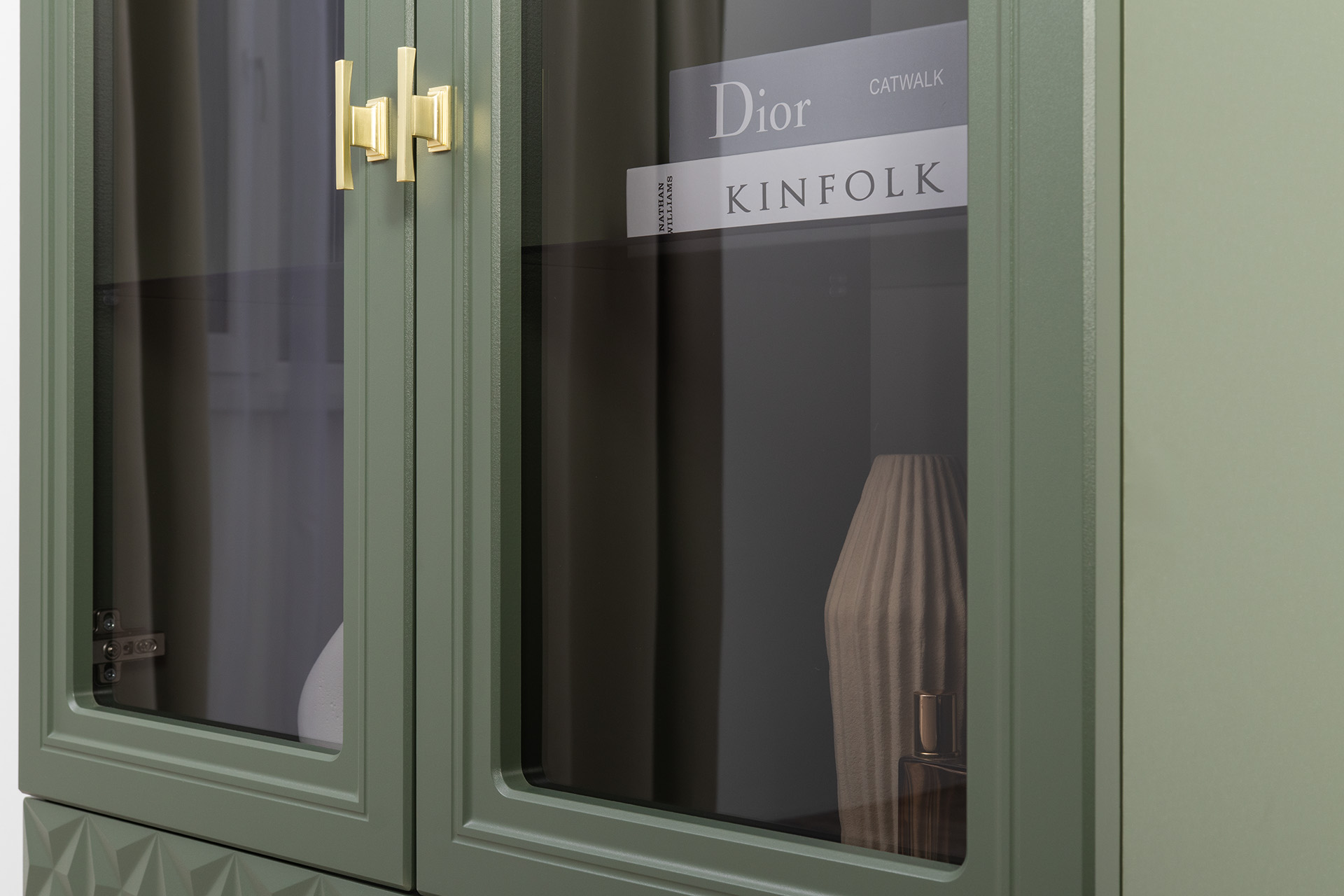Шкаф-витрина Марион 16.397.02 дымчатый зеленый K521, олива шагрень AG 1050 ПВХ (собирается на любую сторону)