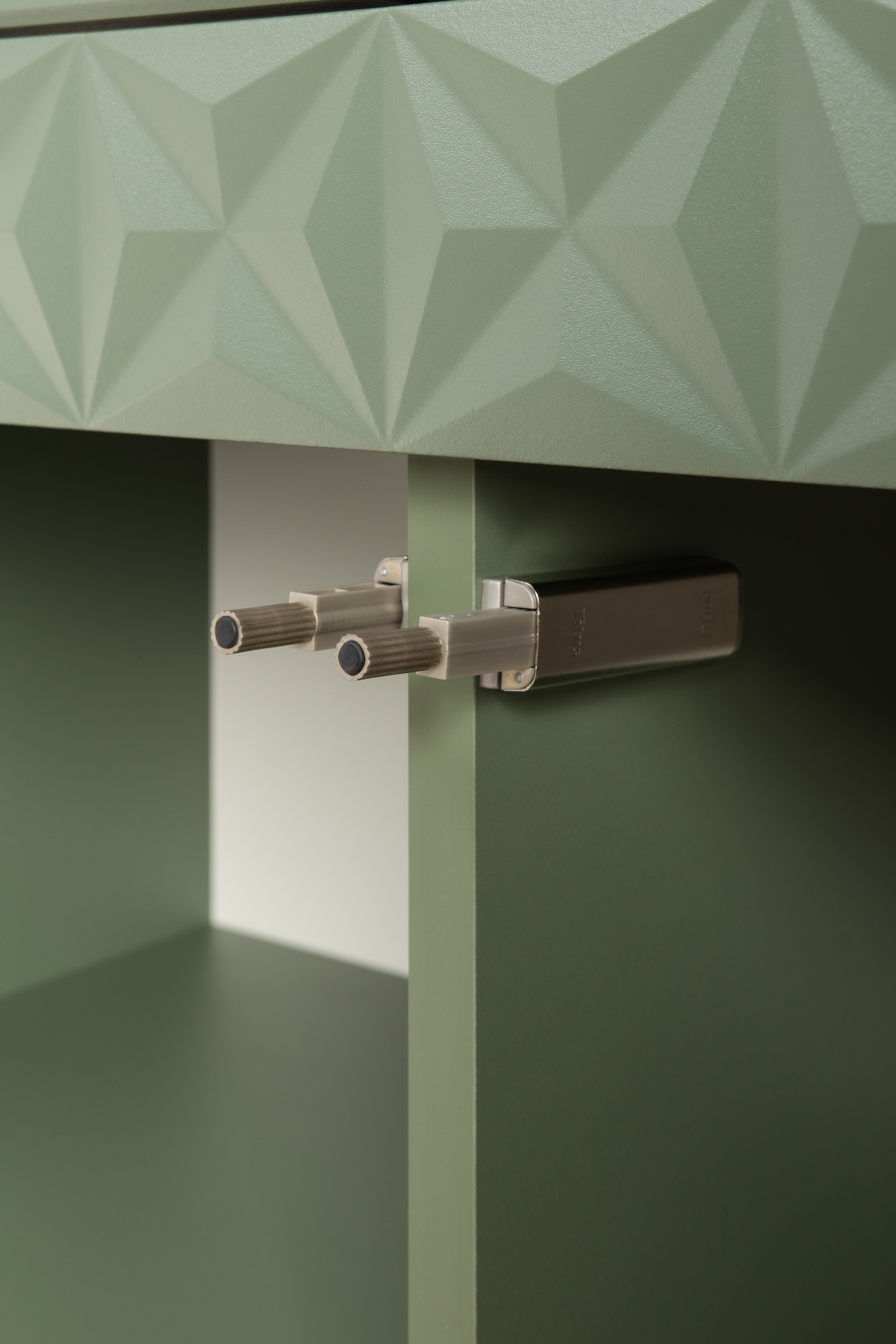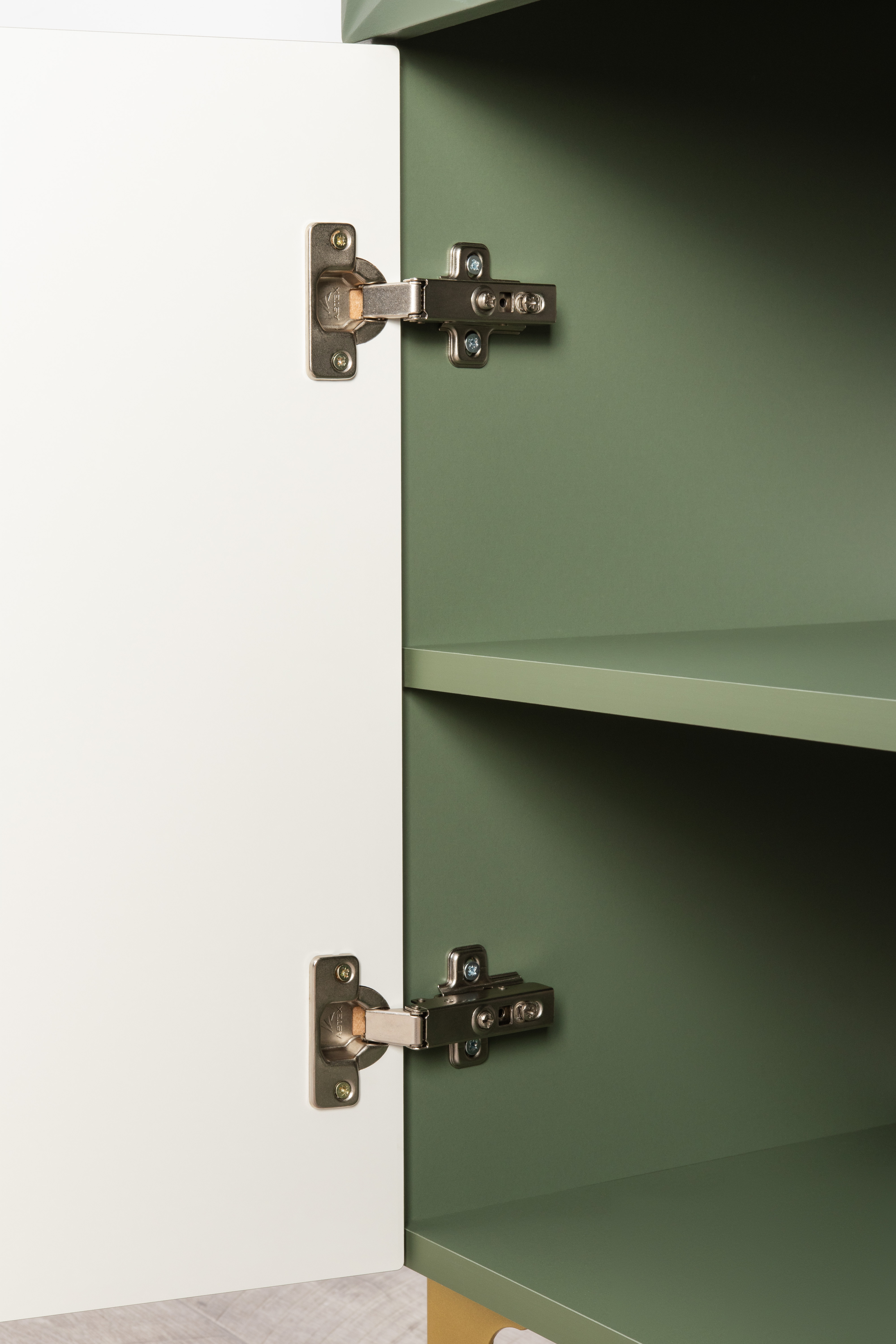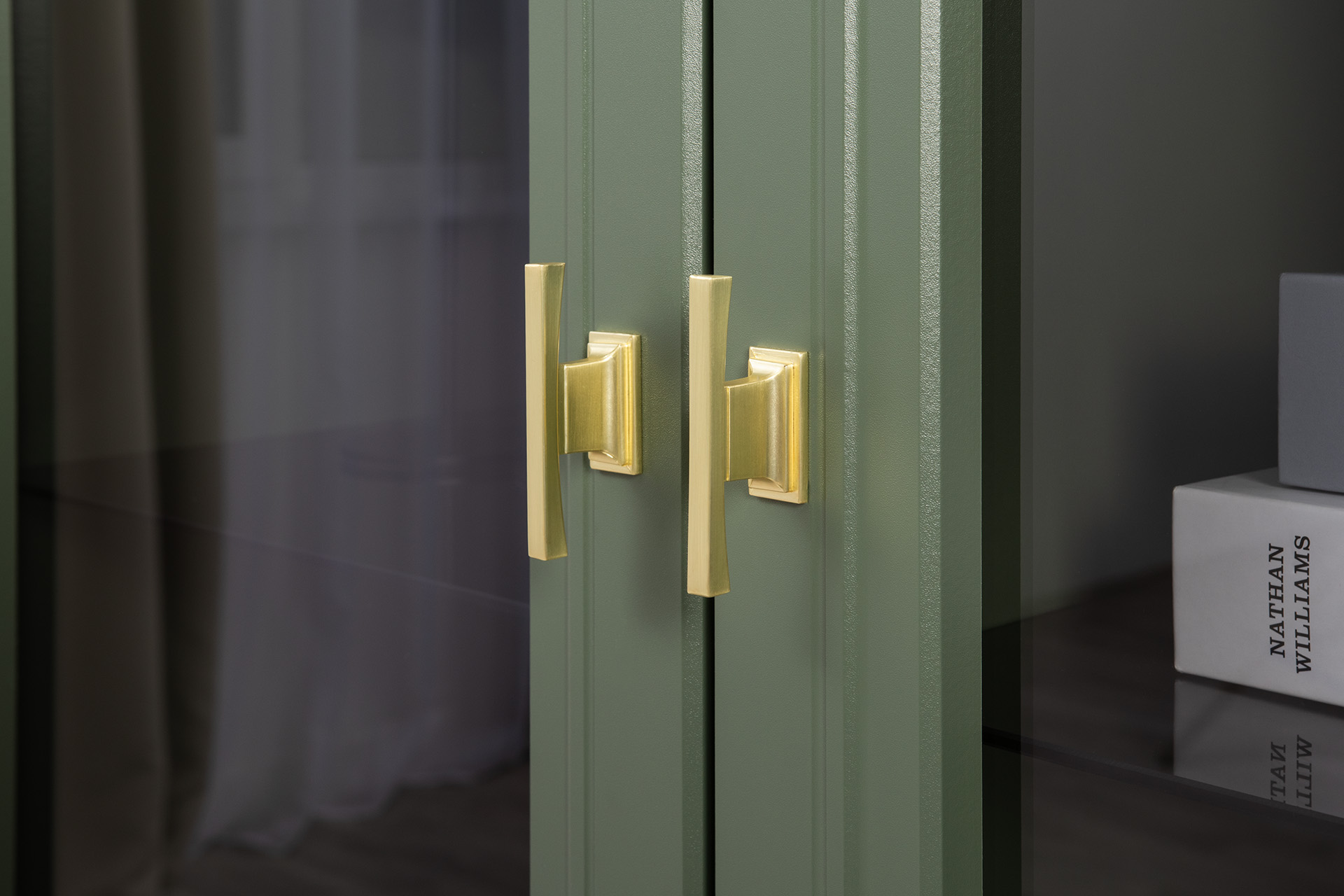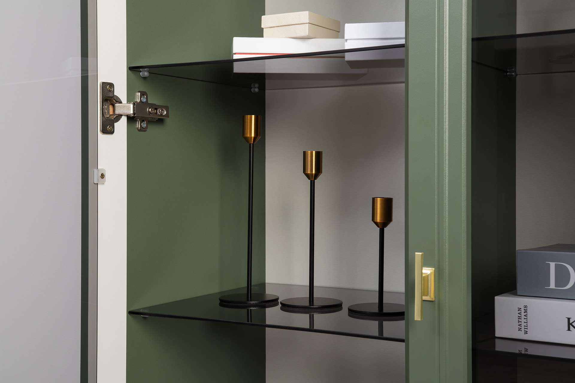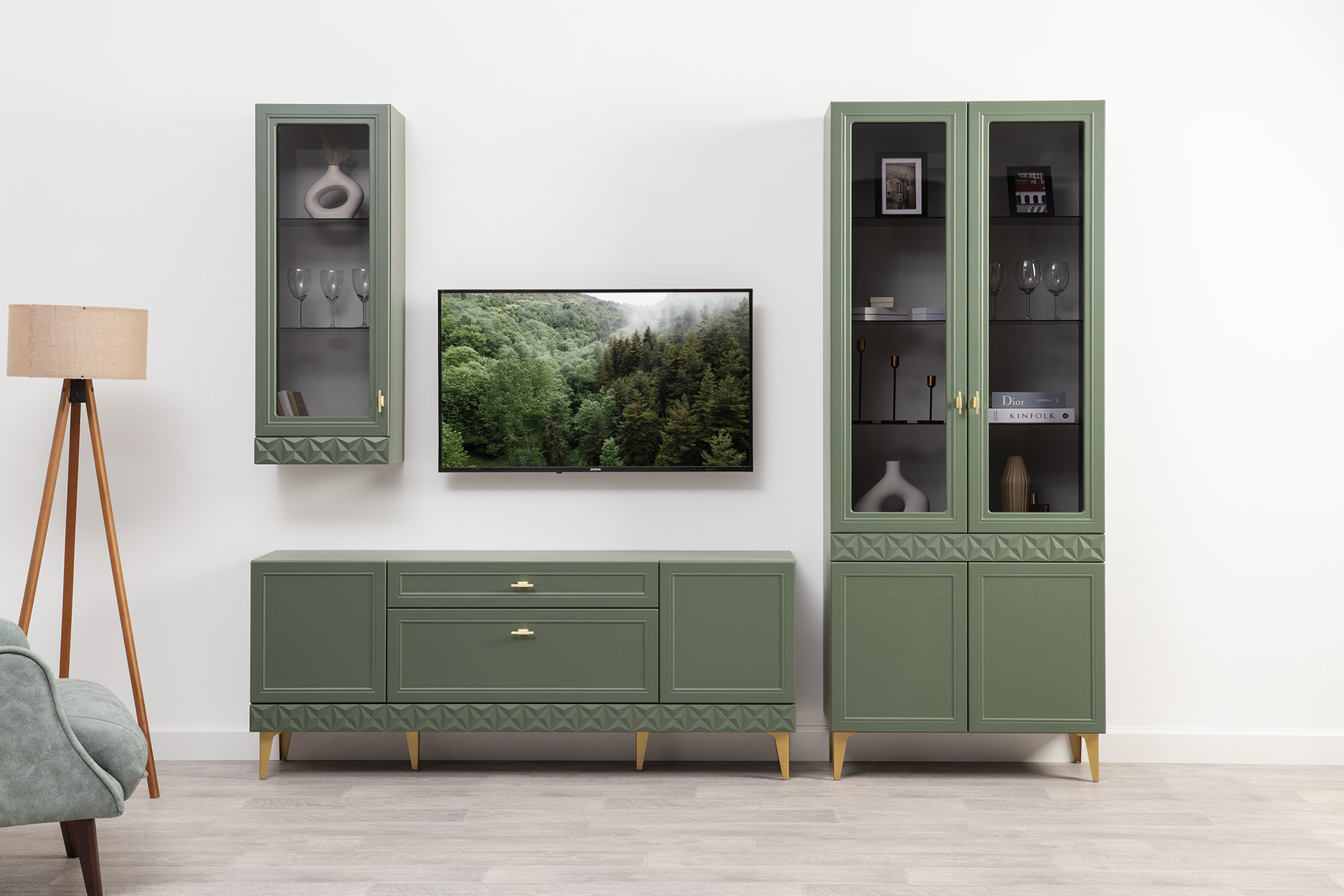 Шкаф-витрина Марион 16.397.02 дымчатый зеленый K521, олива шагрень AG 1050 ПВХ (собирается на любую сторону)
