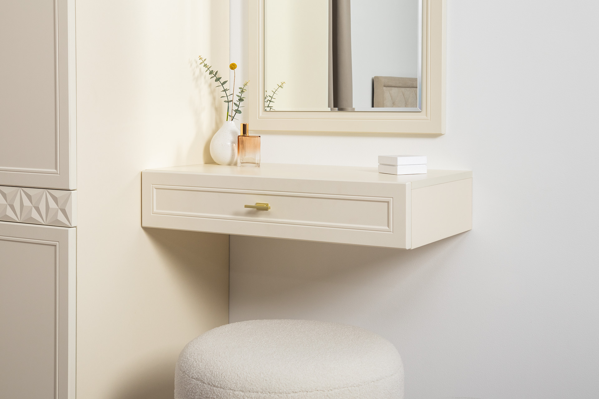 Изящные линии, глубокая фрезеровка фасадов из МДФ и благородные оттенки. Утончённая «Слоновая кость» и изысканная «Олива Шагрень» с глубоким зелёным тоном — создают атмосферу уюта, тепла и благородства. Металлические ручки и опоры золотого цвета придают мебели утончённый блеск, а петли и направляющие с доводчиками обеспечивают плавное и бесшумное закрытие фасадов.
