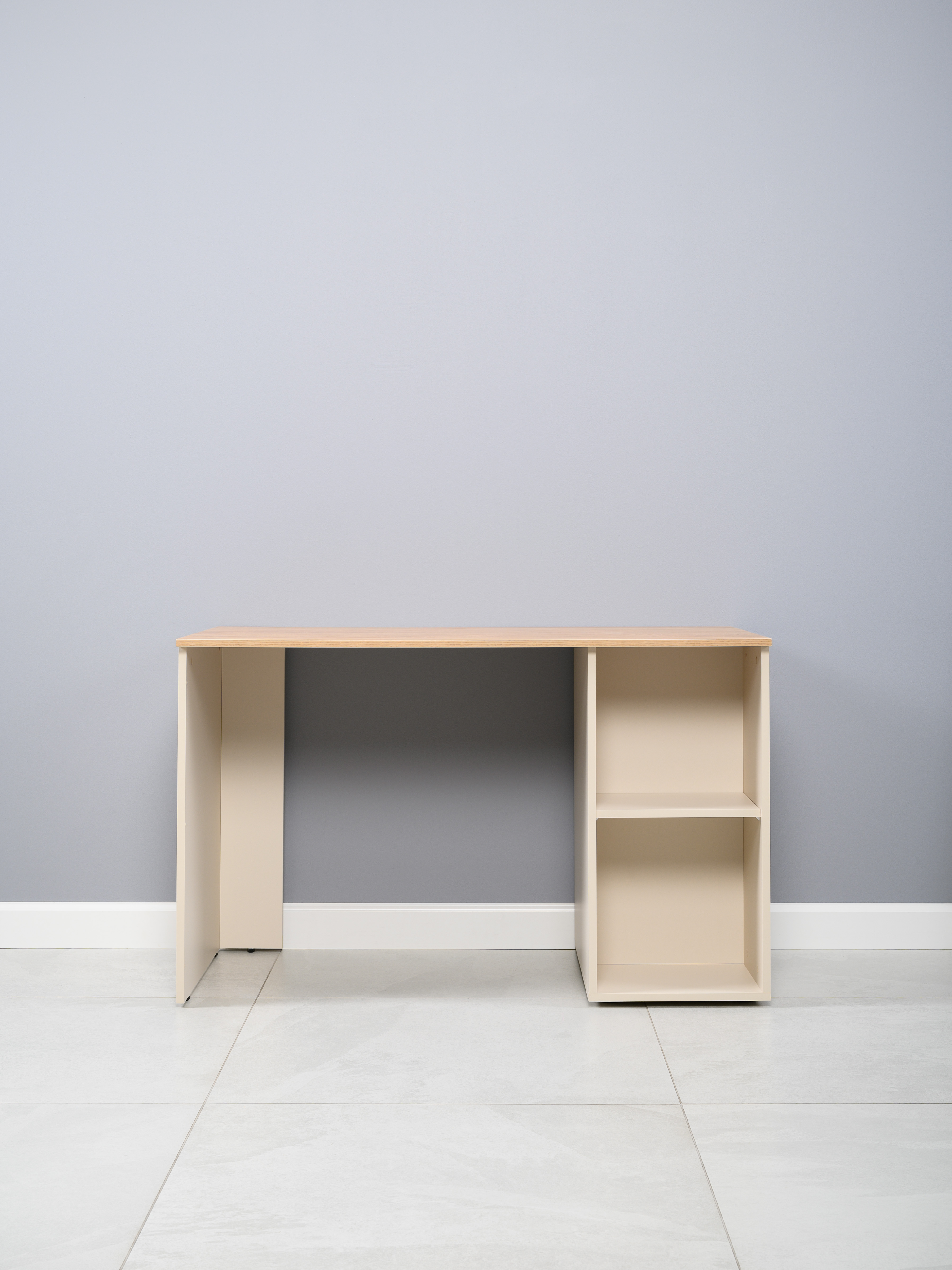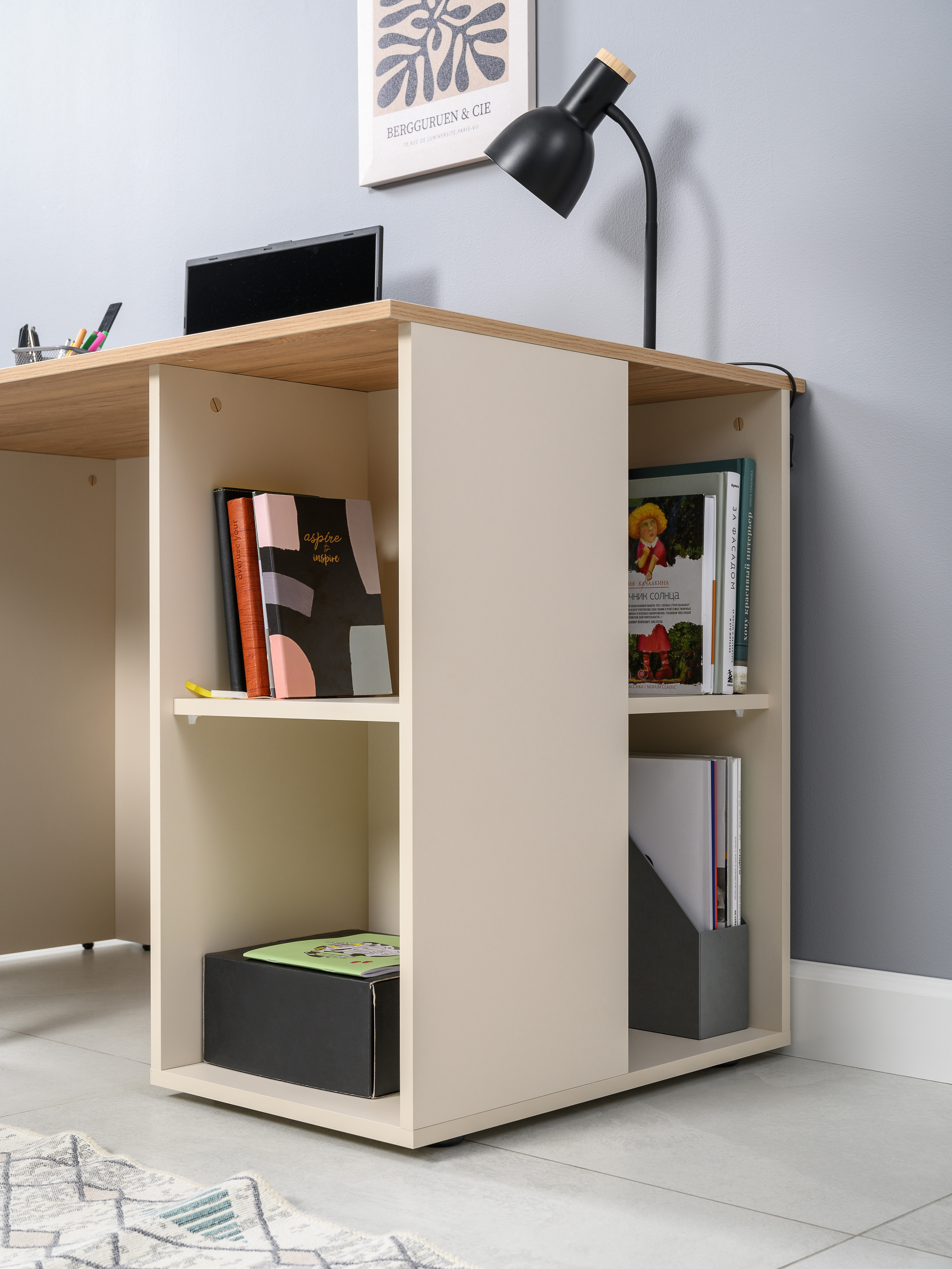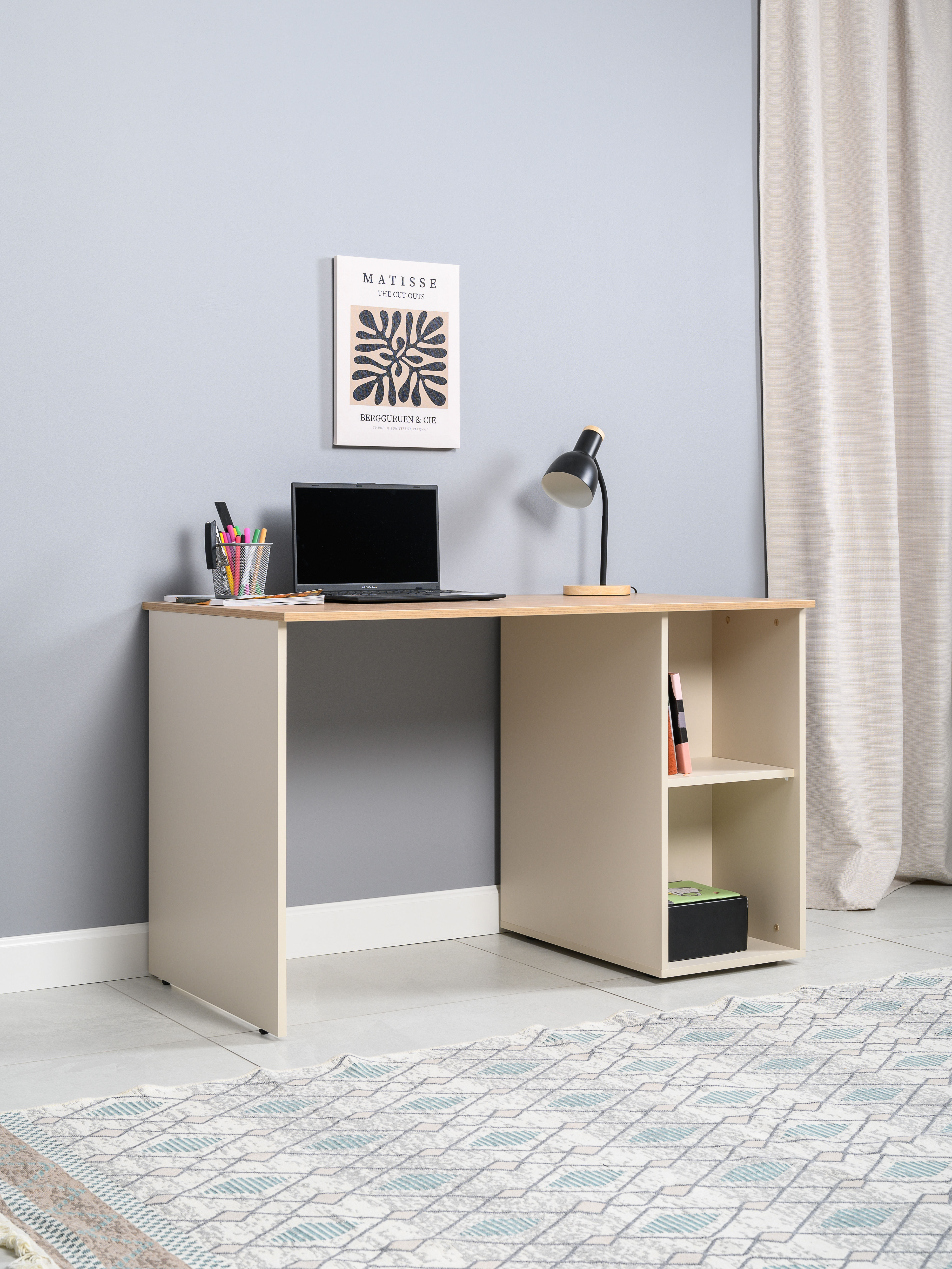 Стол письменный Лайт 12.163 сатин 7045 SU, гикори рокфорд натуральный KO86 PW, сборка на любую сторону, два варианта сборки тумбы