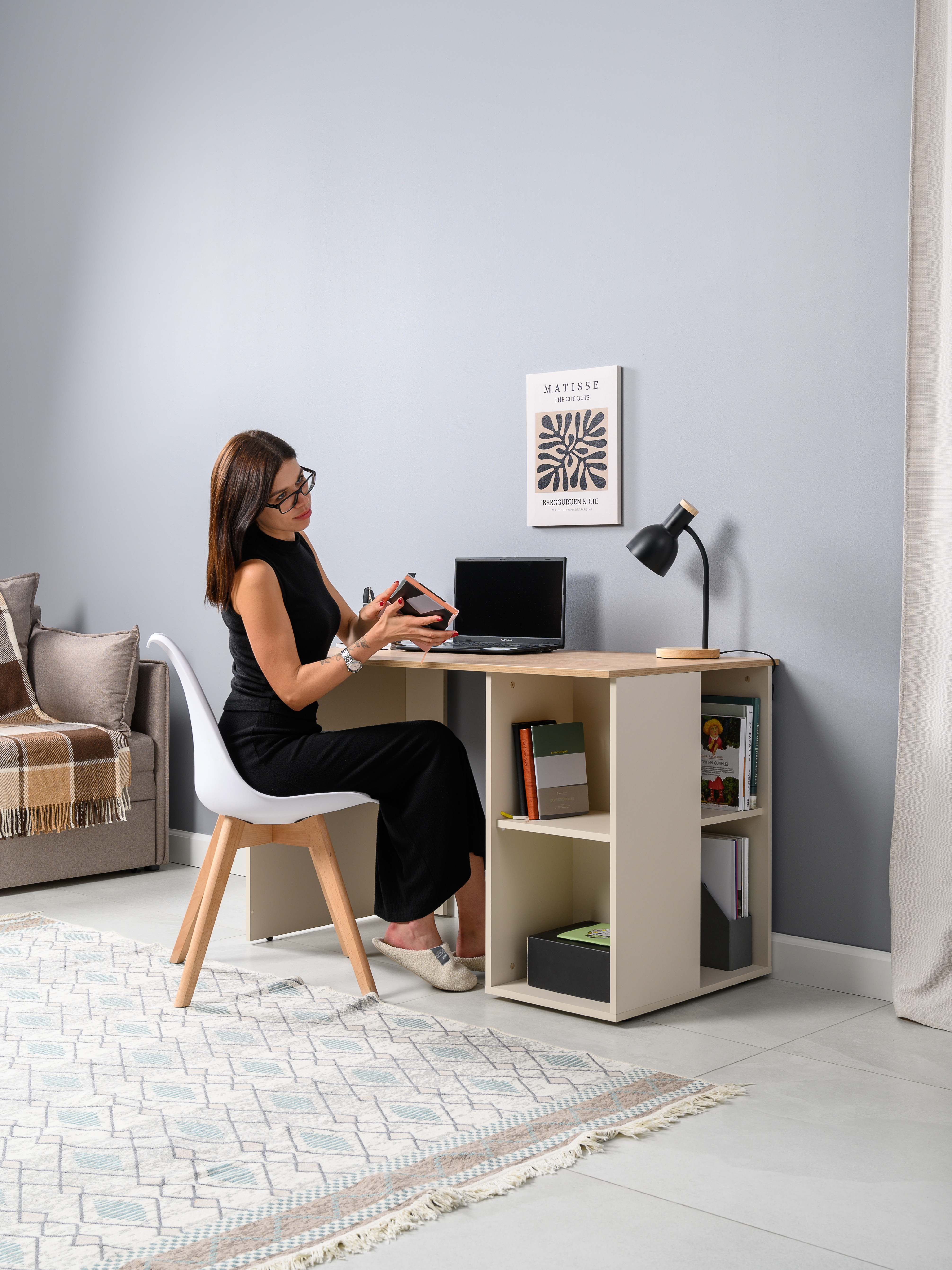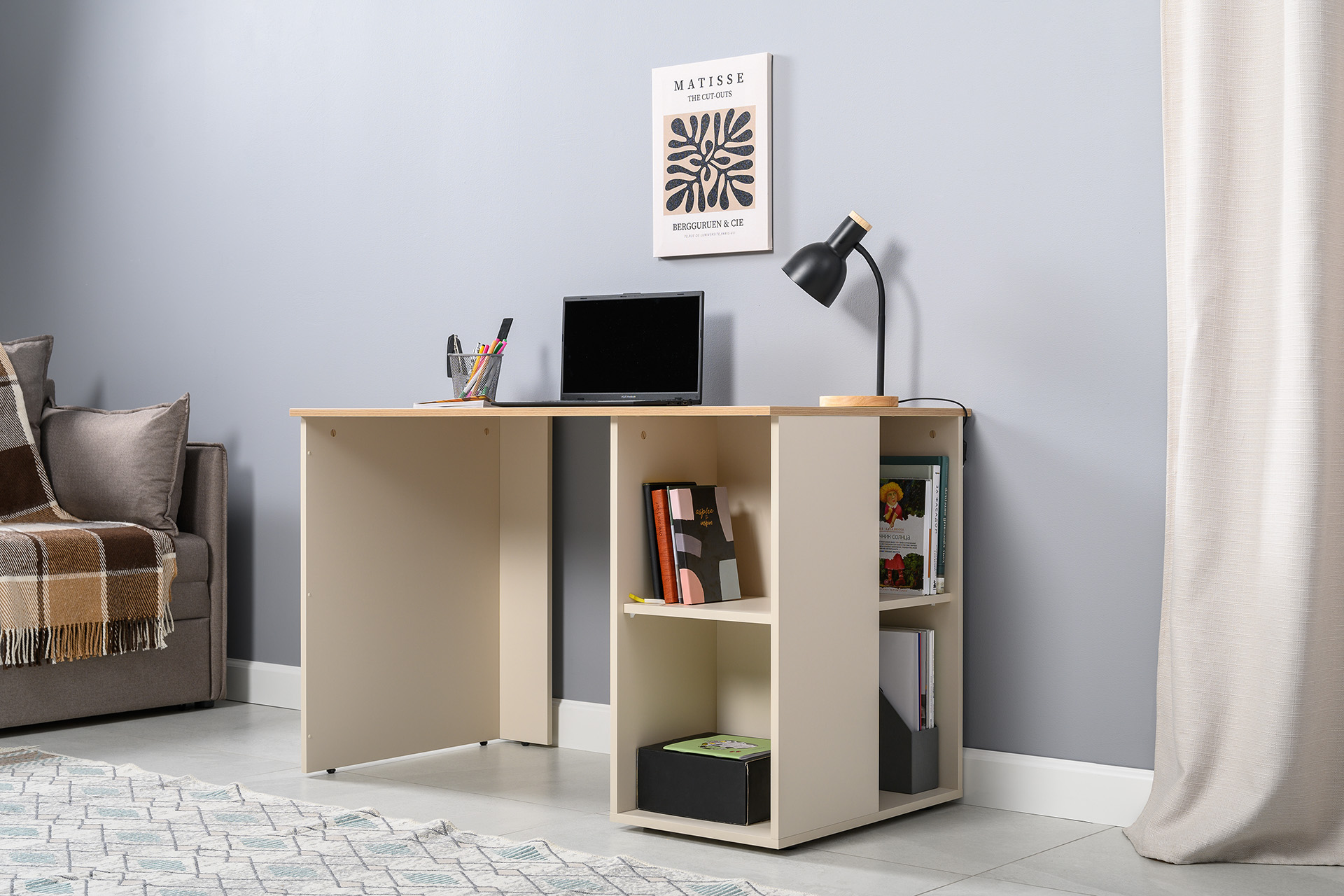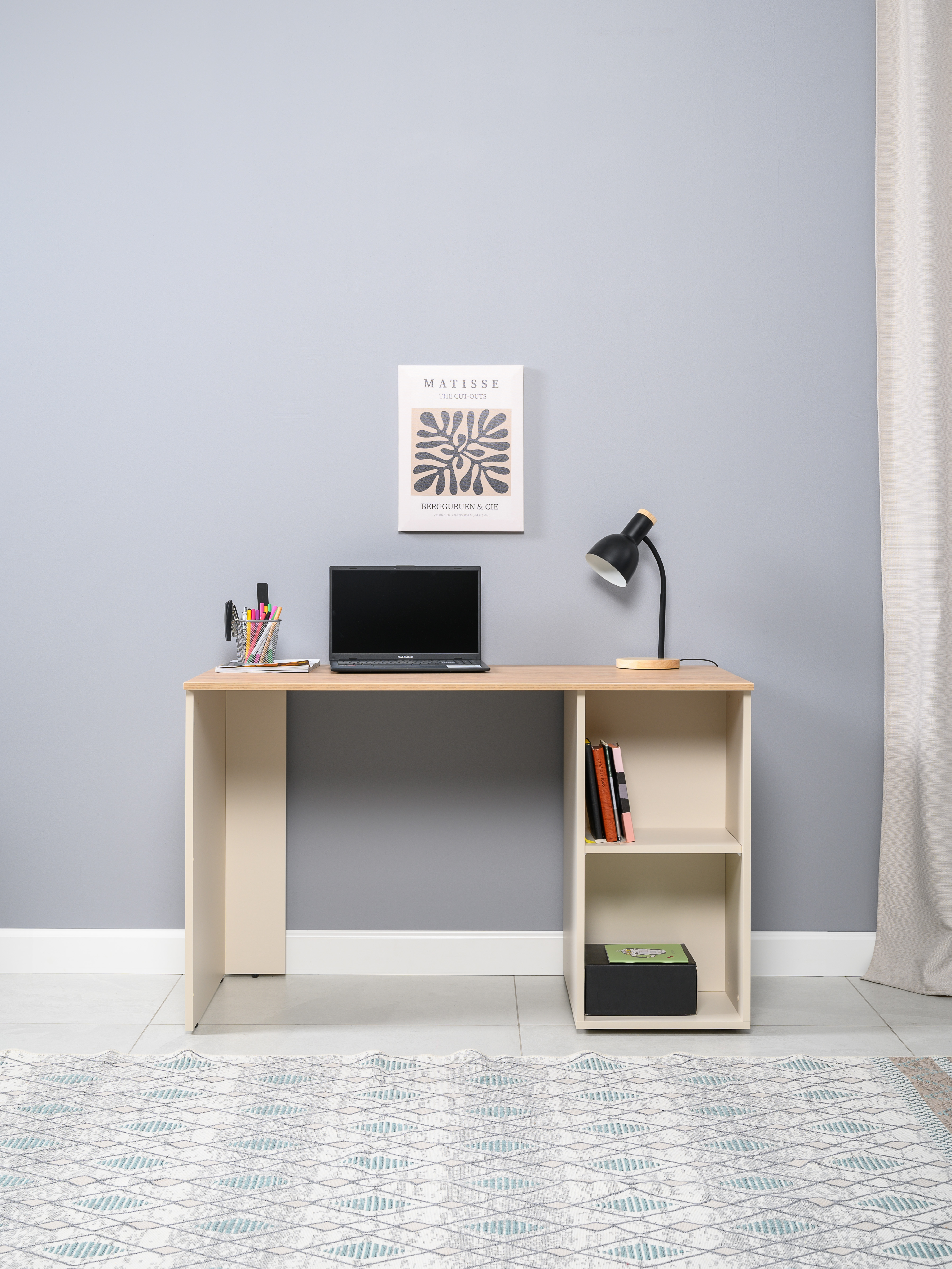 Стол письменный Лайт 12.163 сатин 7045 SU, гикори рокфорд натуральный KO86 PW, сборка на любую сторону, два варианта сборки тумбы